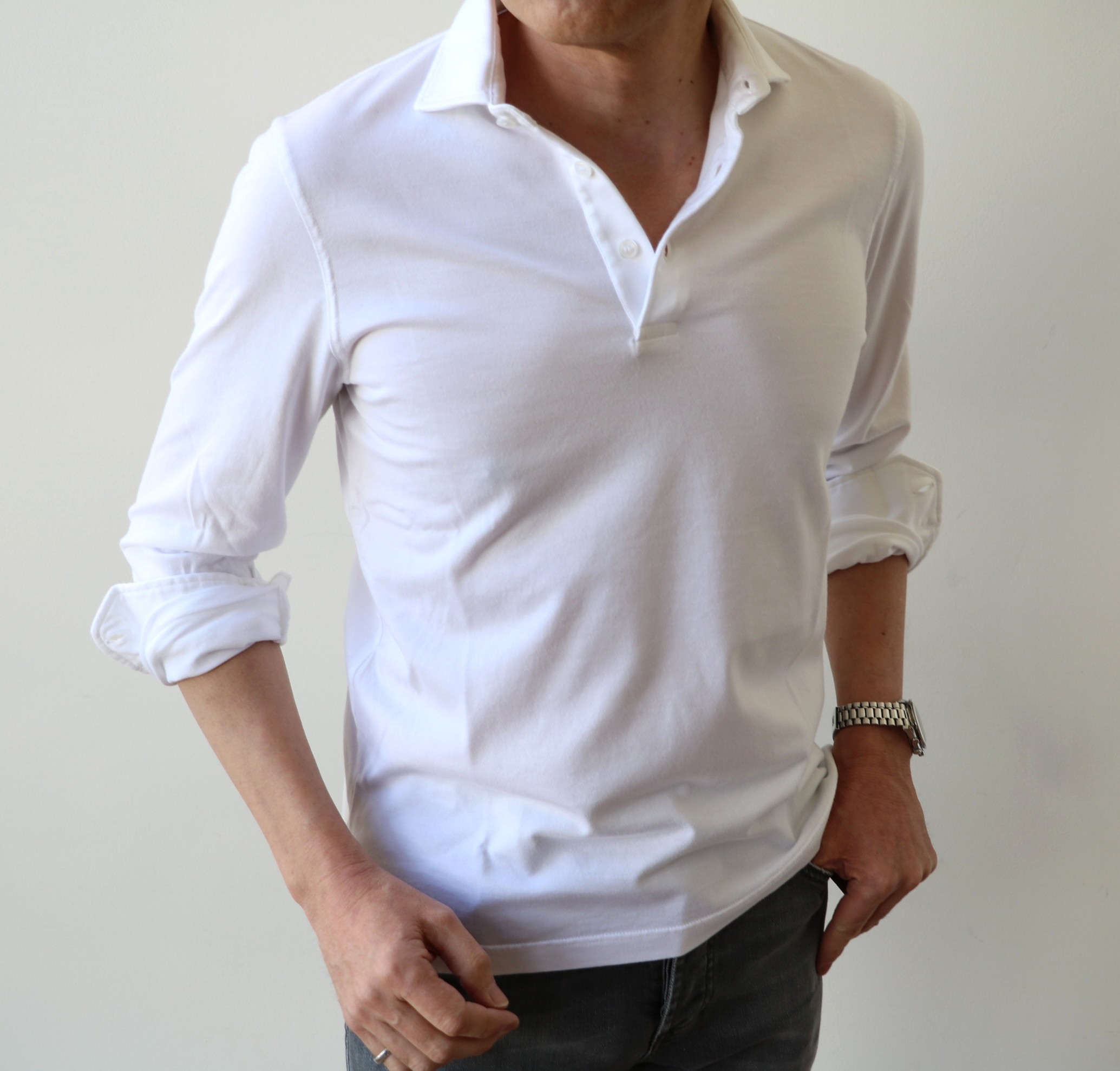 ロングスリーブのポロシャツは、昨年まで、エジプト綿「GIZA45」の鹿の子織でセレクトしておりましたが、今回、同じエジプト綿の「GIZA87オーガニック」に変わりました。素材の変更に伴い、セレクトも鹿の子織から繊細なスムースに。ストレスを感じさせない着心地。そして、とろんとした質感は、ハードなレザーとの抜群の相性をみせます。