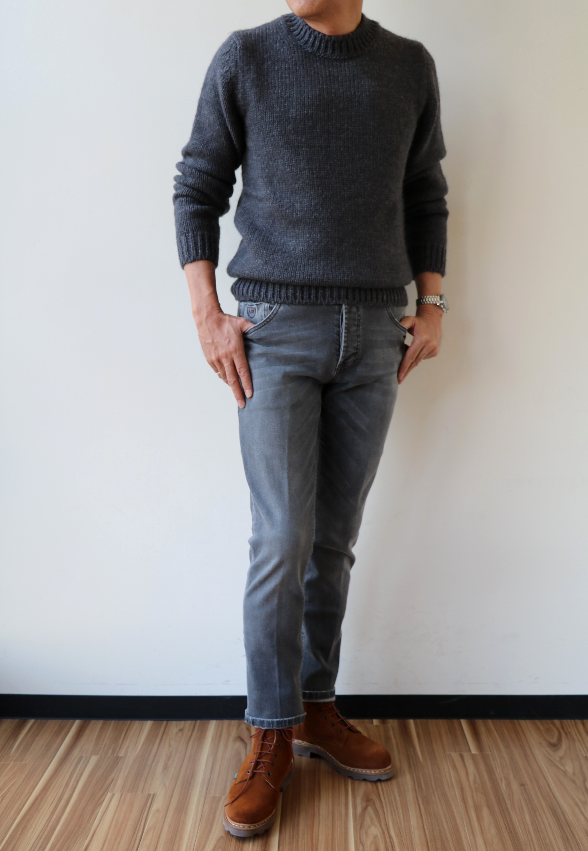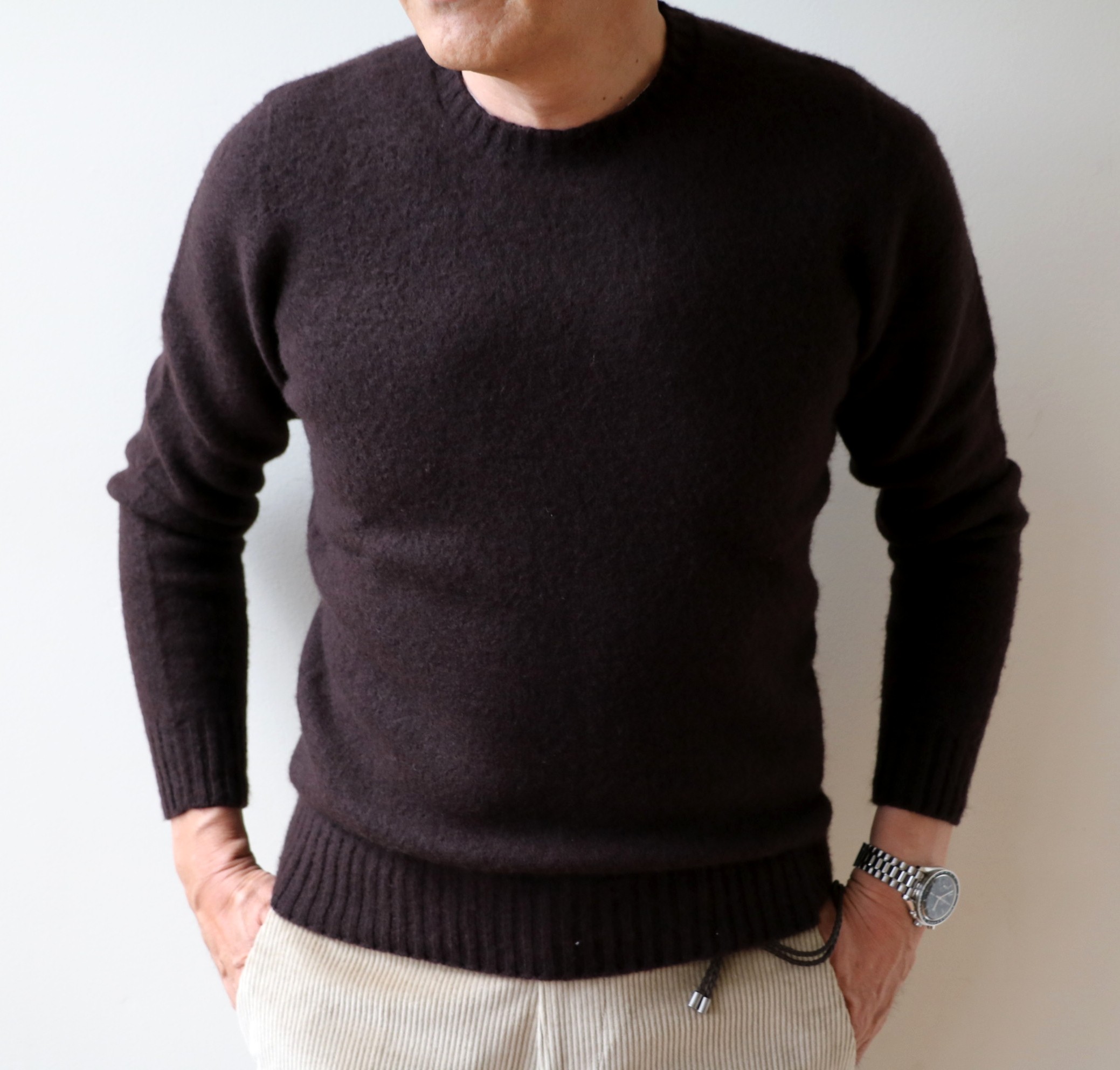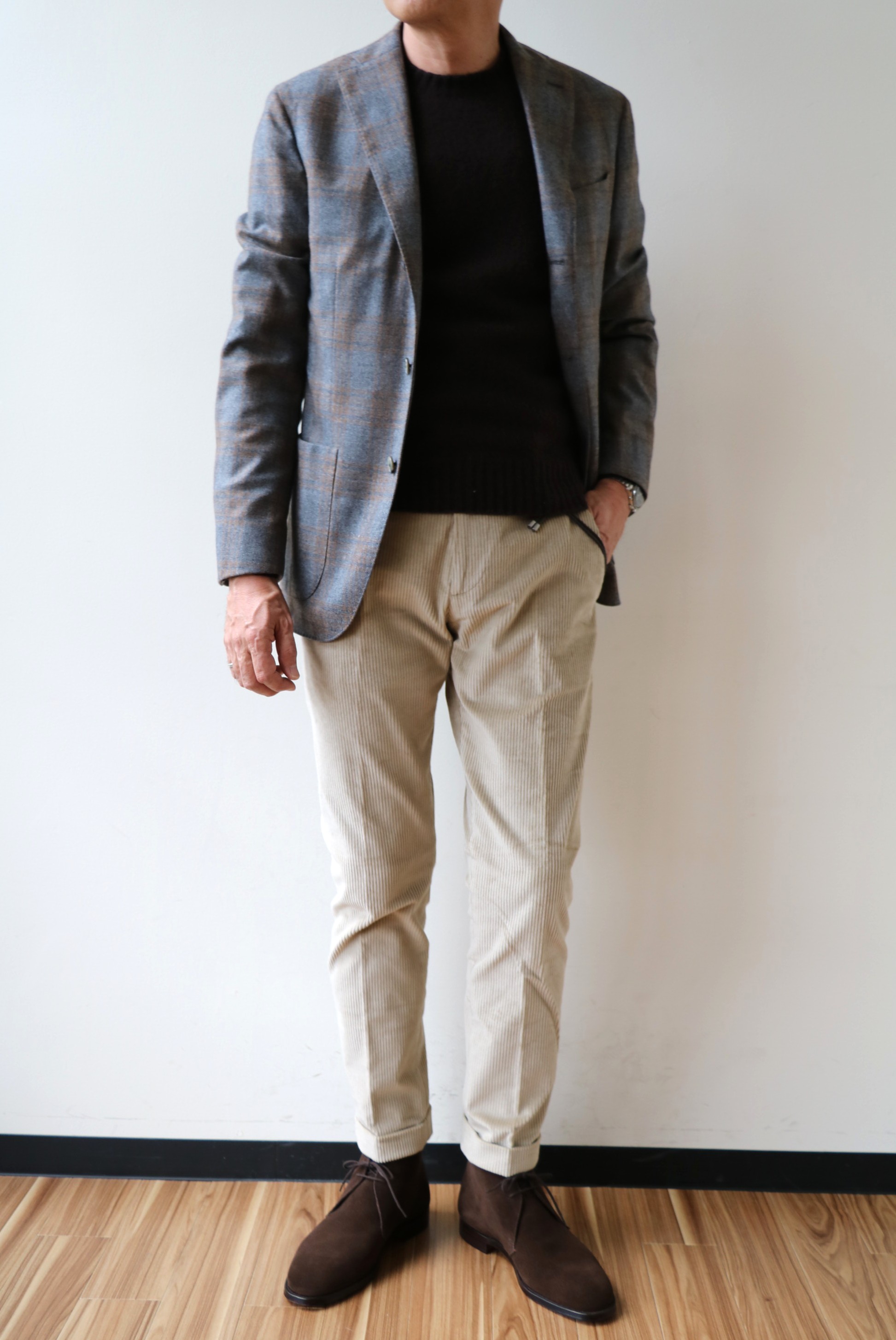 色違いのブラウンのニットは、柔らかなBOGLIOLI(ボリオリ)のジャケットに、この後、ご案内させていただくBERWICH(ベルウイッチ)のコーデュロイを使い、ニットと同色のCROCKETT&JONES(クロケット&ジョーンズ)のチャッカブーツを合わせています。