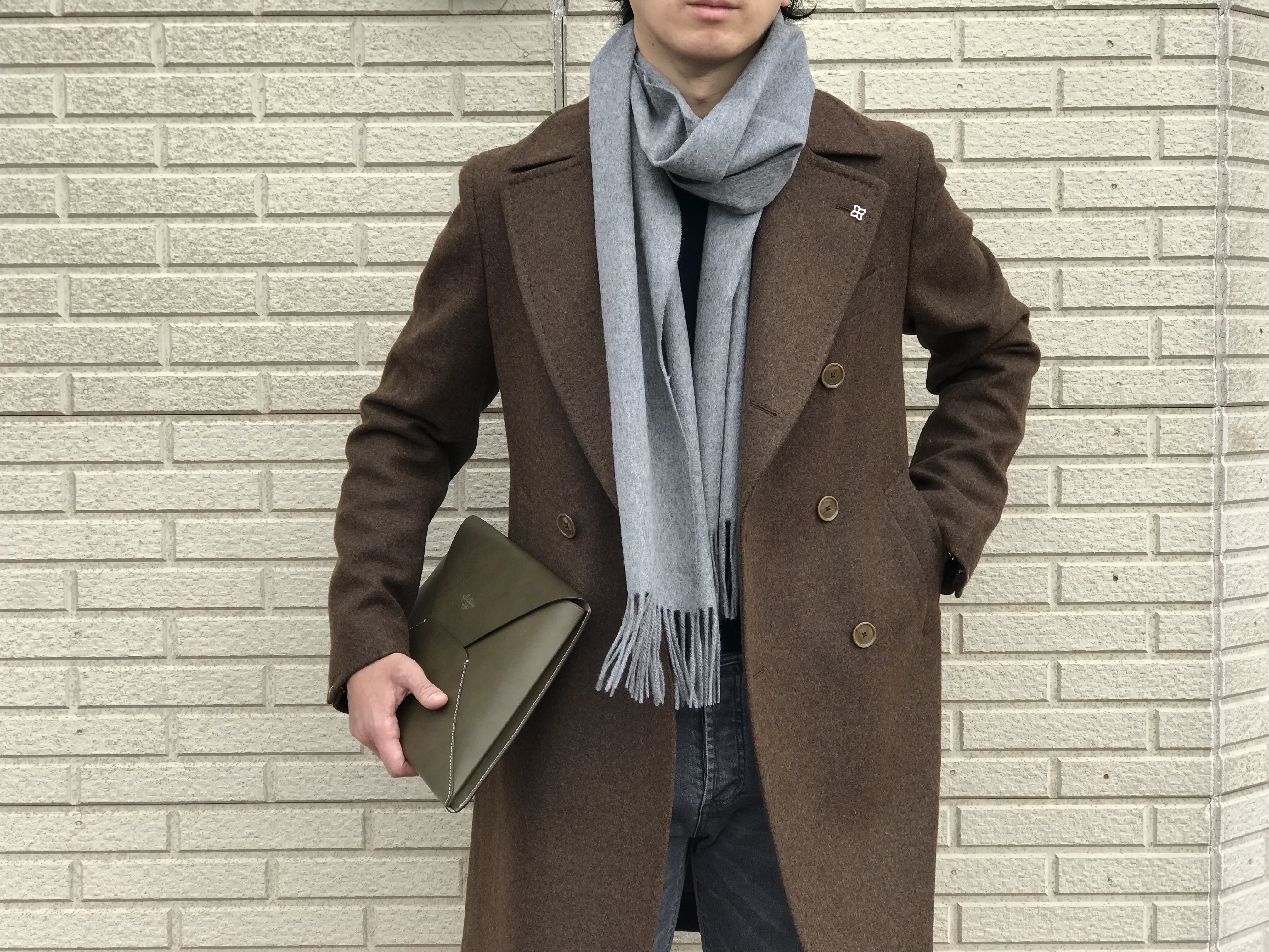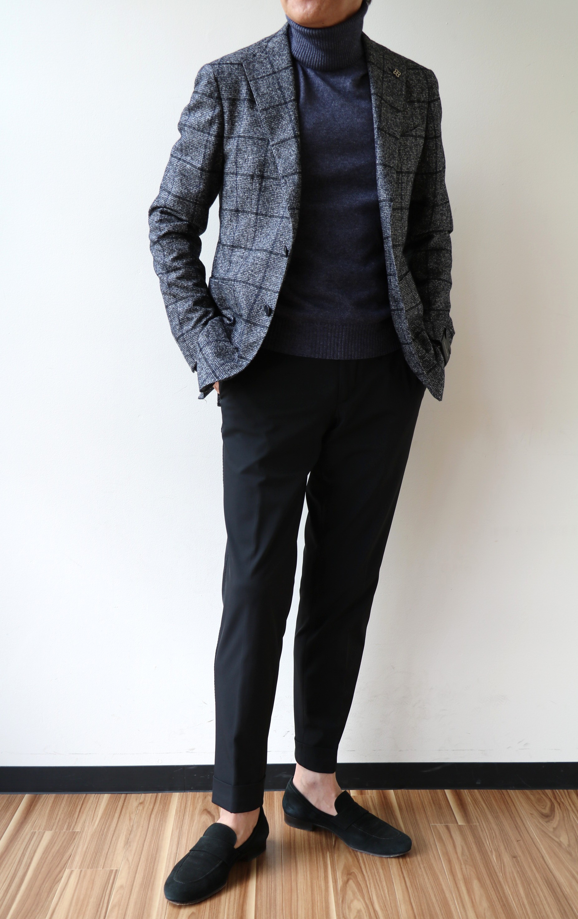 色違いでお求め頂いているファンの方もいらっしゃる人気モデルで、今季のセレクトも、大阪在住T様の熱烈なリクエストも踏まえて実現しました。先日、早速ご来店され、2色ともご満足頂けたようです。因みに、この方は160cm台後半ぐらいの少し小柄な方。ジャケットは44を着用されています。