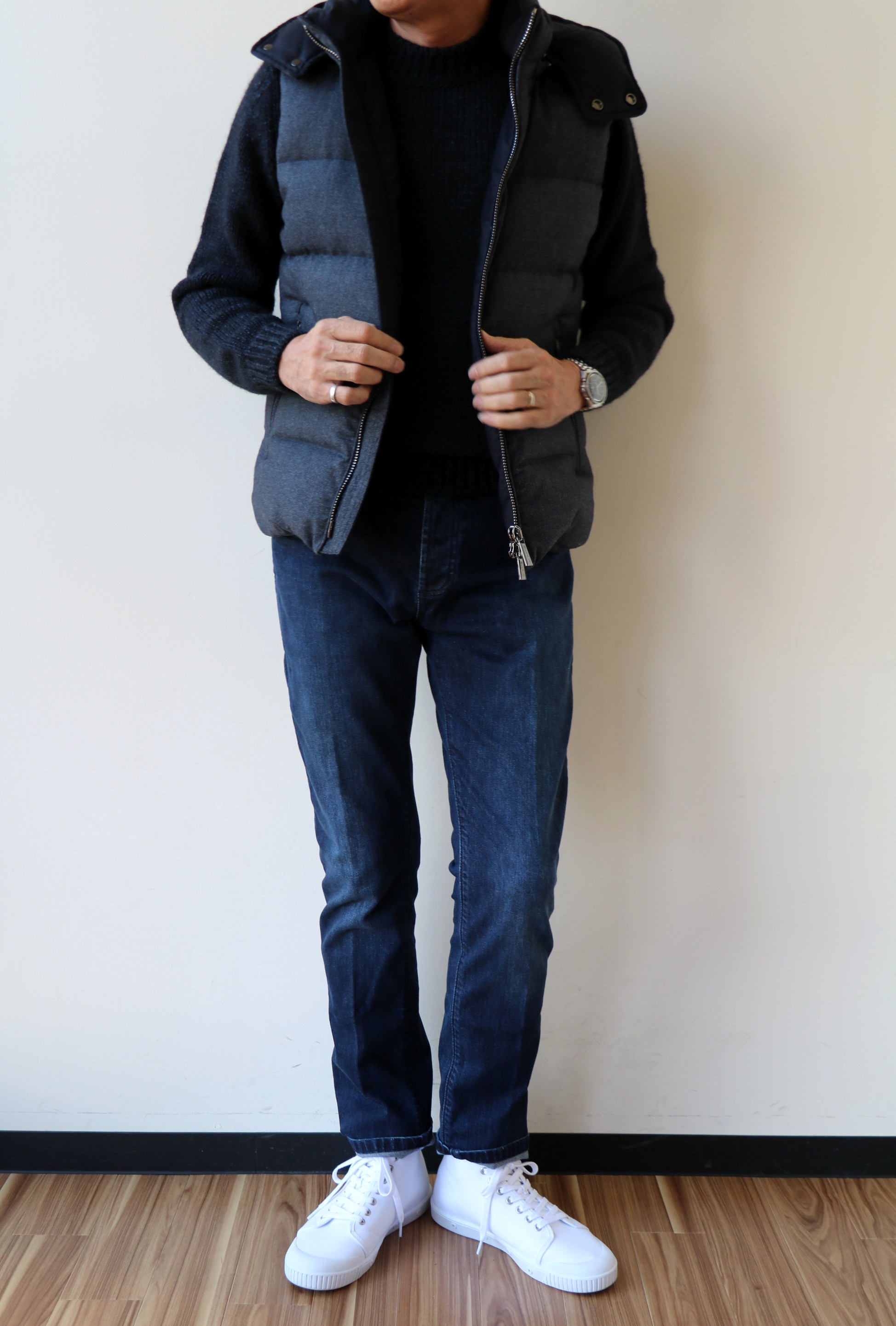グレイで合わせたパンツはRICHARD J. BROWN(リチャードジェイブラウン)、靴はParaboot(パラブーツ)。ネイビーで合わせたダウンベストはMooRER(ムーレー)、パンツはRICHARD J. BROWN(リチャードジェイブラウン)、靴はSpring Court(スプリング コート)です。