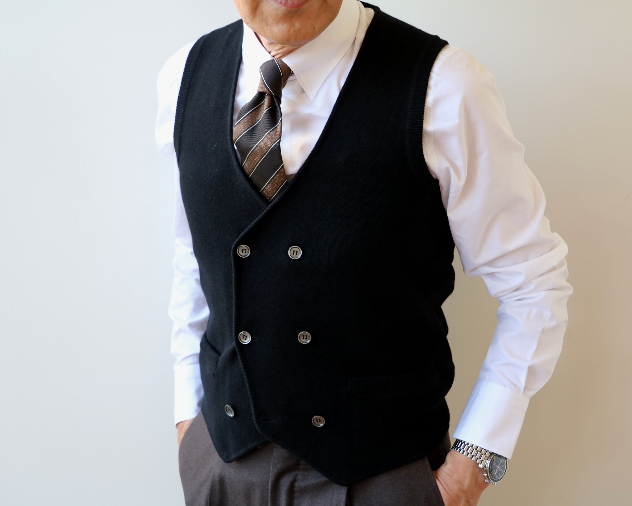 男女ともに最もシンプルなコーディネートと言えば、ブルーデニムと白シャツ(私物)。どちらも、誰もが持っている定番中のマストアイテムですが、素敵に着るとなると、意外に難しい。シンプルなアイテムだけに、普通に着てしまうと、本当に普通になってしまいます。かっこよく着こなすには、素材選びや、着崩しのテクニックが必要となりますが、その話は,またの機会に。丁度、シャツ一枚では肌寒くなった、この季節ならではのご提案をさせていただくならば、プラス1のアイテムとして、ダブルブレストのニットジレを選んでは如何でしょう。どこのかと言えば、私達が大切に取り扱わせていただいている【Settefili Cashmere/セッテフィーリ カシミア】です。