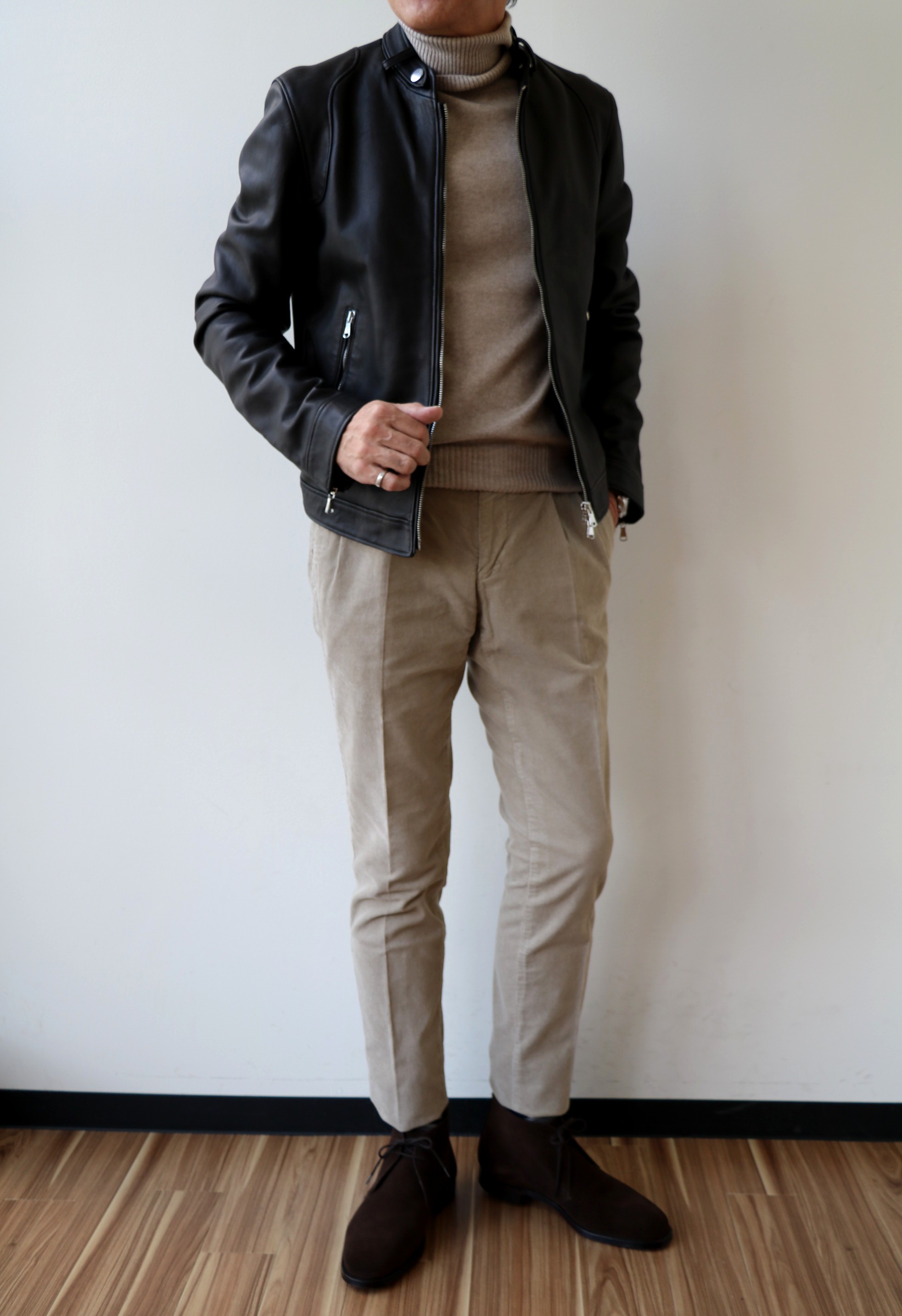 ベージュで合わせたレザーブルゾンはRadice(ラディーチェ)、パンツは未公開のVIGANO(ヴィガーノ)、靴はCROCKETT&JONES(クロケット&ジョーンズ)。デニムブルーで合わせたジャケットはTAGLIATORE(タリアトーレ)、パンツは最終入荷となったBorelio(ボレリオ)、靴は私物のFERRANTE(フェランテ)です。