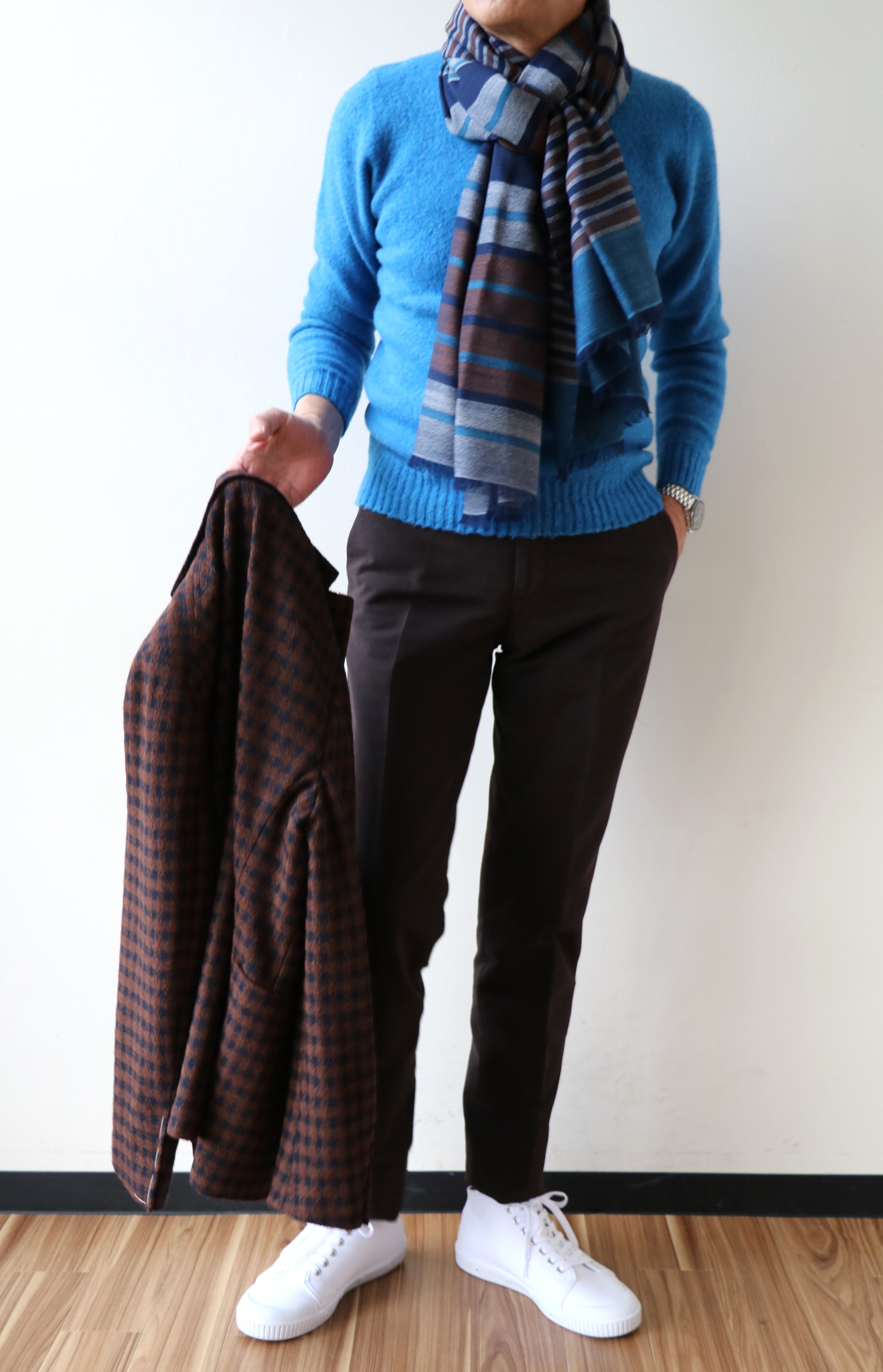 2日に亘る「スローウェア」グループのご紹介。INCOTEX(インコテックス)の「ガーメントダイ加工ストレッチコットンパンツ」を機軸に組み合わせてみました。ニットは、本日ご案内の【Drumohr/ドルモア】。巻いたのはFRANCO BASSI(フランコ バッシ)のストール。足元はSPRING COURT(スプリング コート)、手に持ったジャケットはTAGLIATORE(タリアトーレ)です。アズーロ・エ・マローネの定番スタイルです。
