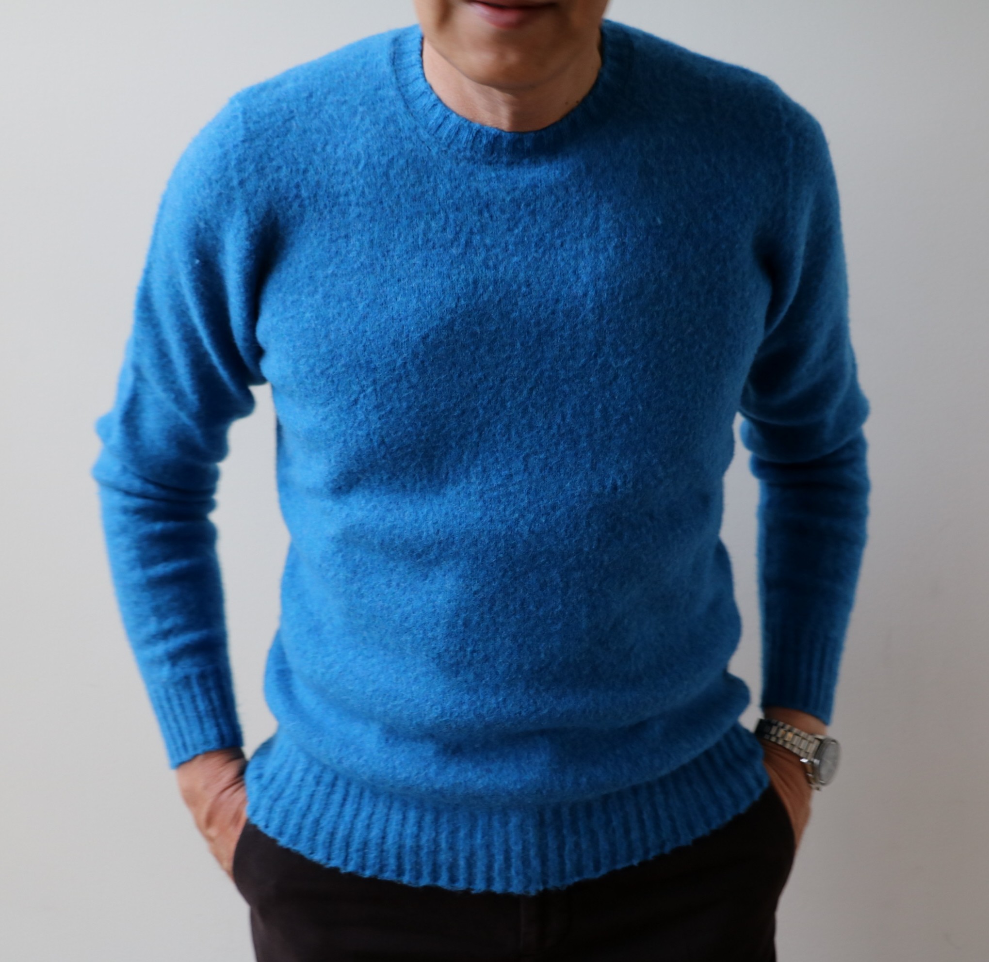 MEN'S EXをくまなく愛読されている方ならご存知でしょう。150、151ページに掲載されえいる【Drumohr/ドルモア】のニット。中でも、展示会で目を引いたのが、シャギー感を楽しめる、こちらのスーパージーロンのシェットランドセーター。シャギーとは、毛足の長い織物のことを言います。秋冬の暗くなりがちなコーディネートに彩を魅せるコバルトブルー。秋冬のイメージを最も連想させるダークブラウンの2色をセレクトしております。