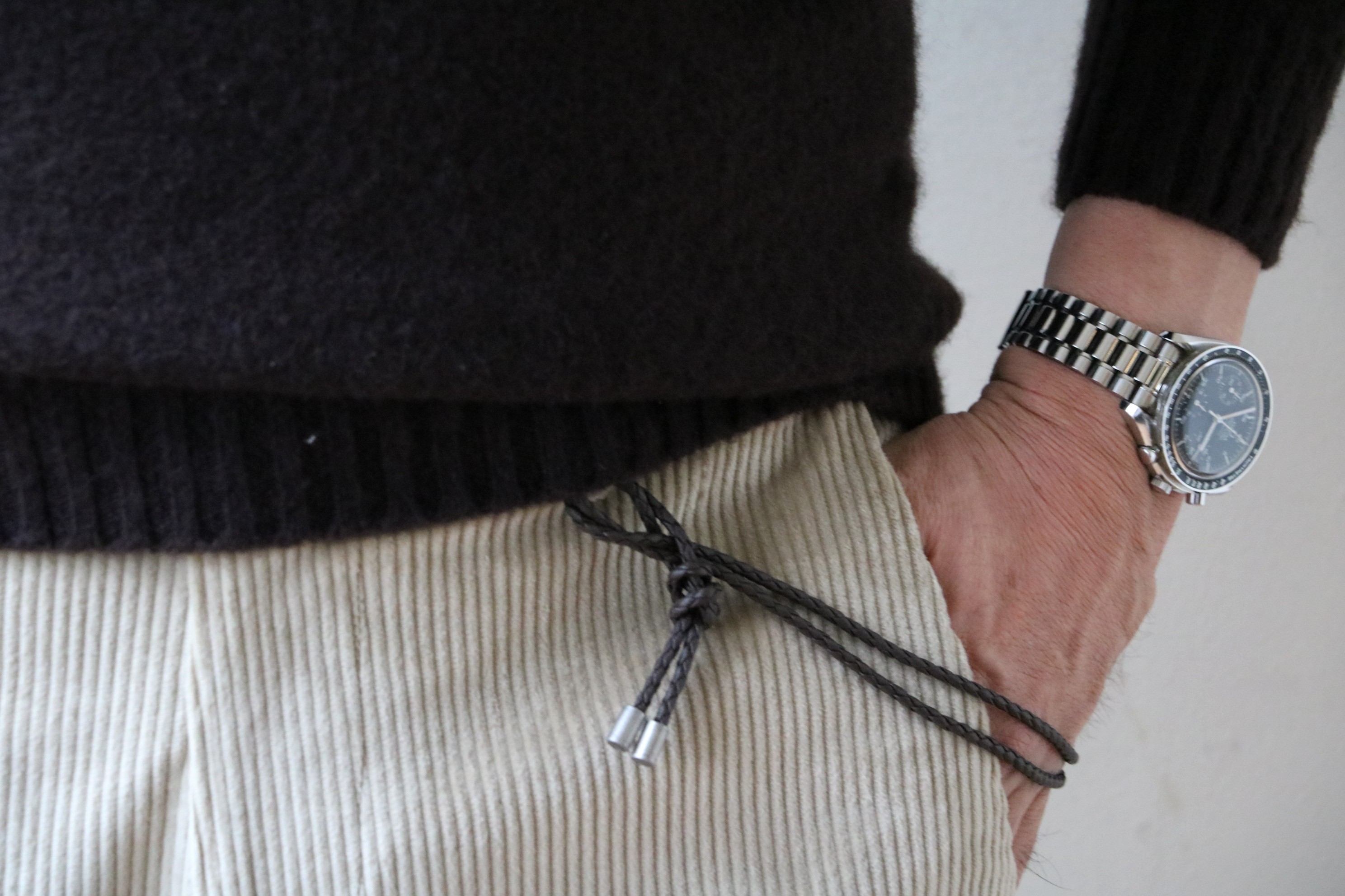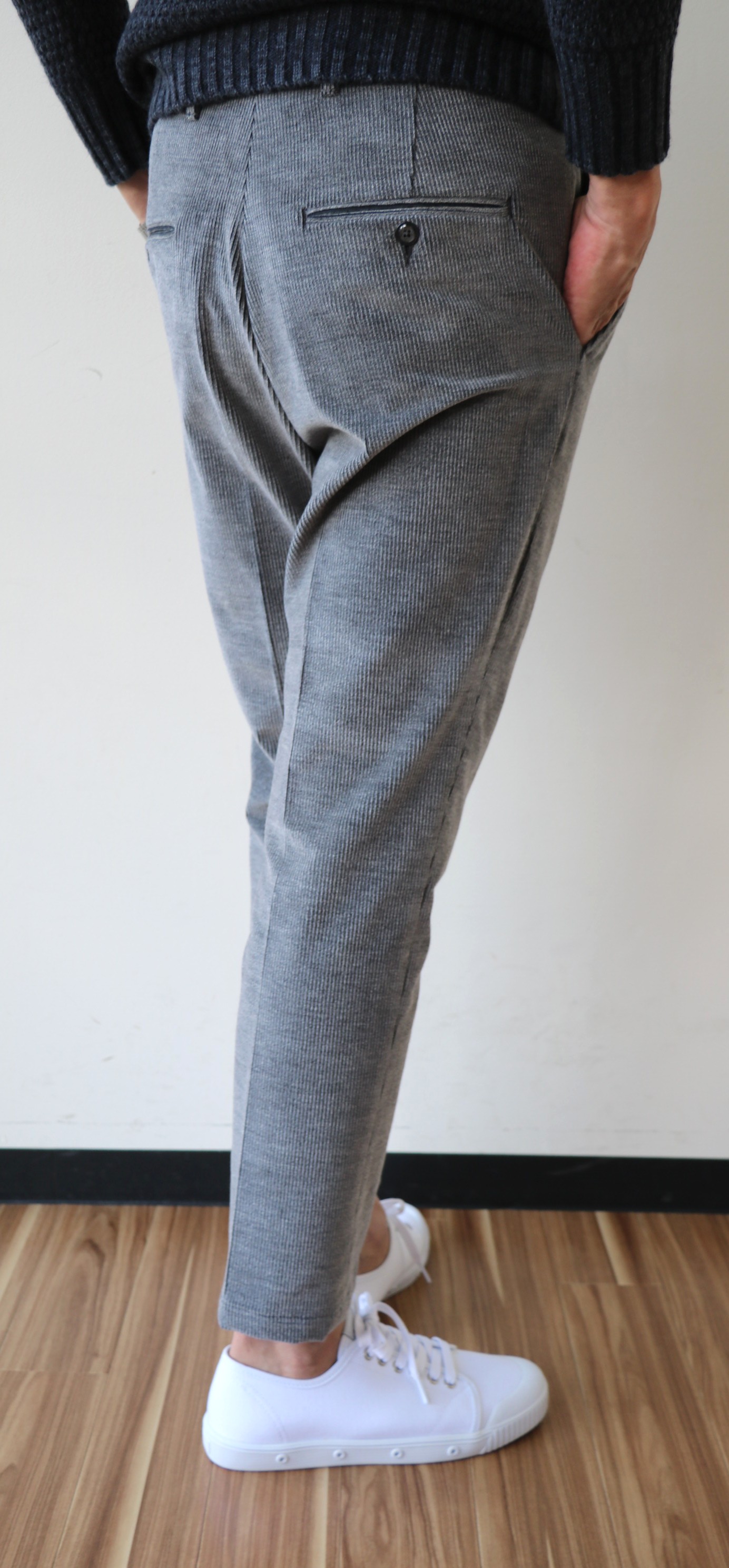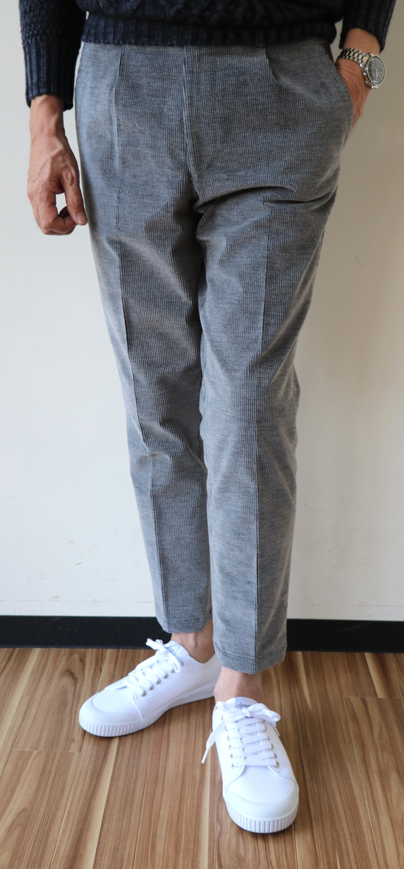 10月19日にご案内の2モデルとは、大きくシルエットを変えて選んだのが、中畝コーデュロイのグレイ。フランス語で「王様の畝」という意味をもつコーデュロイ。エレガントでスポーティな雰囲気を持つ生地ですが、極端に絞り込んだワイドテーパードに乗せることで、シャビーな雰囲気が新鮮です。