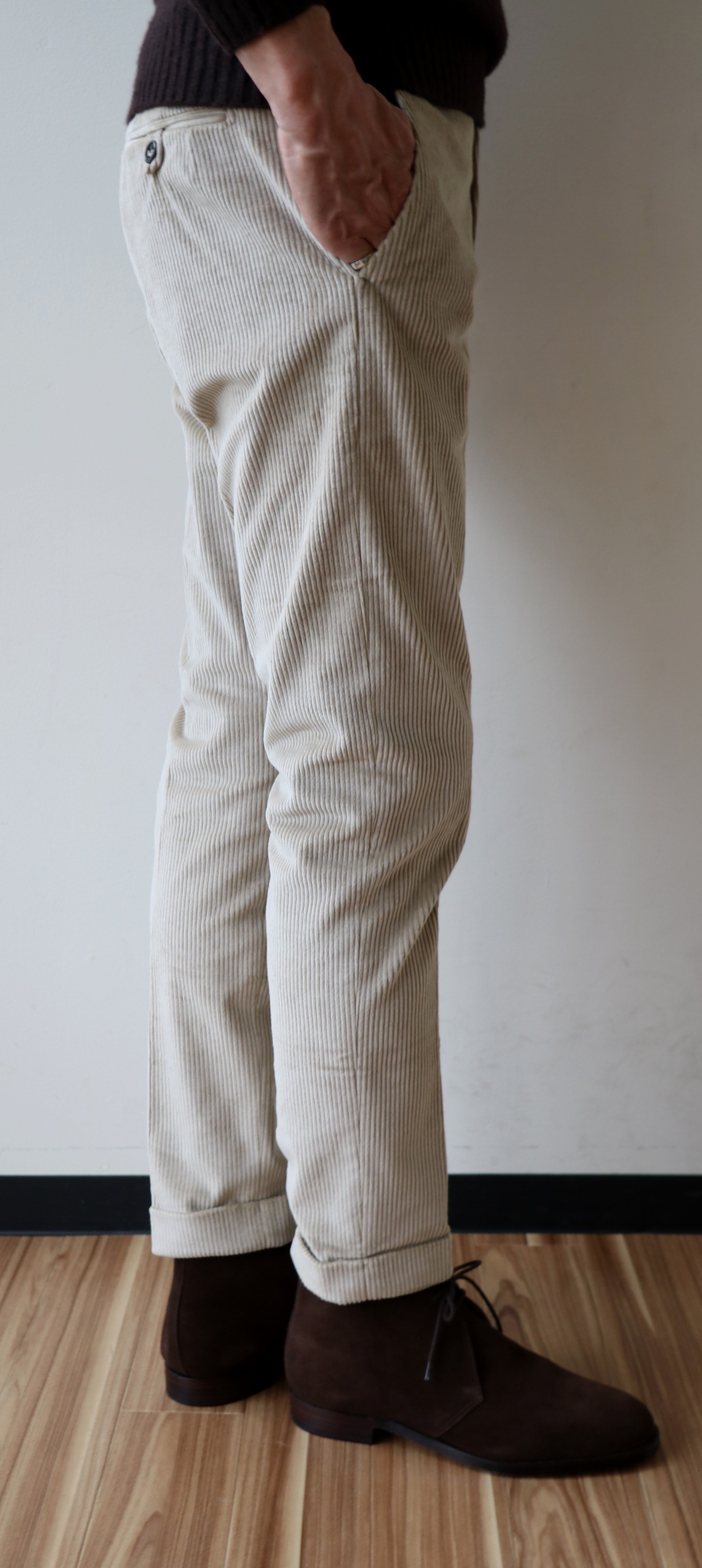 シャギーのブラウンで合わせたのが、【BERWICH/ベルウィッチ】のコーデュロイパンツです。選んだモデルは、完成度の高い「clochard/クロシャード」。前回、ご案内させていただいた「ウォッシャブルウールパンツ」も同じモデルで選んでおりますので、参考にしてください。