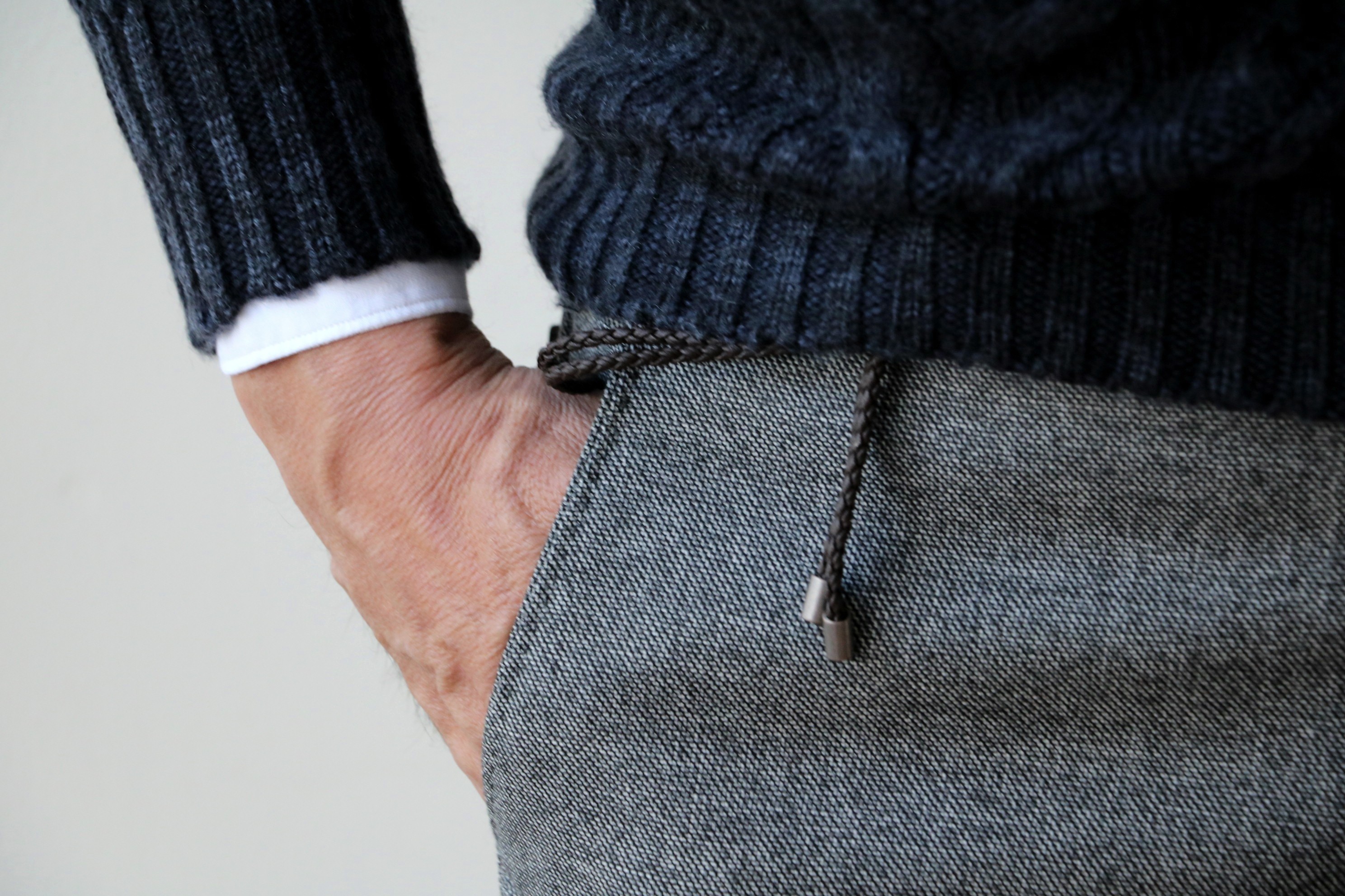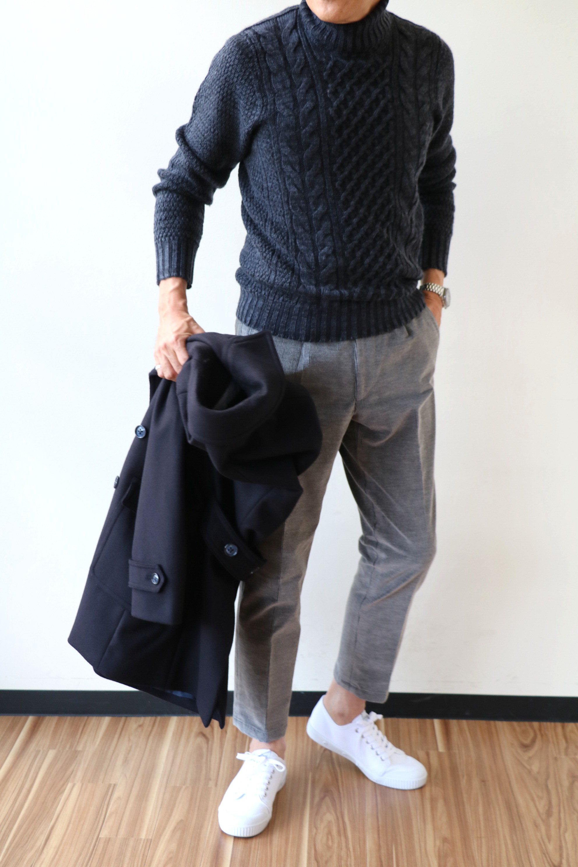 温度差のある、この季節から大活躍のHERNO(ヘルノ)の「ジャージ×ナイロン中綿入り切り替えブルゾン」。インナーは、スウェットの気楽さとニットの温かみの両方を備えた、ZANONE(ザノーネ)の「rain wool」。どちらも手に入れにくい逸品ですが、注目すべきは下半身です。