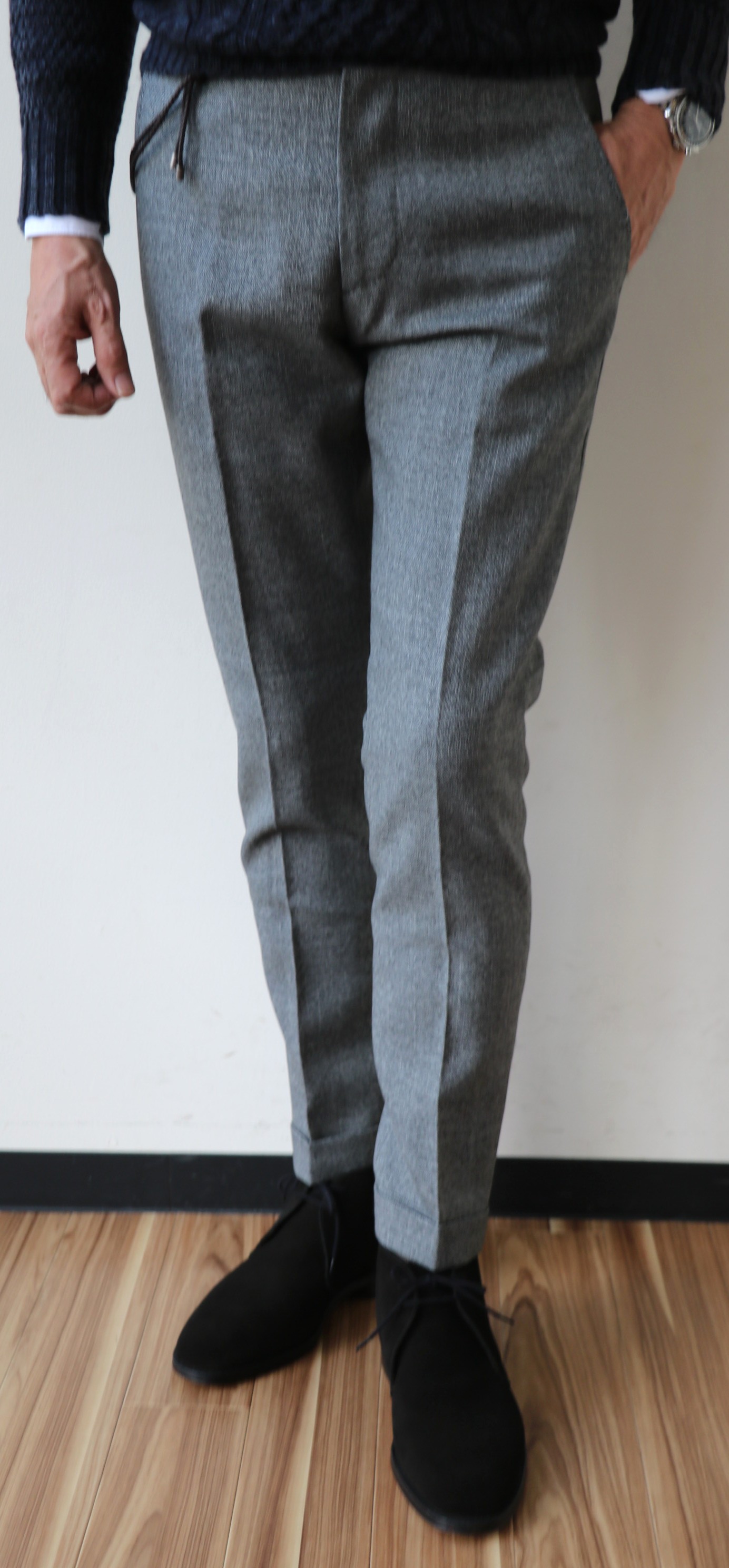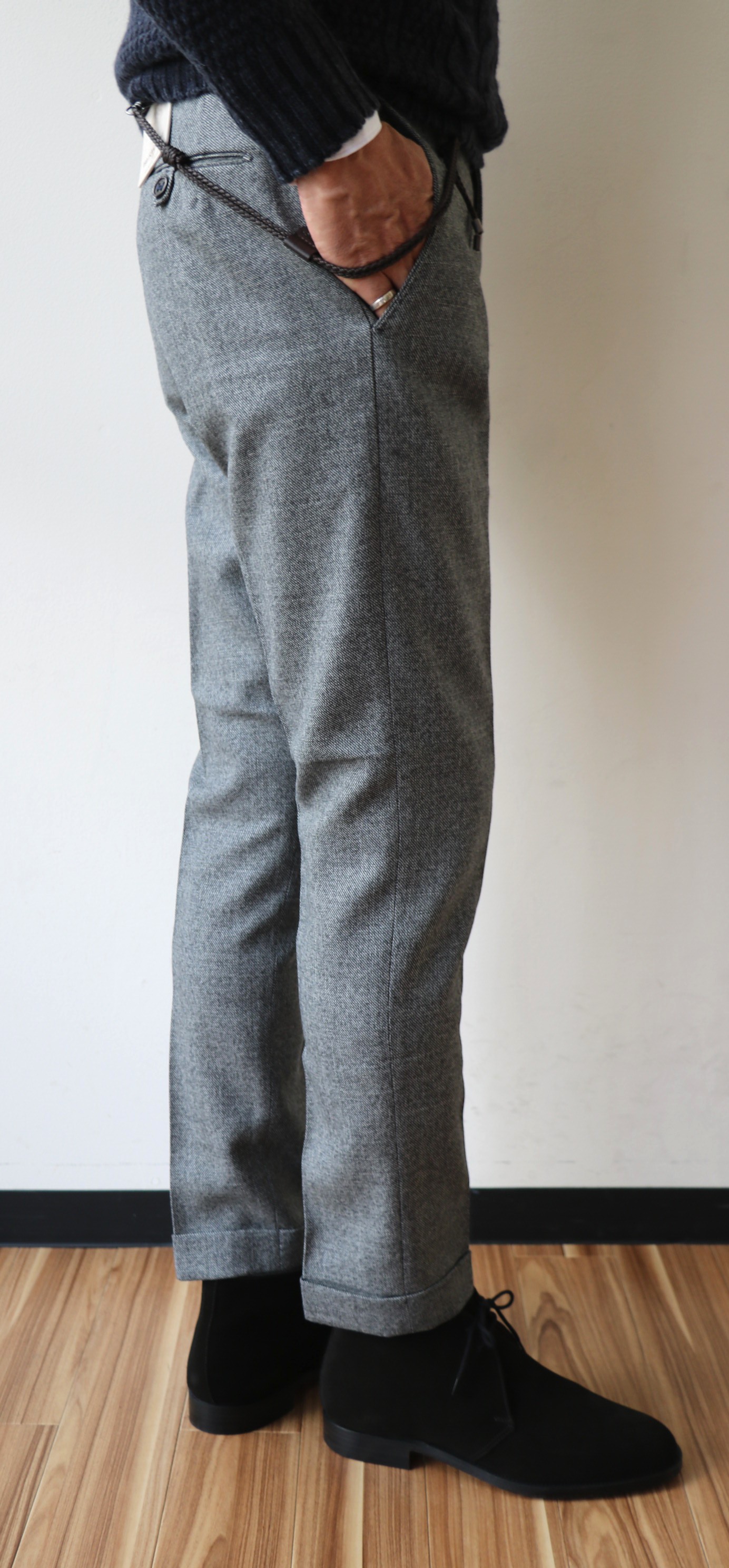 上の「シャビーケーブル編ラウンドネックセーター」に合わせたパンツが、【BERWICH/ベルウィッチ】。シャビー(古めかしい)なのは、生地。もしかすれば、ストックの英国生地でしょうか。堅めに織られたウール100%のシャークスキンは、懐かしい表情です。シルエットと色は異なりましが、以前ご案内させていただいたZanella(ザネッラ)の「ヴィンテージウール 1プリーツパンツ」に似た生地です。