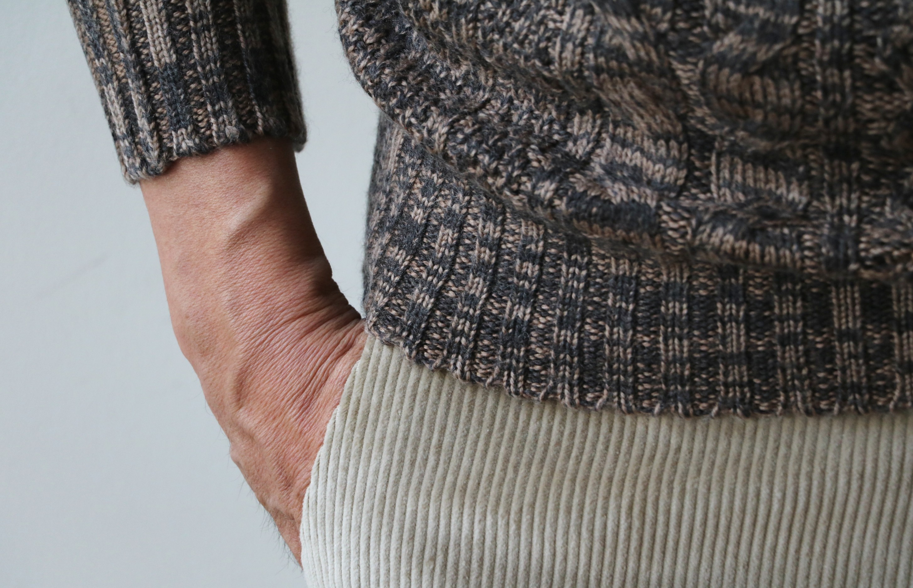 コーデュロイの中でもエレガントな表情を見せる太畝のコーデュロイ。角度によって濃淡の出る砂浜のようなサンドベージュを選びました。できれば、ウィンターベージュと名付けたいですね。