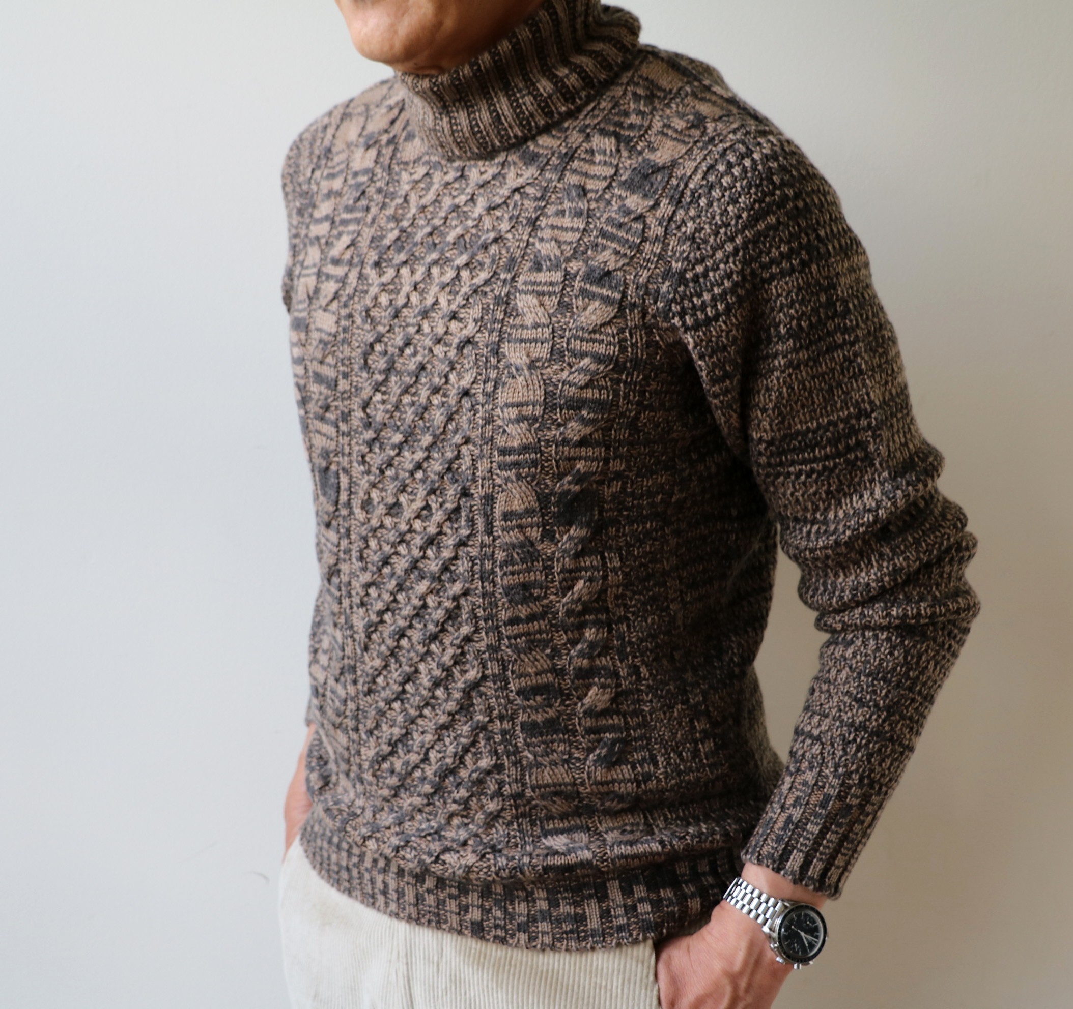 MODEL: シャビーケーブル編タートルネックセーター