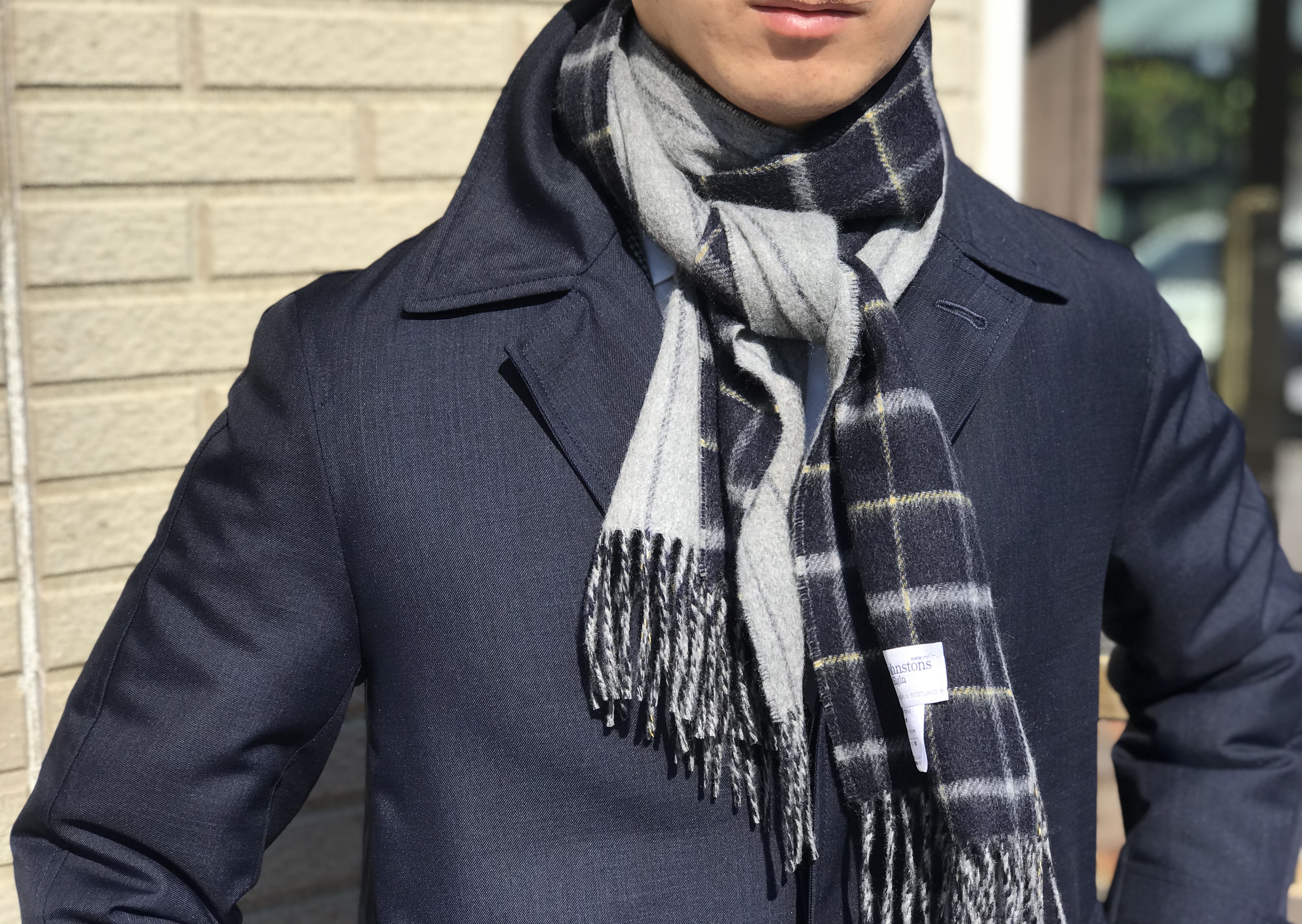 色のコントラストも強く、インパクトのある大柄のブロックチェックと、無地のようにシンプルなヘリンボーン柄が、ランダムに巻いたときに絶妙なバランスでコーディネートされます。