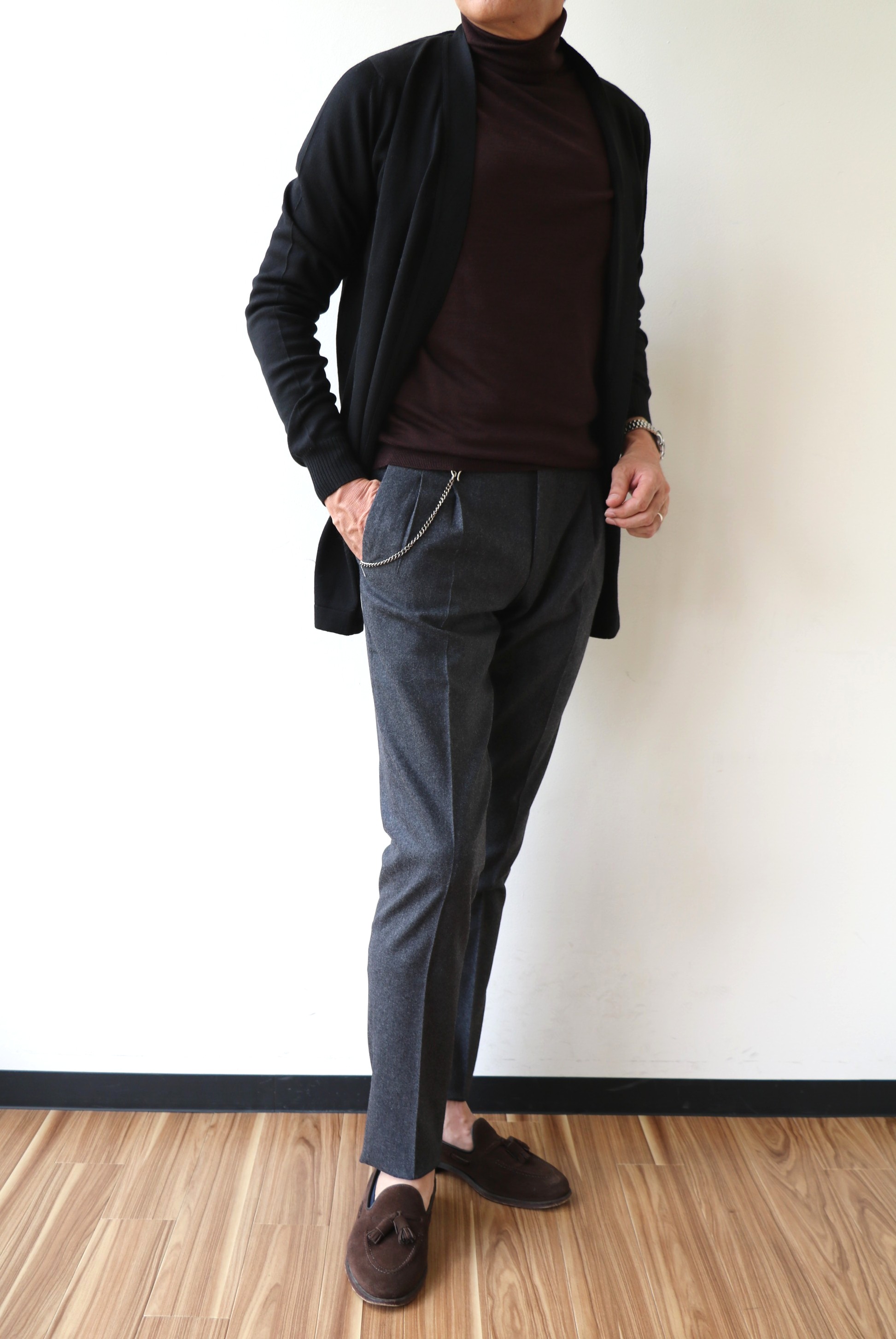 昨日に続き、【JOHN SMEDLEY/ジョン・スメドレー】のご紹介です。ジャケットやレザー、そしてニットのインに、30ゲージのタートルネック「ORTA」は、嵩張らずに暖かさを求めるなら、最強のニットです。参考までに、チェストナットに合わせたジャケットはTAGLIATORE/タリアトーレ、パンツは未公開のPT01(ピーティーゼロウーノ)、靴は私物のCROCKETT&JONES(クロケット&ジョーンズ)、手に持ったバッグはBoldrini SELLERIA(ボルドリーニ セレリア。オリオングリーンに合わせたレザーブルゾンはRadice(ラディーチェ)、パンツは未公開のPT01(ピーティーゼロウーノ)、靴はCROCKETT&JONES(クロケット&ジョーンズ)です。