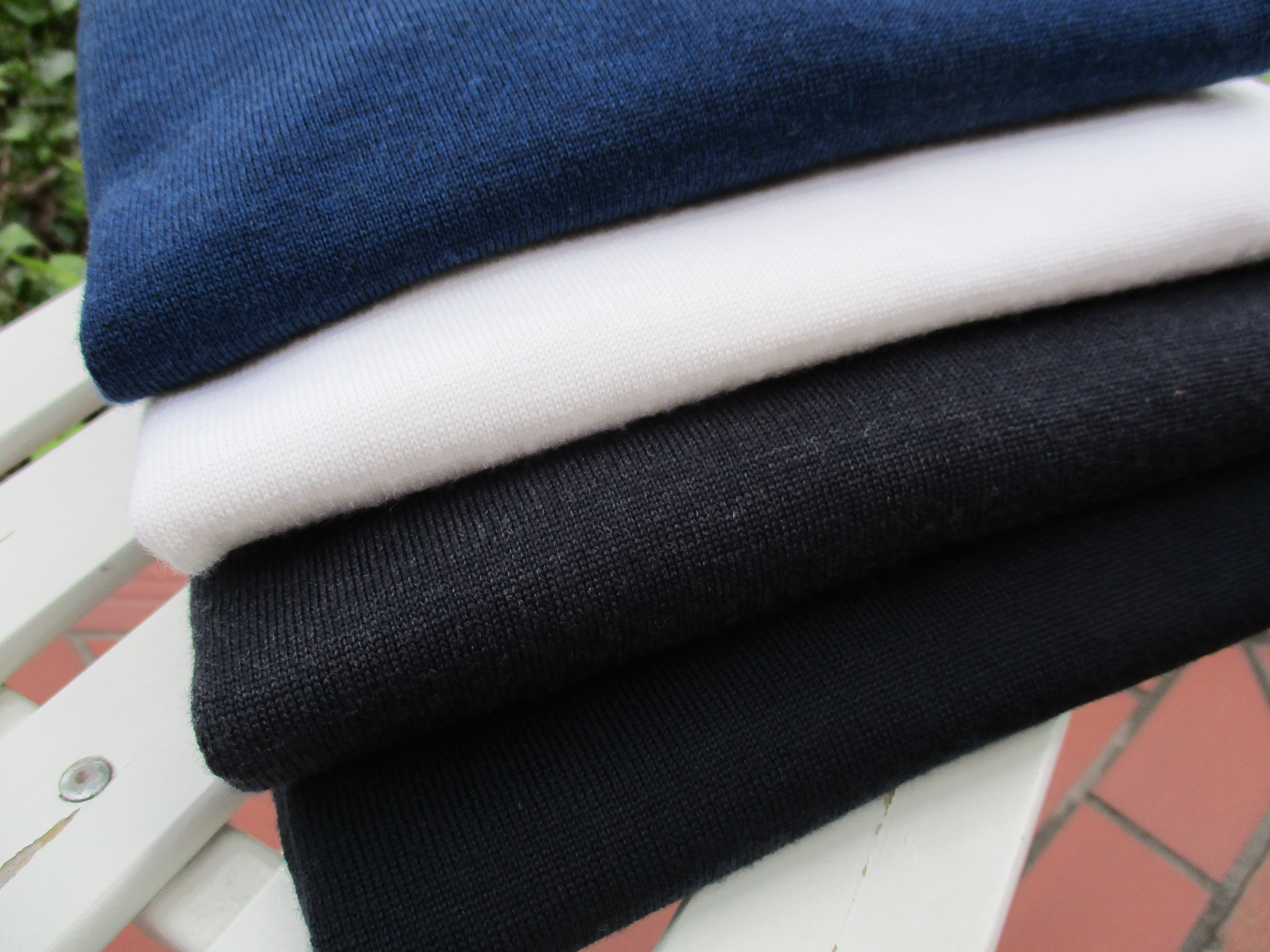 コバルトブルー(MAGNETIC COBALT)とネイビー(MIDNIGHT)のカラーブロックです。先にご案内のラウンドネックが暖色。こちらは、対照的な寒色でセレクトしました。