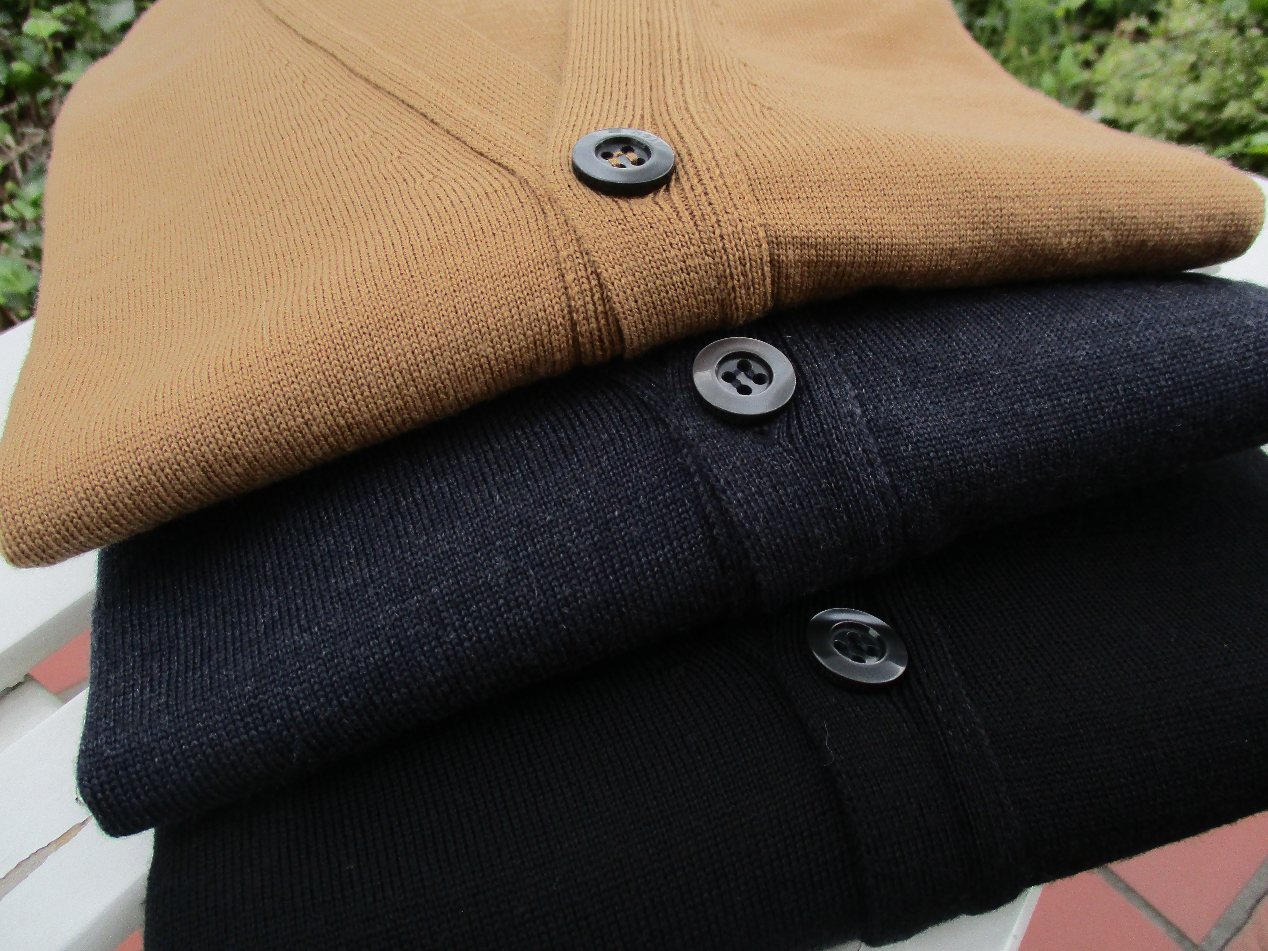 24ゲージのカーディガン「BURLEY」もSTANDARD FITです。キャメル、ブルーグレイ、ブラックの3色ご用意しました。