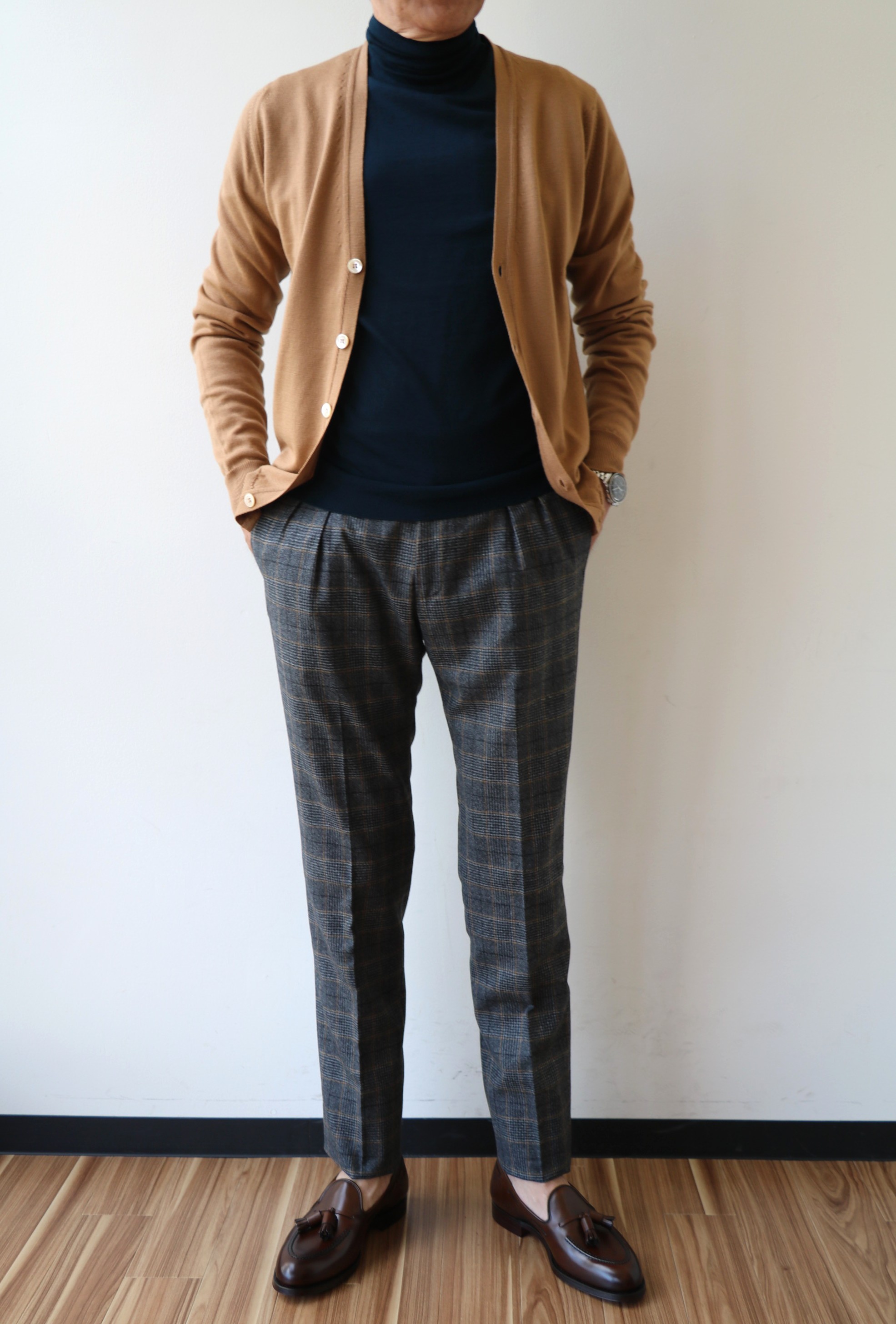 30ゲージのタートルネック「ORTA」のオリオングリーンに合わせてみました。パンツはTAGLIATORE(タリアトーレ)のチェック柄にある色を拾ってみました。靴は、もちろんCROCKET&JONES(クロケット&ジョーンズ)です。