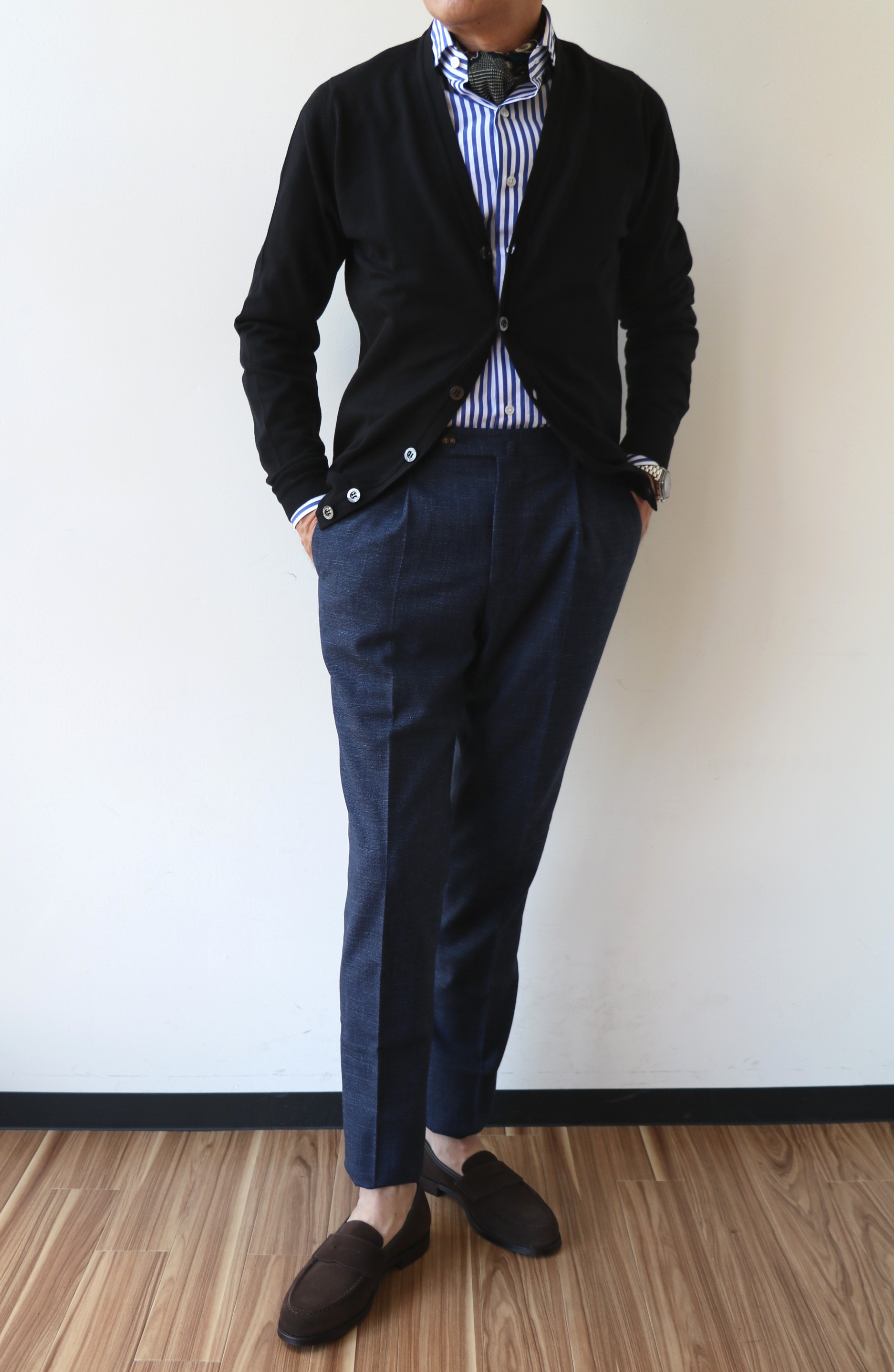 ブラックは、Mario Muscariello(マリオ ムスカリエッロ)のロンドンストライプ、スカーフは未公開のTAGLIATORE(タリアトーレ)、パンツはPT01(ピーティーゼロウーノ)のブルーを使いました。足元は、こちらもCROCKET&JONES(クロケット&ジョーンズ)です。