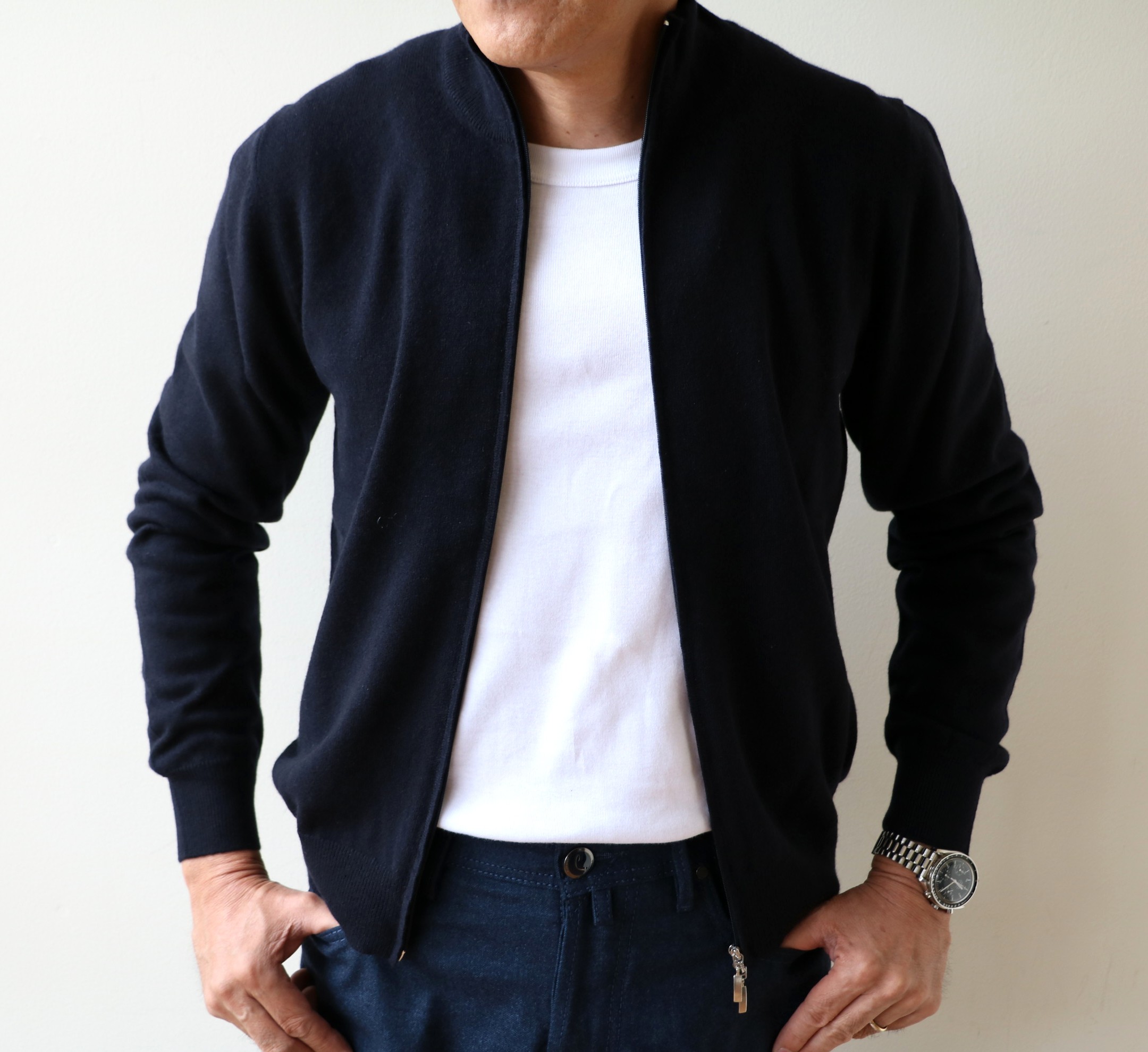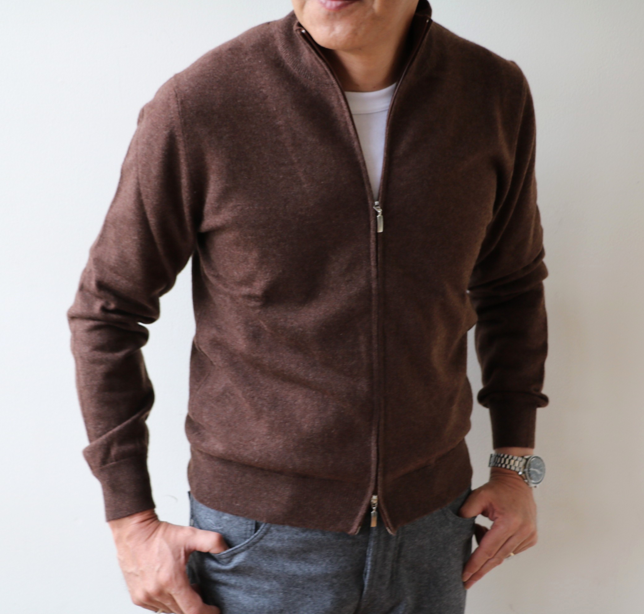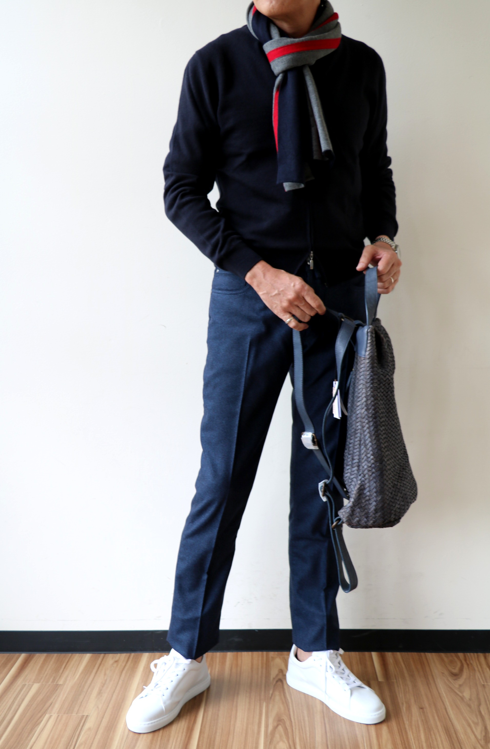 快適さにリッチさが加わったコーディネートです。同素材のフルジップニットで合わせたパンツは、どちらもJACOB COHEN(ヤコブ・コーエン)です。巻いたストールは、ブラウンがFranco Bassi(フランコバッシ)、ネイビーがJOHNSTONES(ジョンストンズ)。どちらも未公開です。足元は、CROCKETT&JONES(クロケット&ジョーンズ)とPantofola d'Oro/パントフォラ ドーロのレザースニーカー。手に持ったバッグは、TIBERIO FERRETTI(ティベリオ フェレッティ)です。