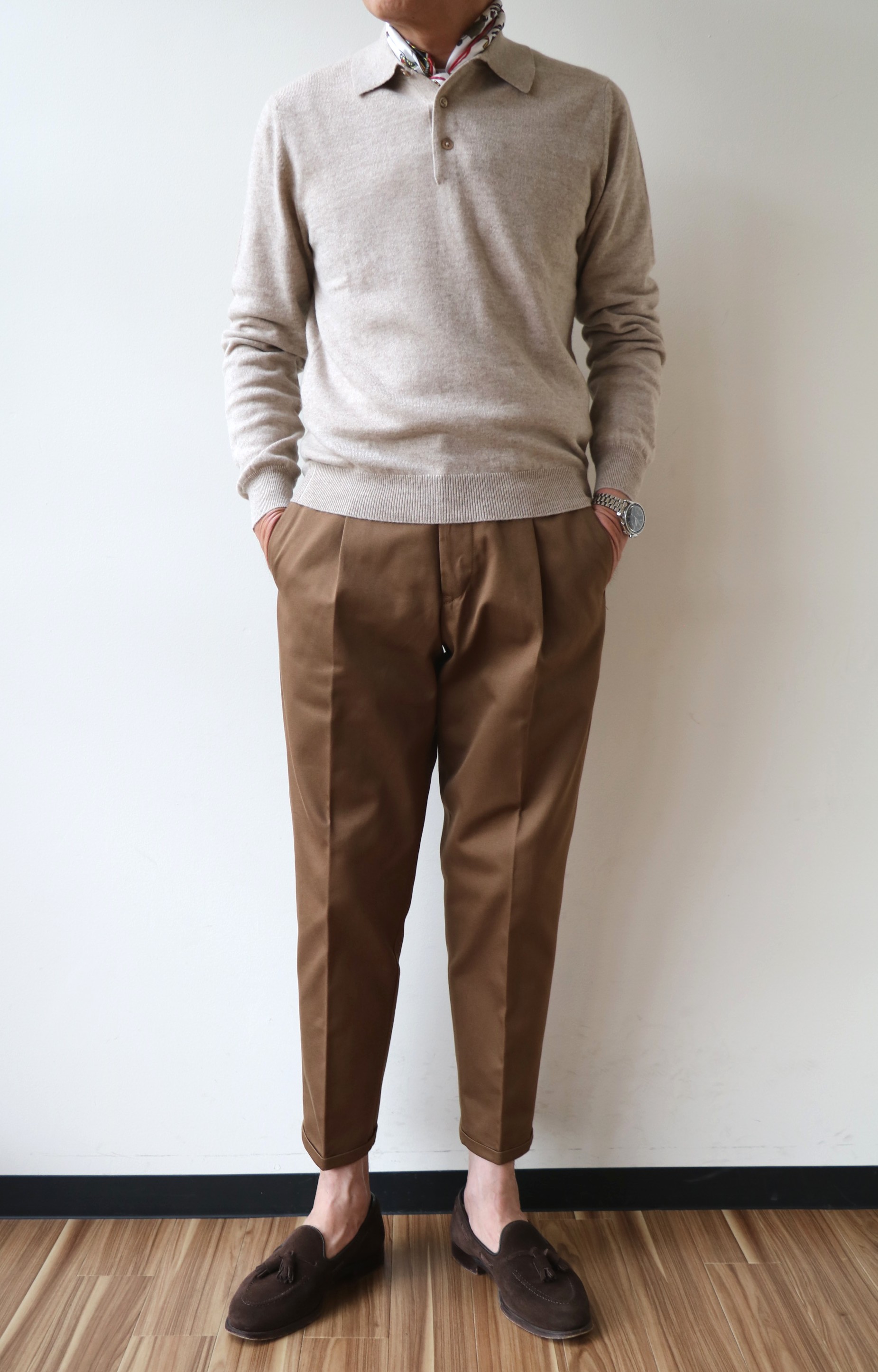 少し前の気温であれば、活躍するのが、FEDELI(フェデーリ)のポロニット。これからの季節なら、カシミアに勝るものはありません。パーカーでベージュを揃えるなら、こちらはライトグレイでしょうか。