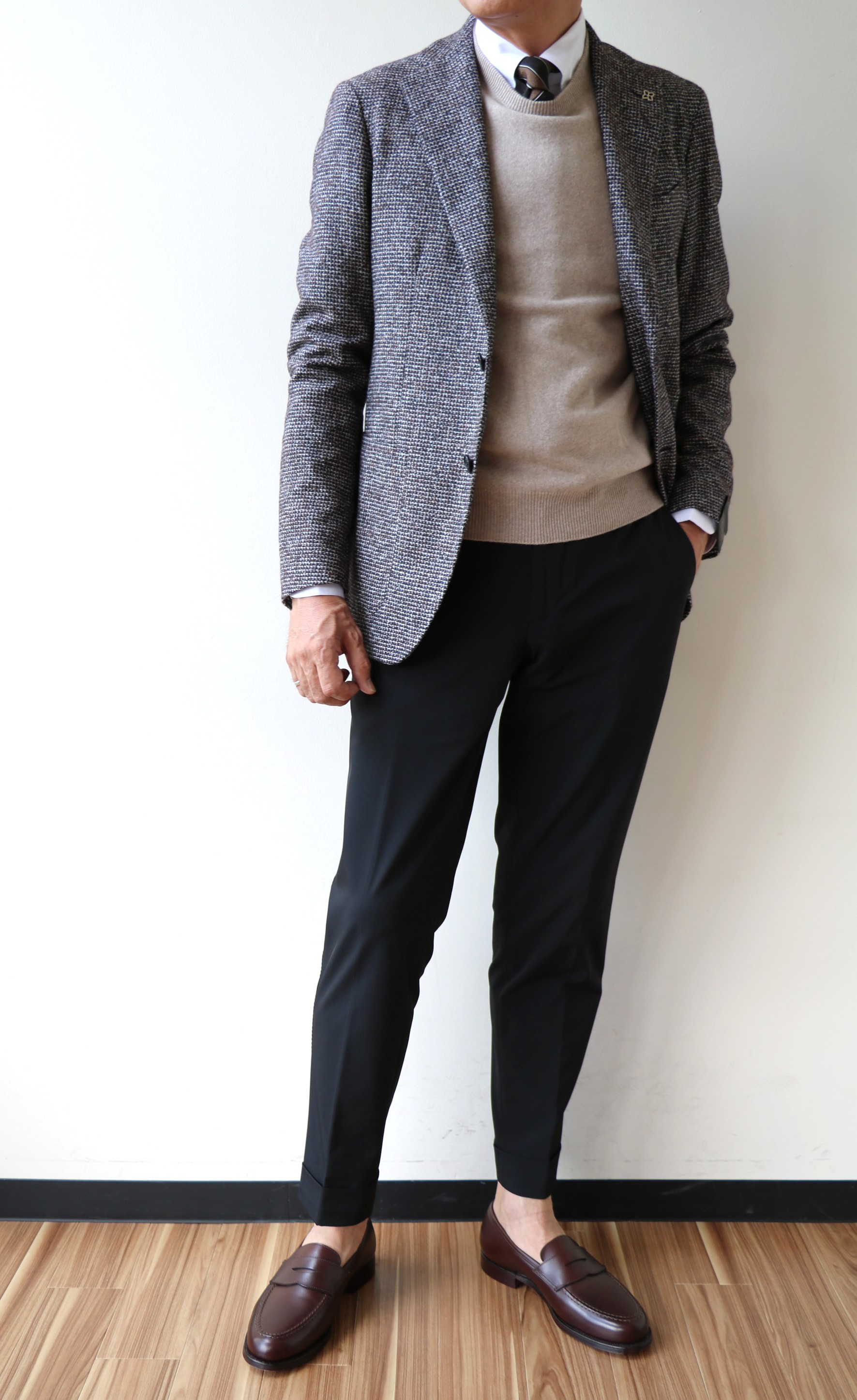 ブラックとミディアムグレイで合わせたジャケットとパンツは、ともにTAGLIATOREとINCOTEX。カジュアルシーンでは、シャツやカットソーのコーディネートで雰囲気が変わります。