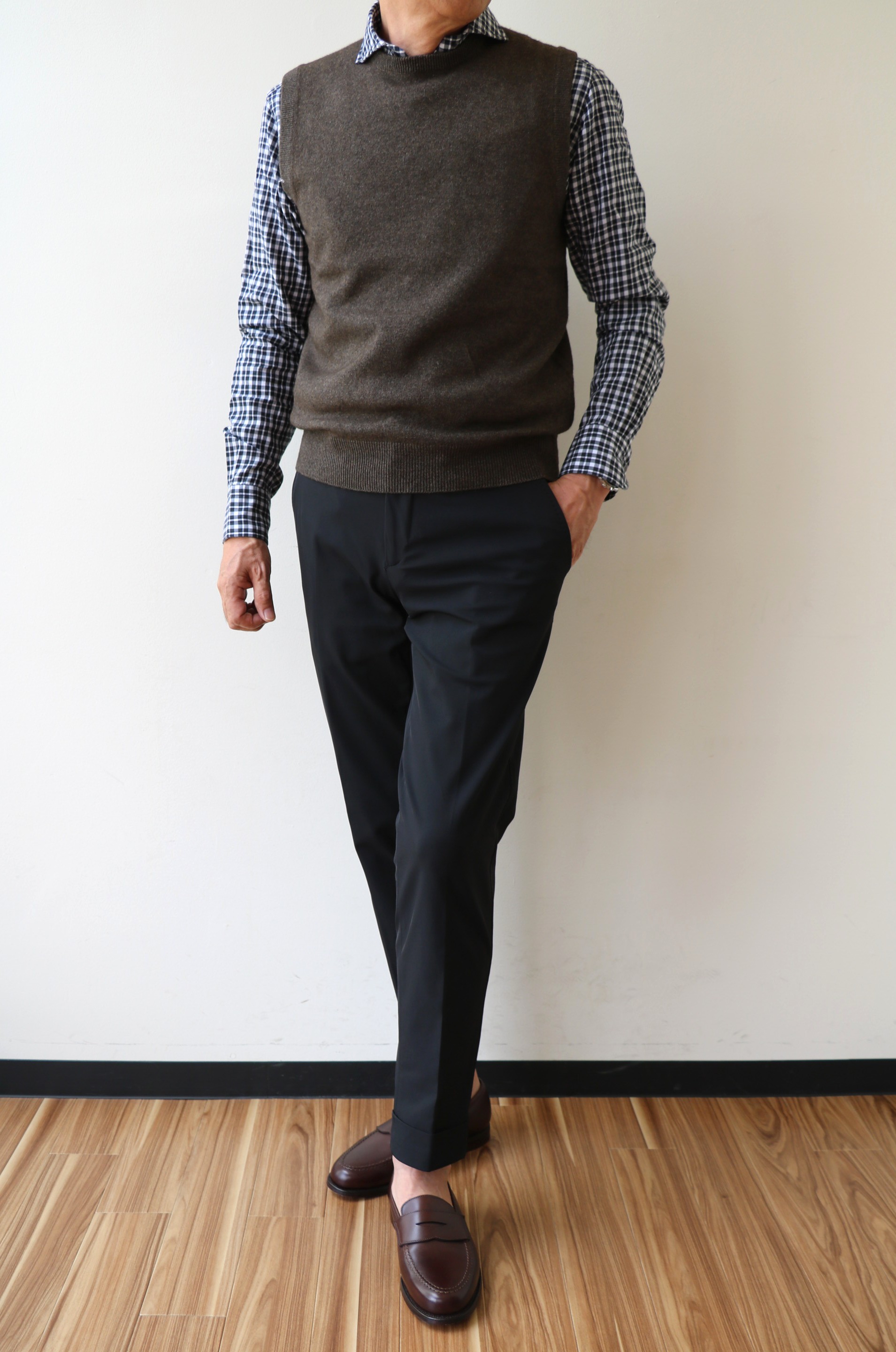 秋が深まれば、チェックのシャツに。袖のないベストであれば、羽織るものは、自由自在です。