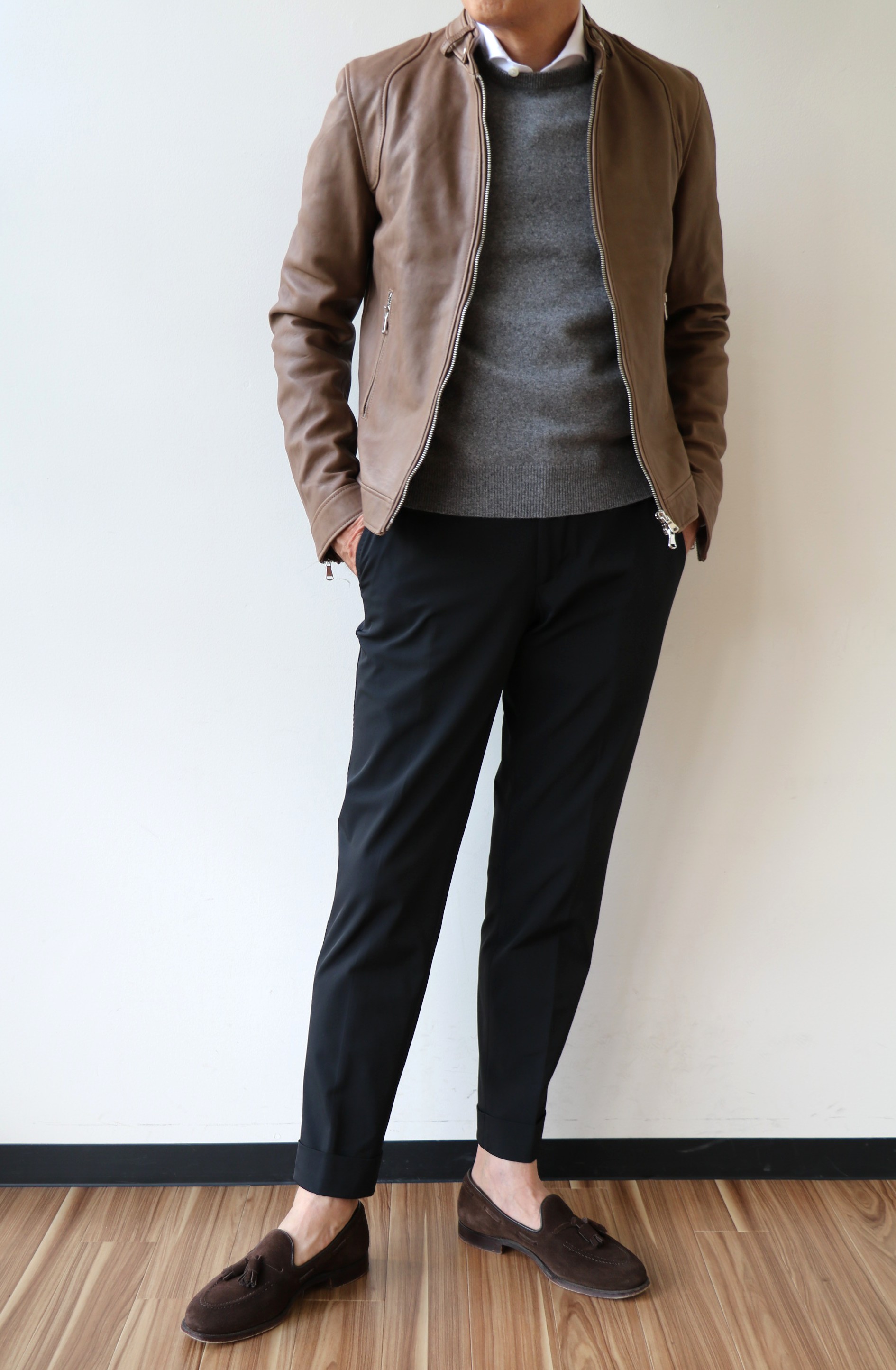 モデルは身長180㎝、体重67kg、胸囲94㎝で、サイズ46を着用しております。合わせたニットはJOHN SMEDLEY、パンツはRICHARD J.BROWN、バッグはZANELLATO、靴はParabootです。