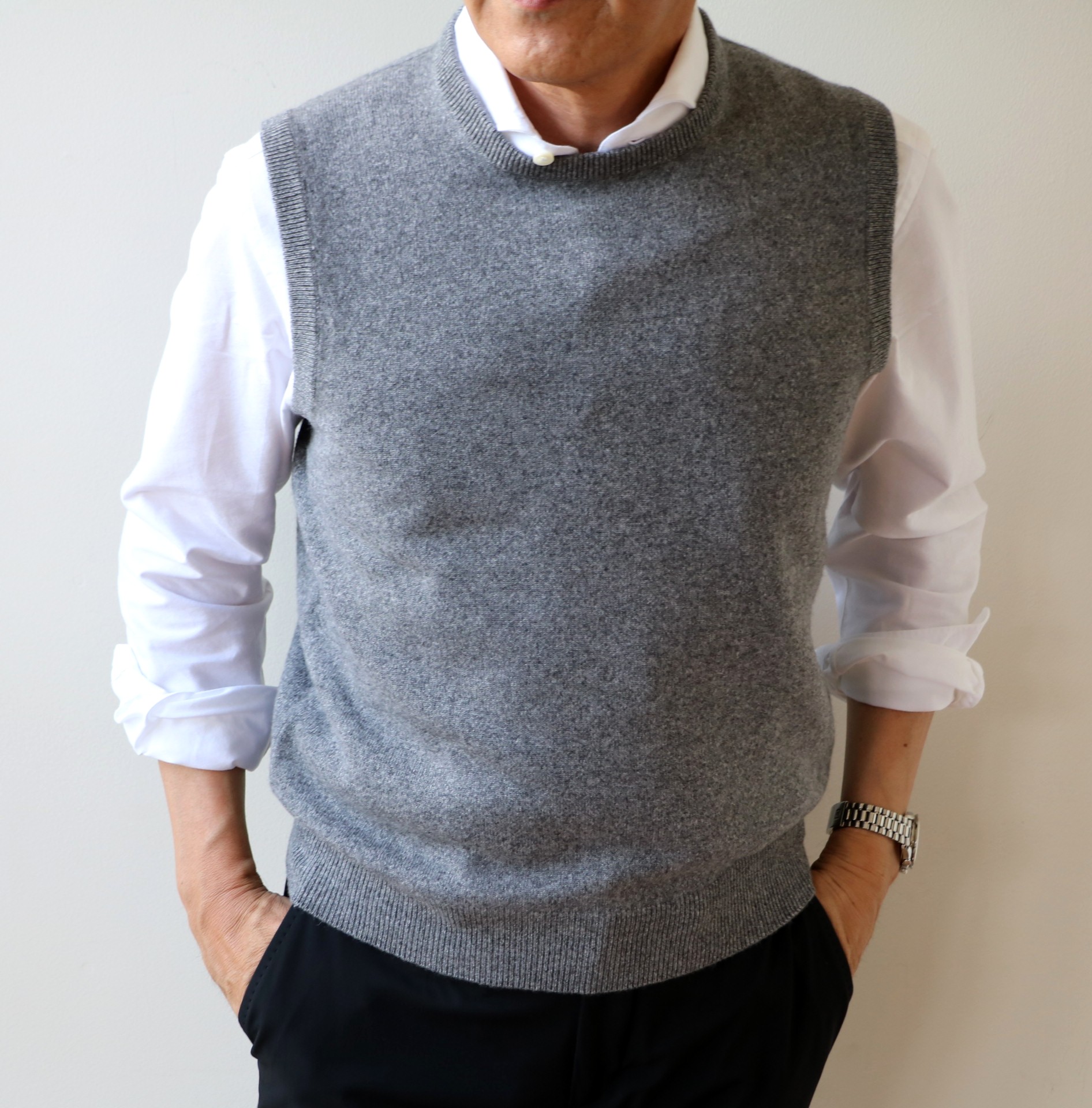 Vネックやフロント釦のベストと比べると、最もスポーティーなラウンドネック。女子受けがいいのも、この形です。過去の経験からですので、間違いはないはずです。少年のような無邪気さと大人のセクシーさの両方を兼ね備えた、最強のニットとなる...つもりで別注しました。