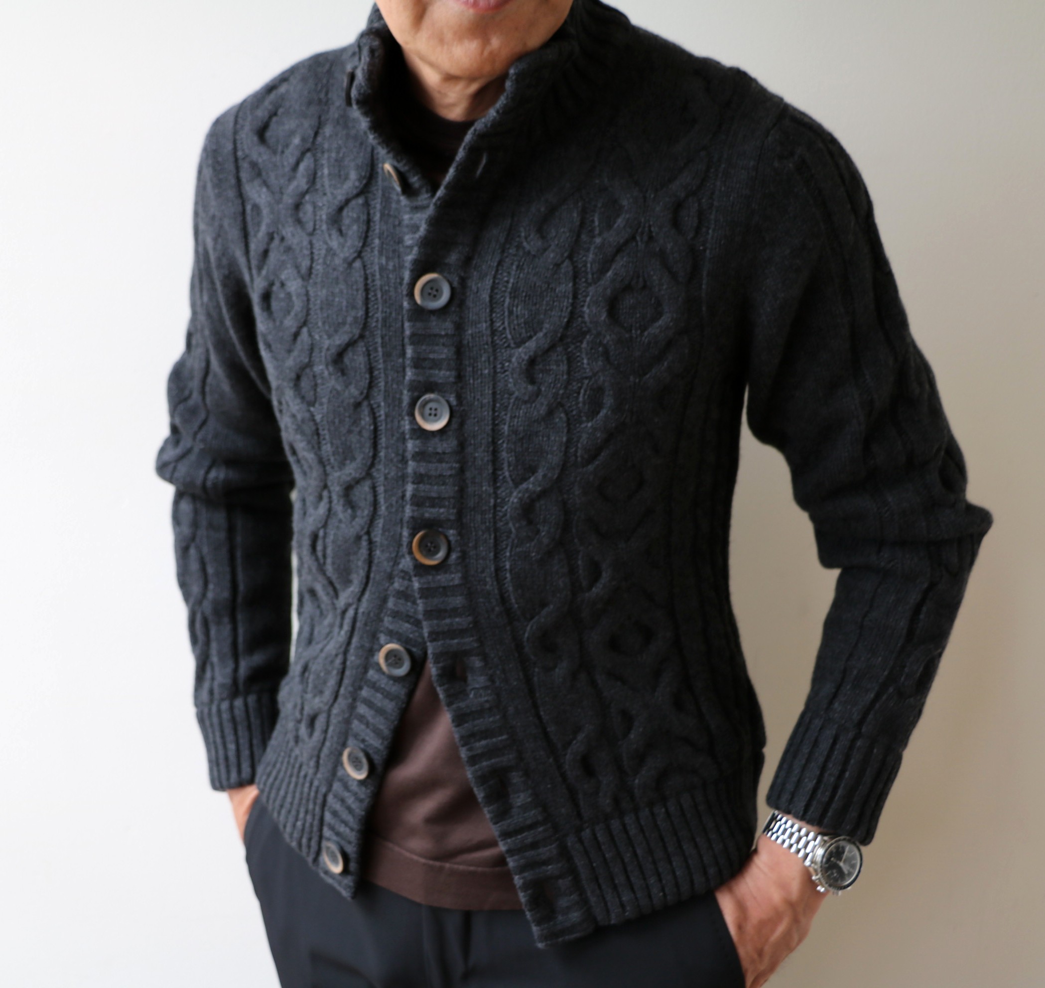 今夜、通販サイト「SUGURU SHOP」に掲載されますので、細部の写真は省かせて頂きます。昨日ご案内のFEDELI(フェデーリ)のロングスリーブ鹿の子ポロに合わせたのが、ウール・カシミアの立ち襟カーディガン。既にご紹介済みのZANONE(ザノーネ)とは趣は異なります。素材の柔らかさとケーブル編みの優しさが、心に癒しをもたらせてくれるニットに仕上がっています。