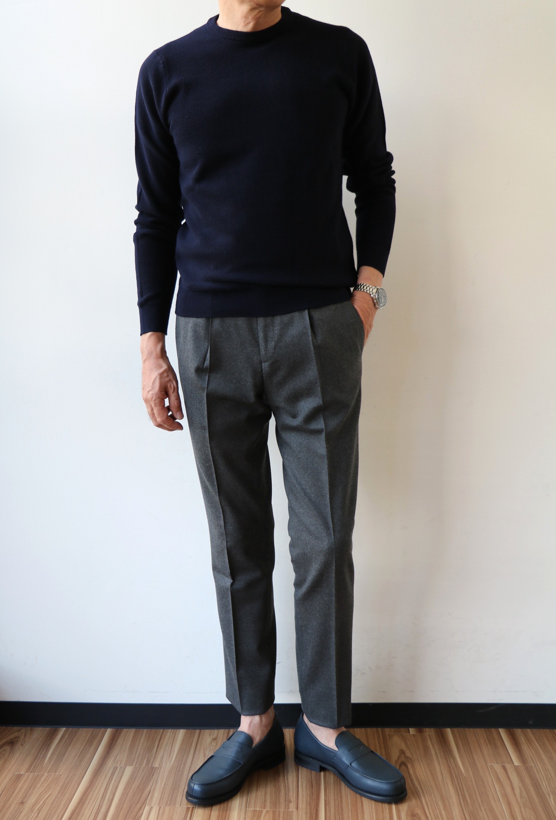 チャコールグレイで合わせたシャツはFinamore(フィナモレ)、靴はCROCKETT&JONES(クロケット&ジョーンズ)、ネイビーで合わせたカットソーはFEDELI(フェデーリ)、靴はDOUCAL'S(デュカルス)です。