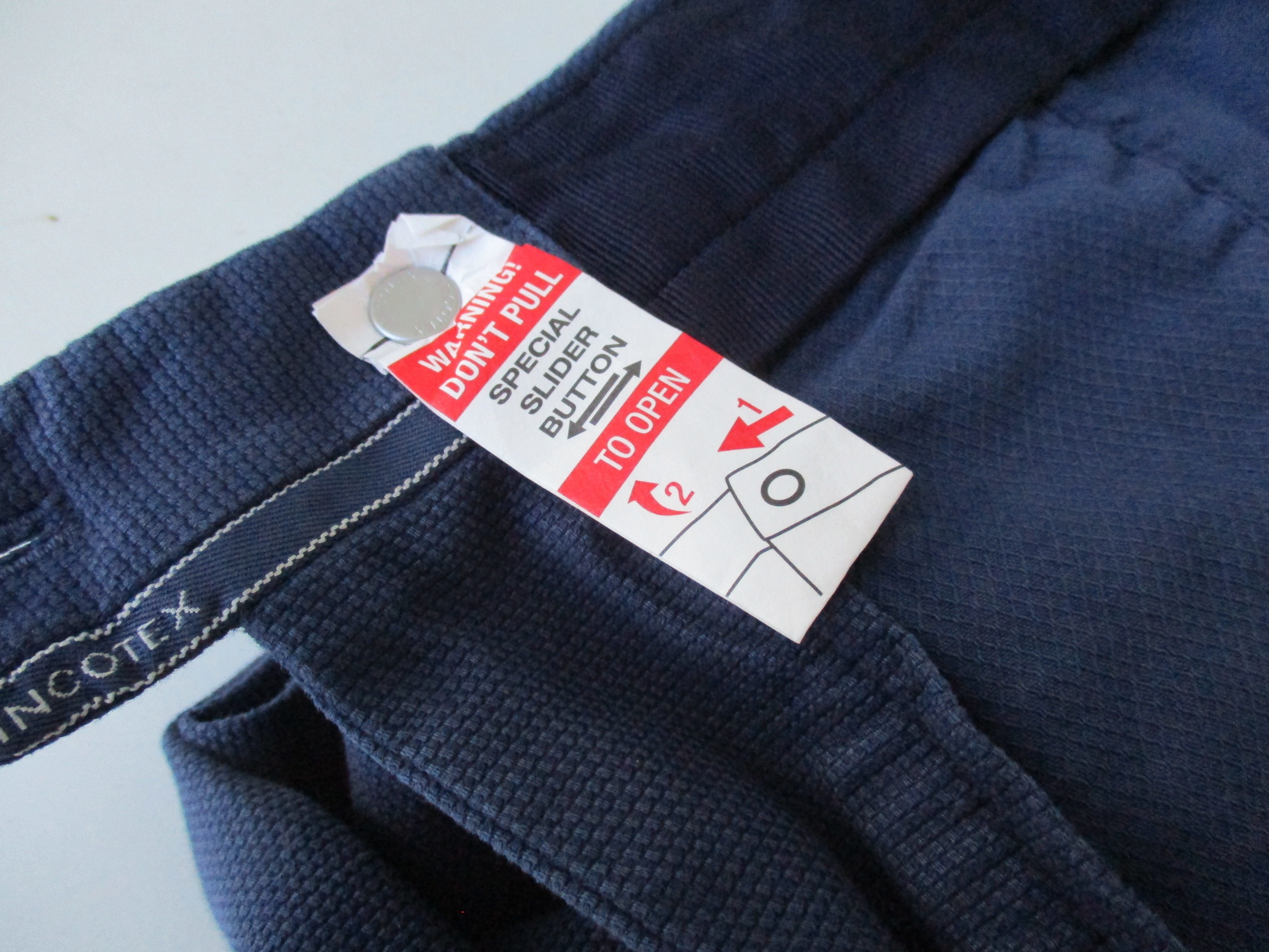 襟裏に書かれているのは、「THERMAL PROTECTION/断熱システム」「TRANSPIRANT/発汗機能」「HOME WASHABLE/家庭での洗濯」の3つの機能。体温を逃がさず、発汗性があり、家庭の洗濯機で洗えるということです。