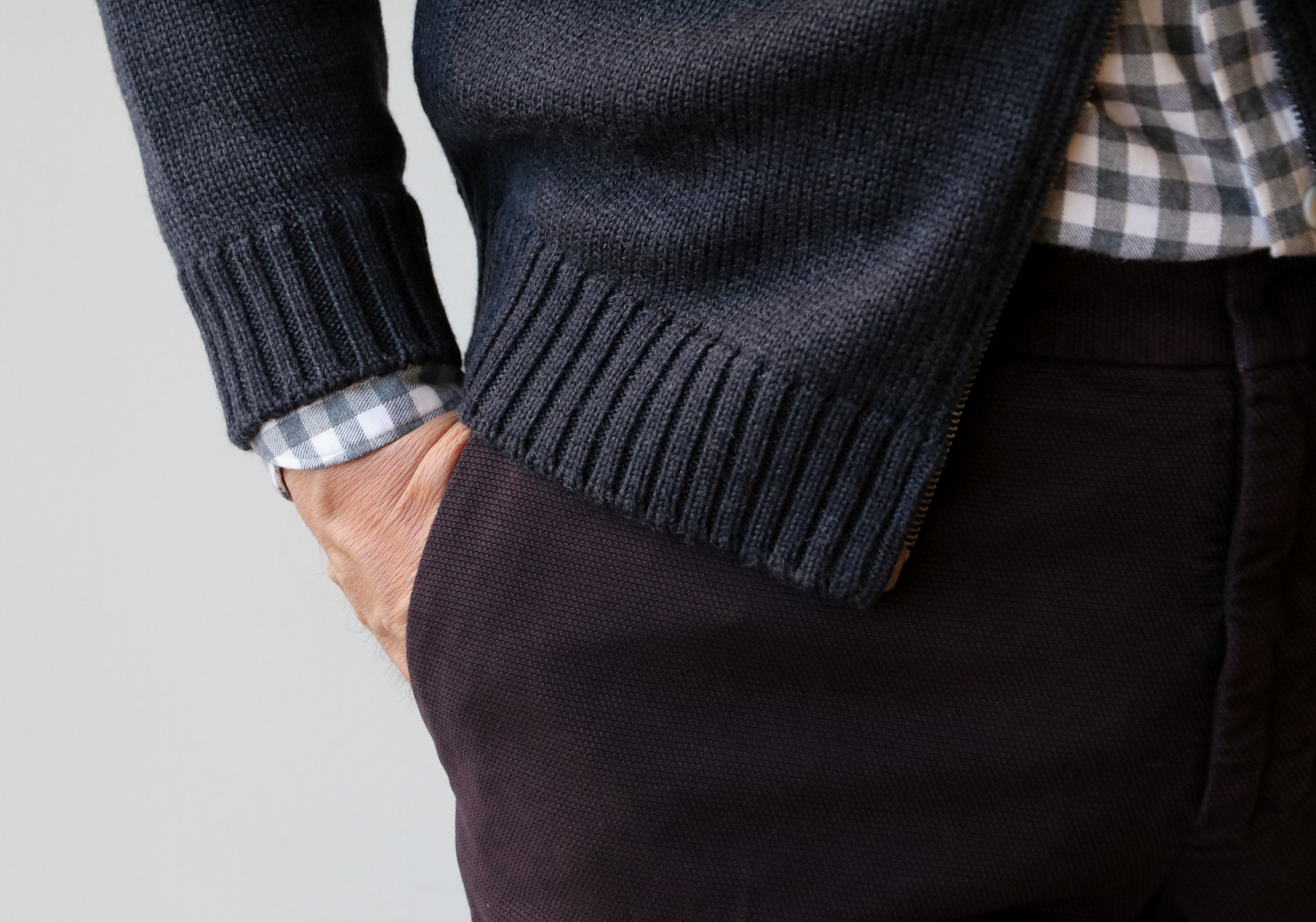 既にご案内済みの立ち襟カーディガン「CHIOTO/キョート」やタートルネック「DV/ドルチェヴィータ」と同じミドルゲージを使った3面タイプ(襟、袖口、裾がリブのもの)のブルゾン型カーディガンです。ハイゲージのウォームポケット付ジップアップセーターとは、また雰囲気の異なるニットです。