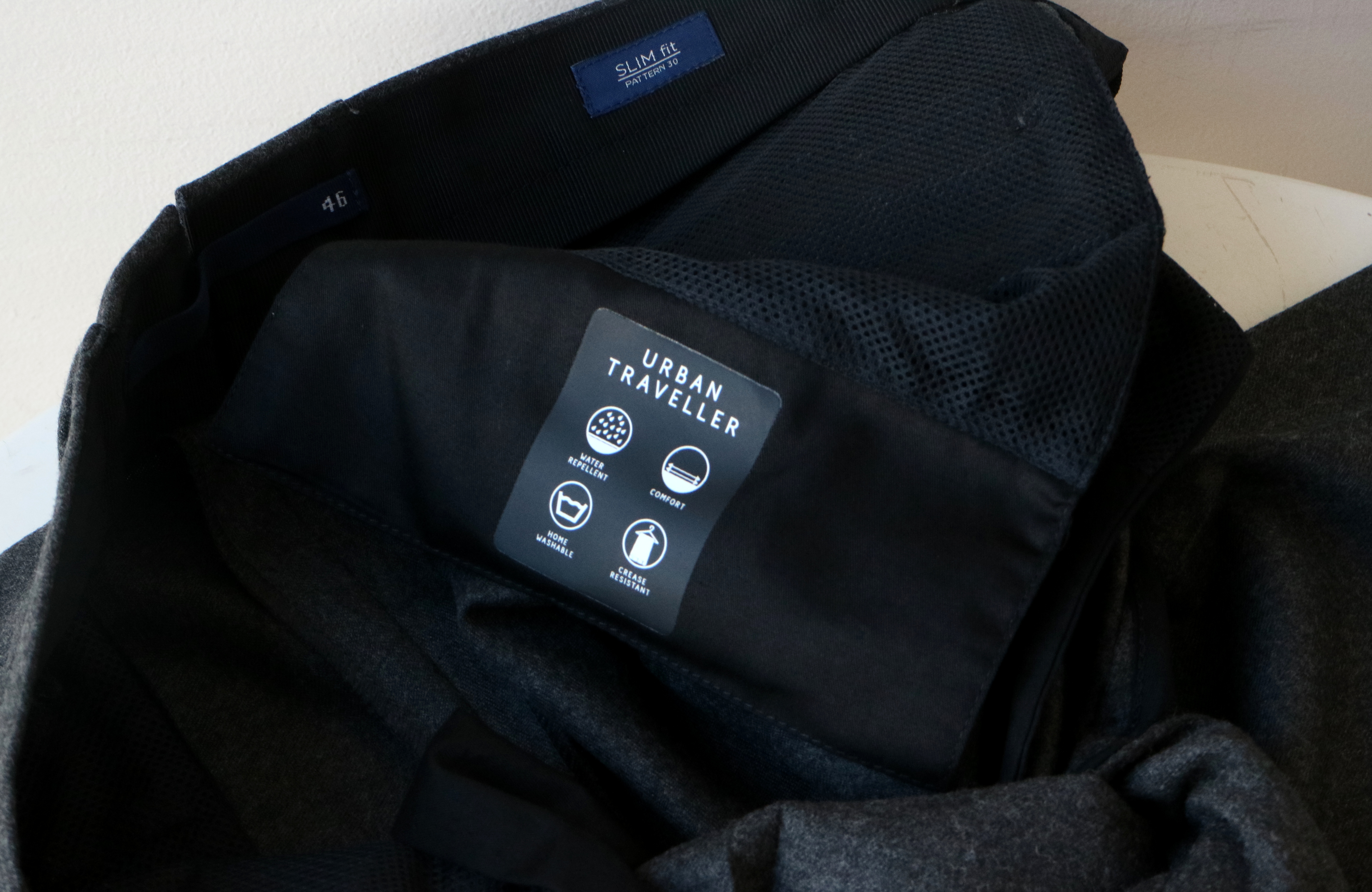 「WATER REPELLENT」「COMFORT」「HOME WASHABLE」「CREASE RESISTANT」の4つの機能をもつ都市型トラベラーパンツ。この場合、旅行者というよりも、出張など、移動の多いビジネスマンを対象にしているといった方が適切です。突然の雨にも負けない防水性、動きやすい伸縮性、手間のかからない手入れ、クリース(折り目)が取れにくいなど、便利な機能が満載の全天候型パンツです。