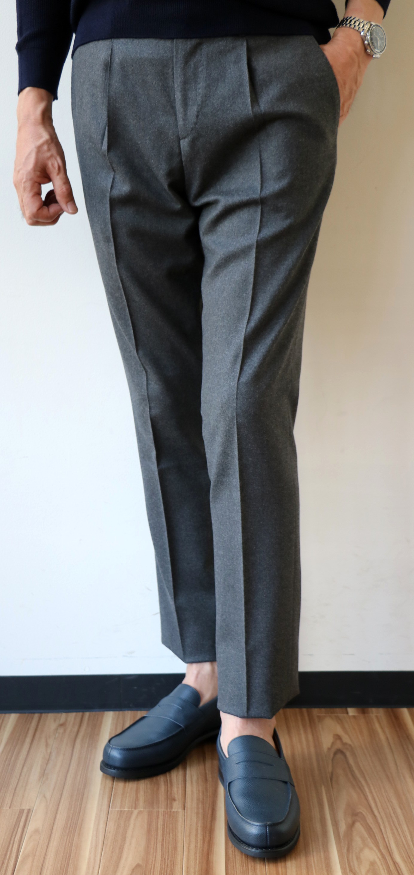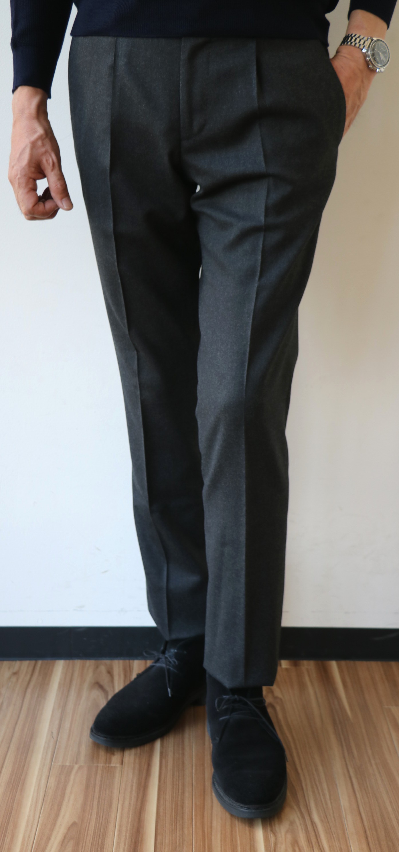 ベージュと、このチャコールグレイで合わせたジャケットは、TAGLIATORE(タリアトーレ)の新作です。明日、ご案内させていただきます。