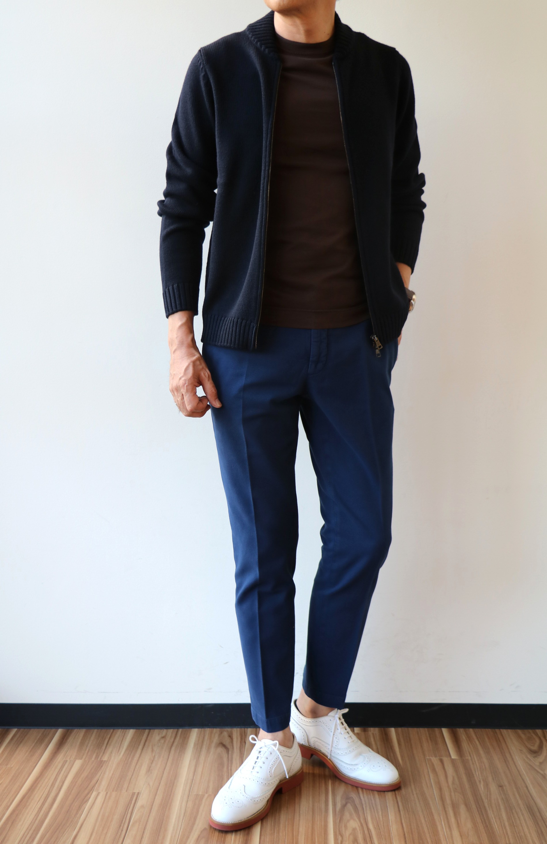 アクティブなニットならばと、合わせたパンツはドローコード付き。どちらもINCOTEX(インコテックス)です。グレイ×オリーブで合わせたのは、こちら。ネイビー×ブルーで合わせたのは、こちらです。靴も歩きやすいSpring Court(スプリング コート)のスニーカーとParaboot(パラブーツ)のウィングチップで合わせています。