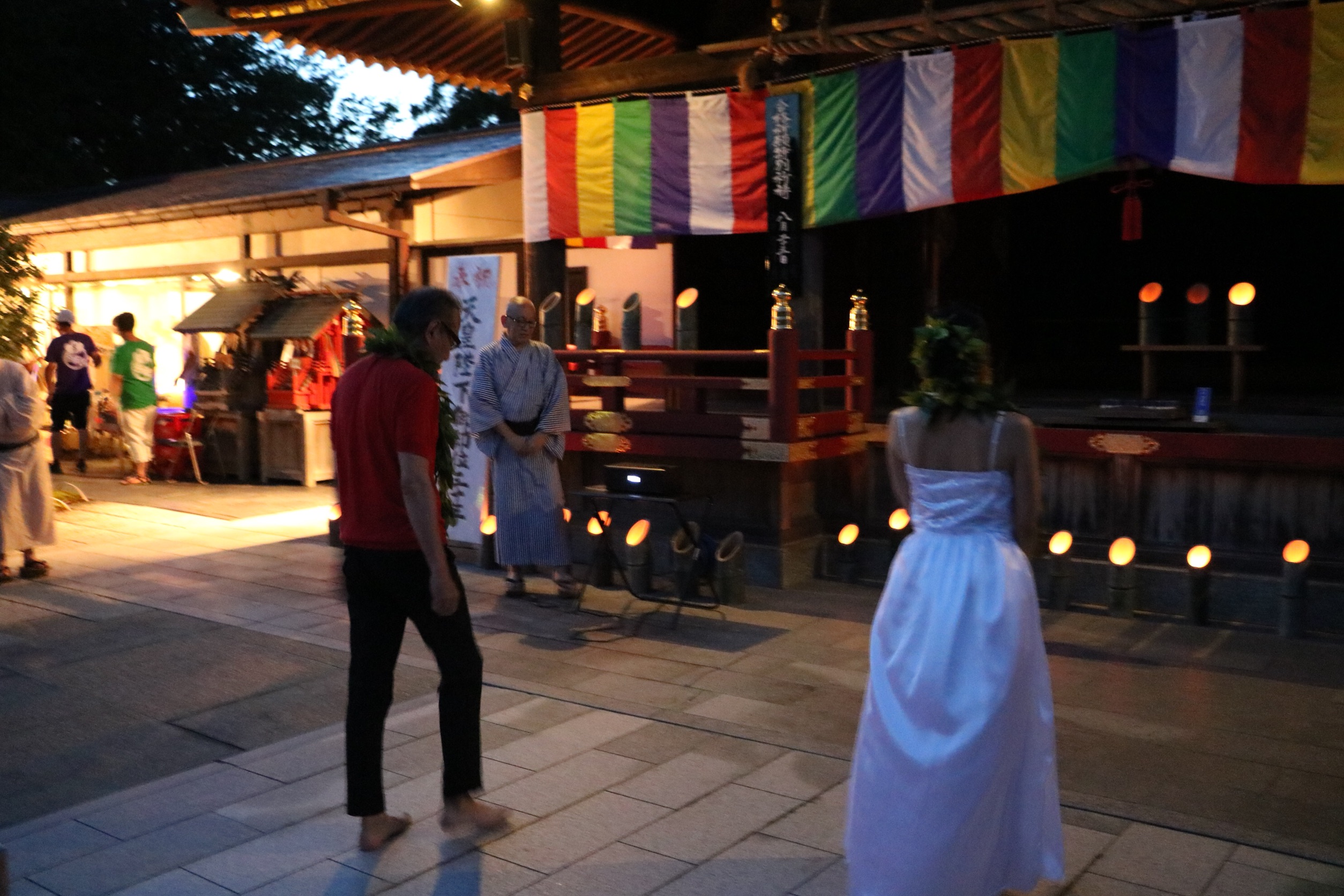 厳かな拝殿での御祓いの後、夏を惜しむ人々で埋め尽くされた境内。その中で、奉納として、ボサノヴァ歌手の犬塚 彩子さんの演奏があり、次に、フラの踊り子、瀬尾 幸恵さんのソロ、そして瀬尾さんと私のデュオと続きます。夕方6時、まだまだ明るかった空も、奉納が始まる頃には薄暗くなり、二人で踊る頃にはかなりの暗さに。その夕闇が、天の助けとでも言うのでしょうか。拙い私のフラを、とりあえず美しくまとめ上げてくれたようです。心地よい緊張感の中、無事に踊り終えることできました。