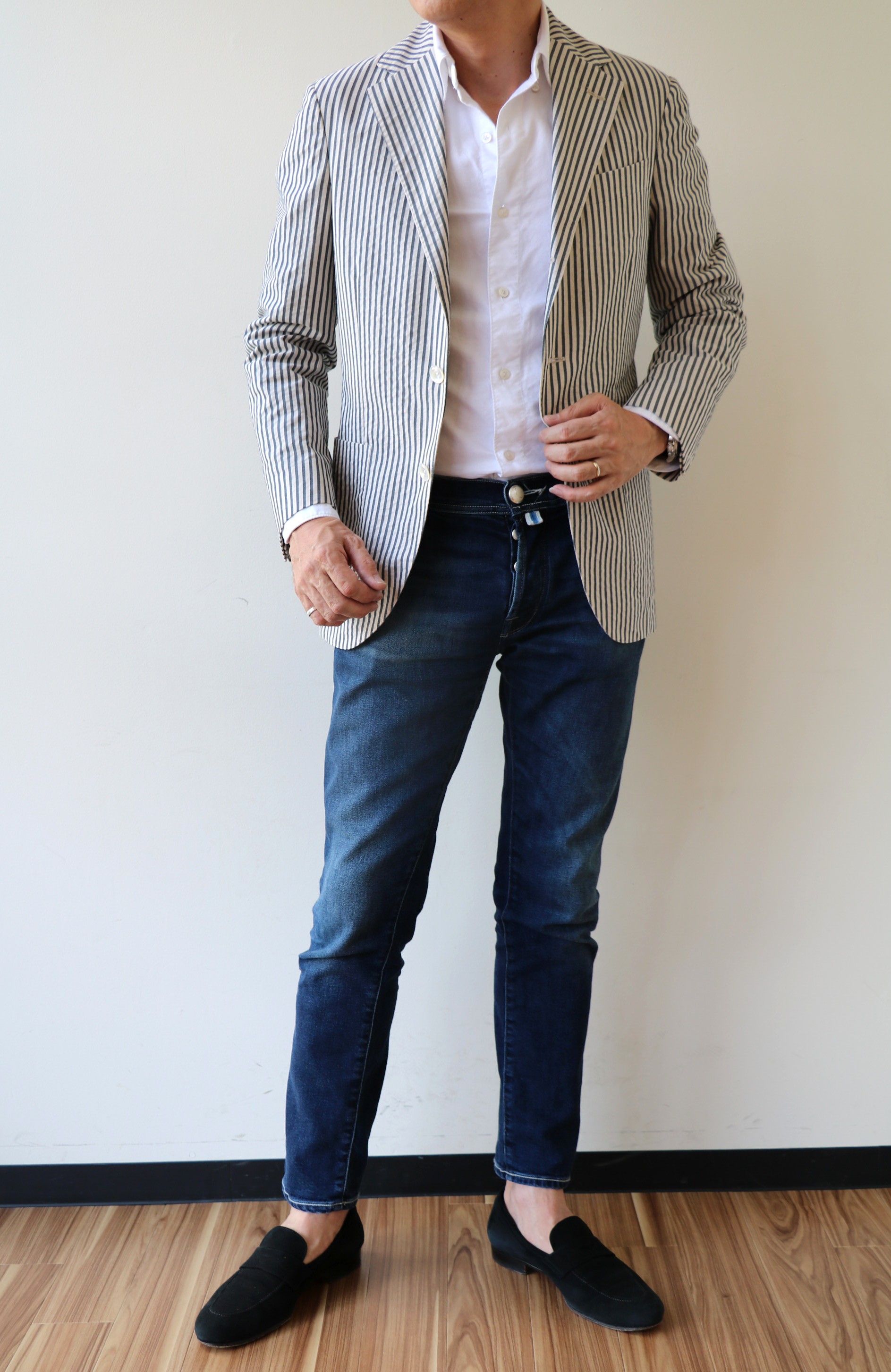 白シャツにジーンズ。足元は黒のスリッポンというシンプルな組み合わせですが、ジャケットが変わると雰囲気は変ります。更に、オフでの着こなしを考えるなら、