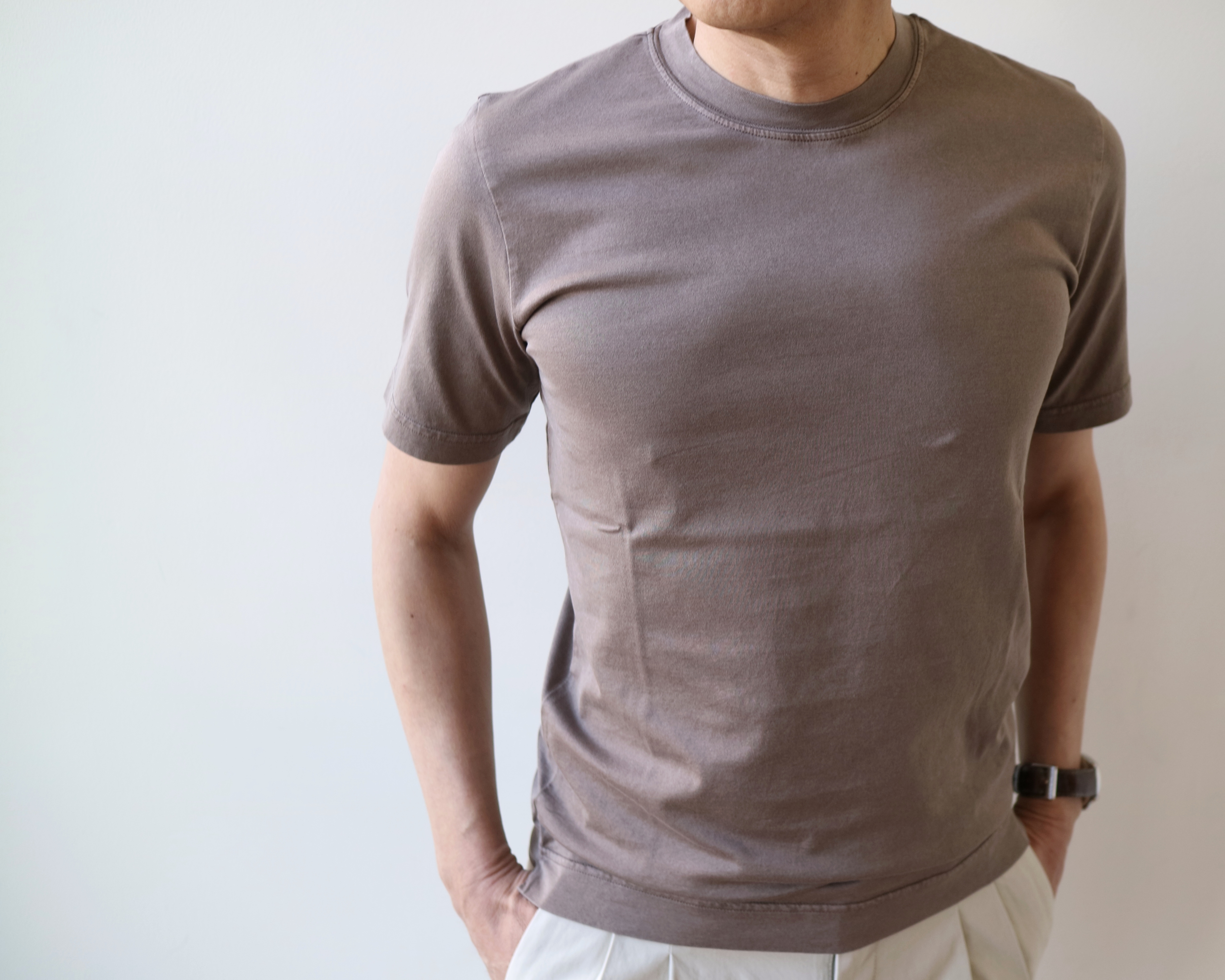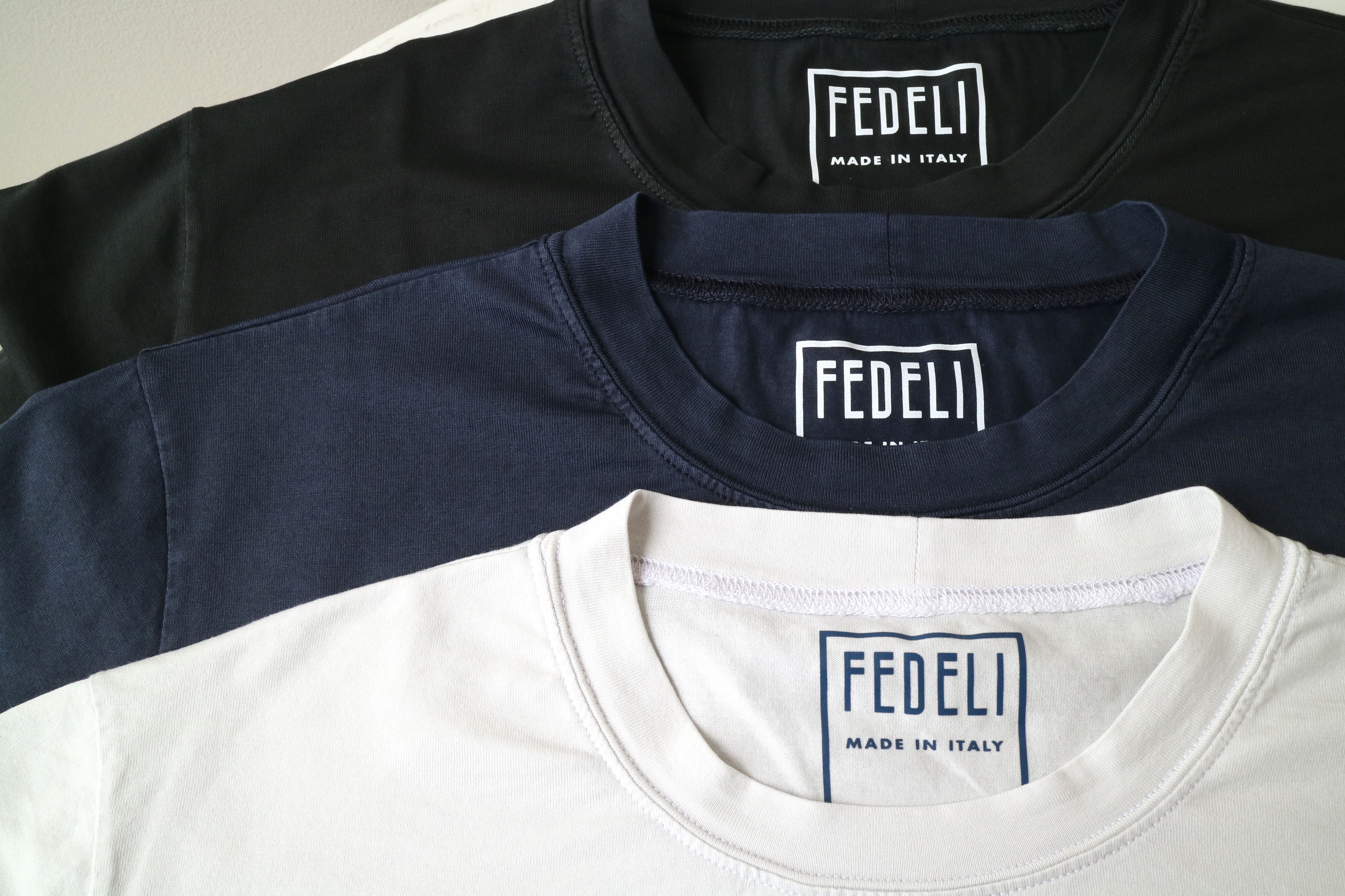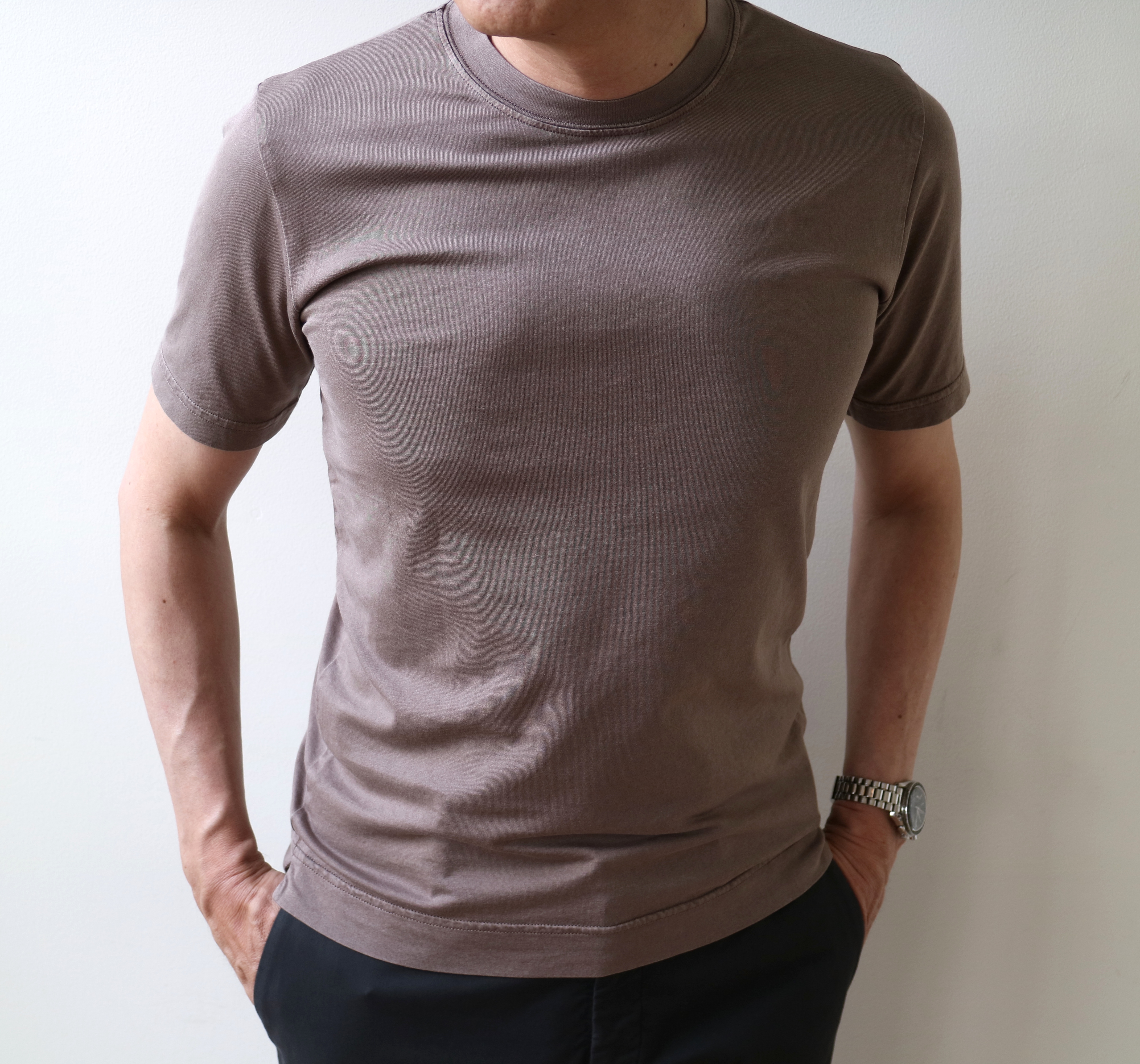 【FEDELI/フェデーリ】のTシャツ。ただのカットソーではありません。使っている素材が凄いのです。高級綿の代表格、エジプト綿(他に海島綿とピマコットン)。その中でも、最も繊維長が長く、一本一本が細く、全体の生産量の0.001%しか生産されない希少な「GIZA45」。さらに原綿は、全て手作業で摘み取られ、慎重な工程を経なければなりません。サイズ46が完売の為、44をタイトに着ております。