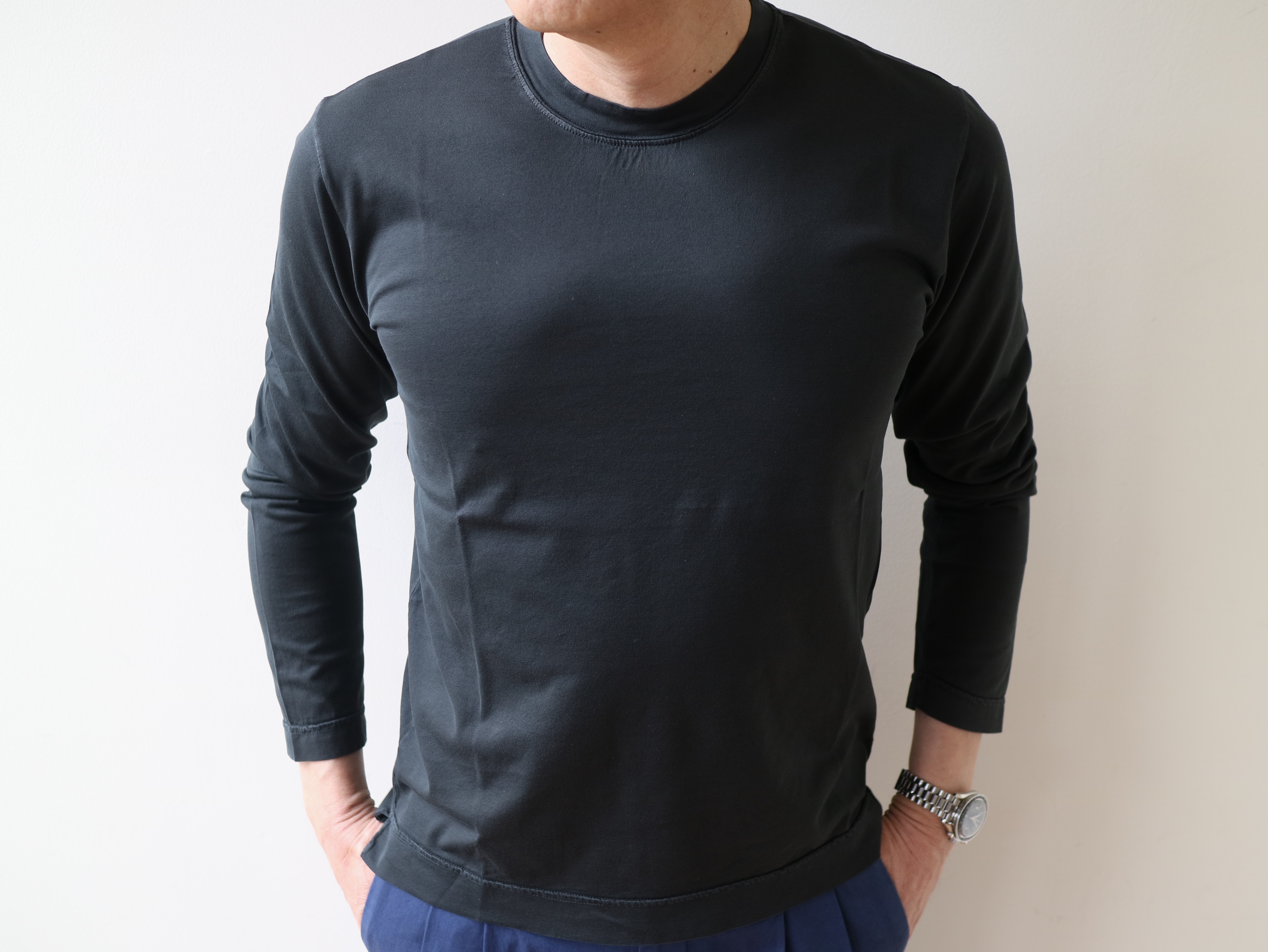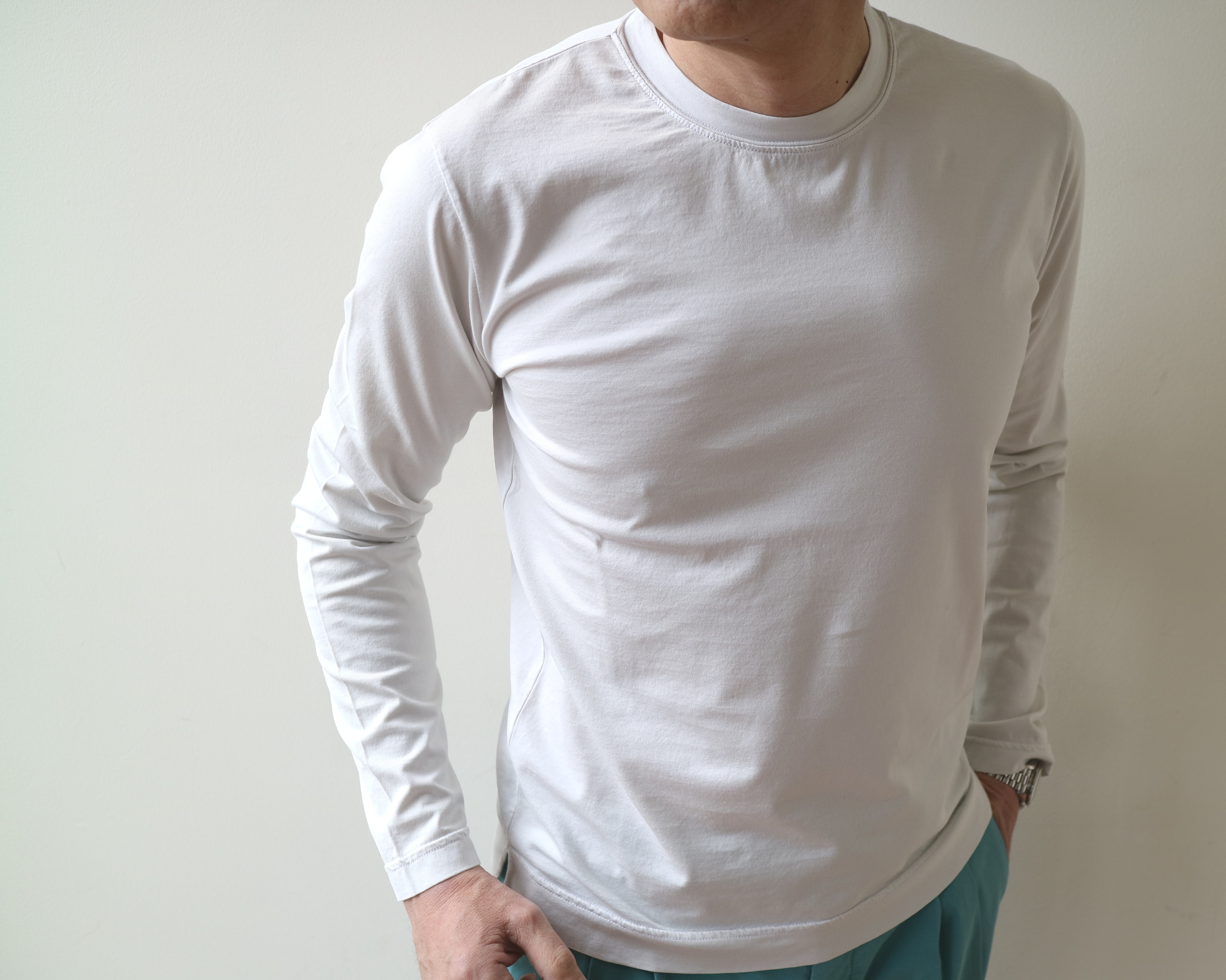 他に備えたいのが、【FEDELI/フェデーリ】のロングスリーブTシャツ。半袖と同じエジプト綿の「GIZA45」を使っています。半袖ではなく、長袖を選ぶ理由は、気温変化への対応もありますが、上着を羽織った際の袖の通りのよさと肌触り。また、車での移動が多い旅であれば、車内に差し込む陽射し防止です。あの陽射しの強さを運転中に経験された方は多いはず。つい影を探してしまいます。