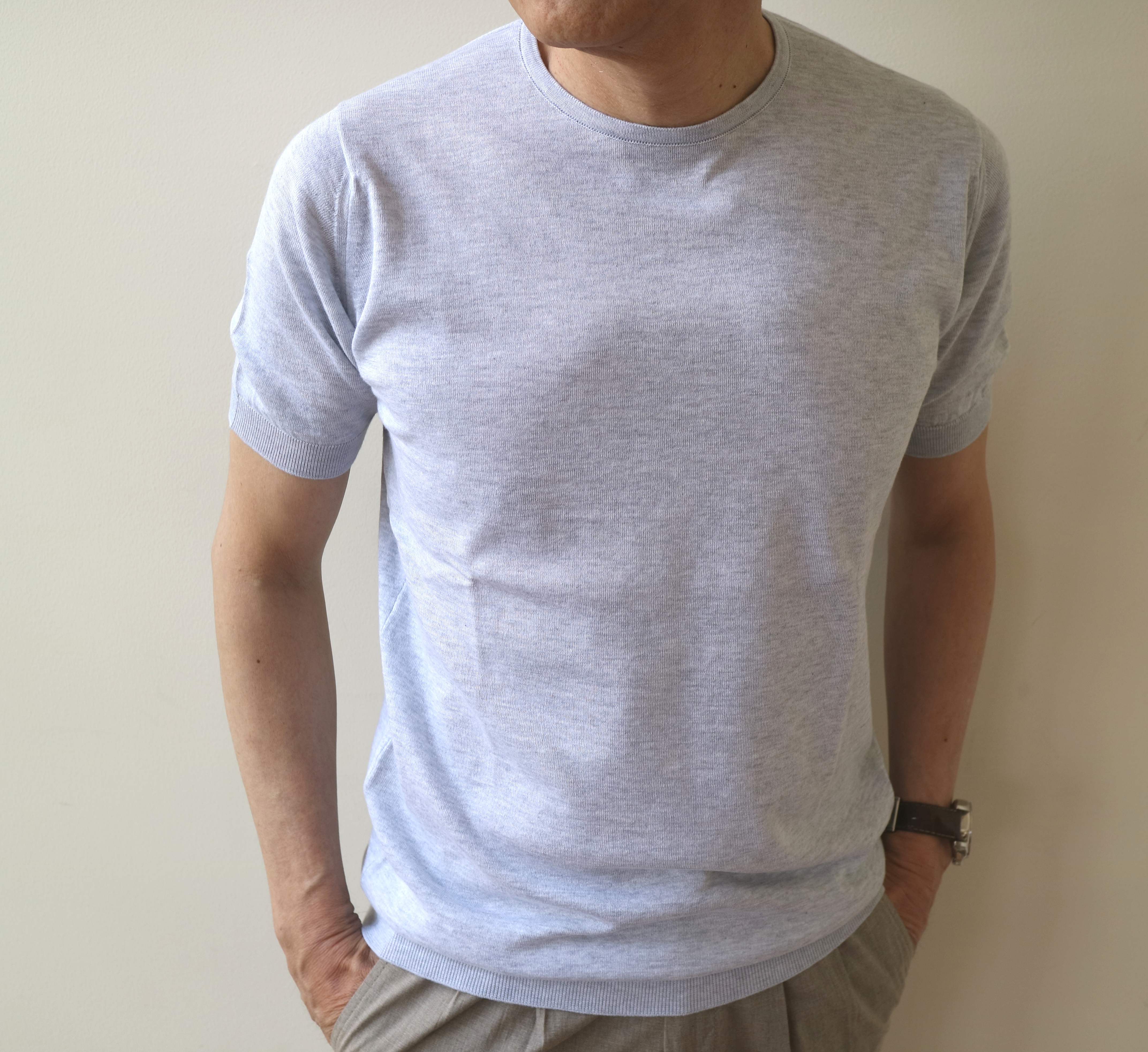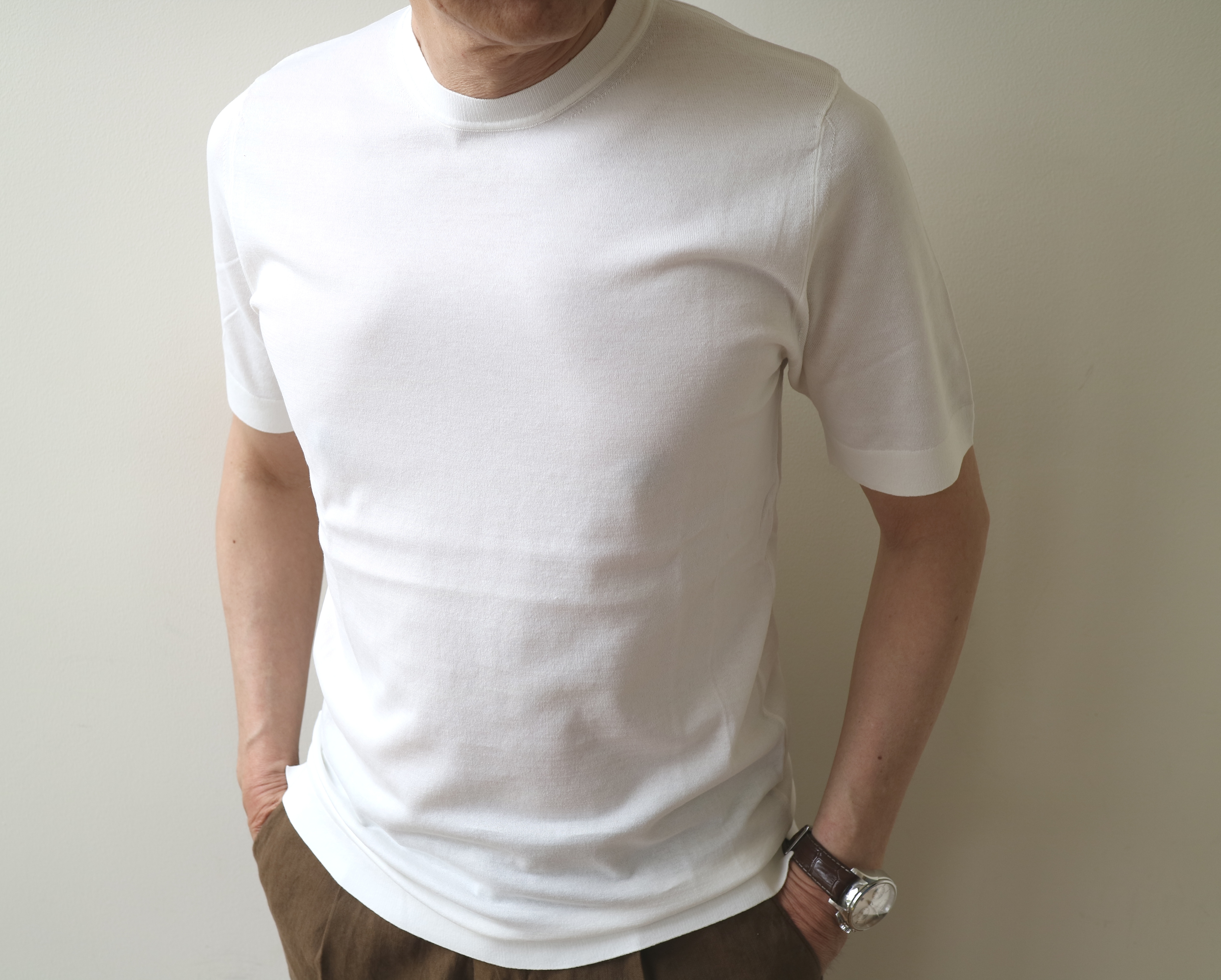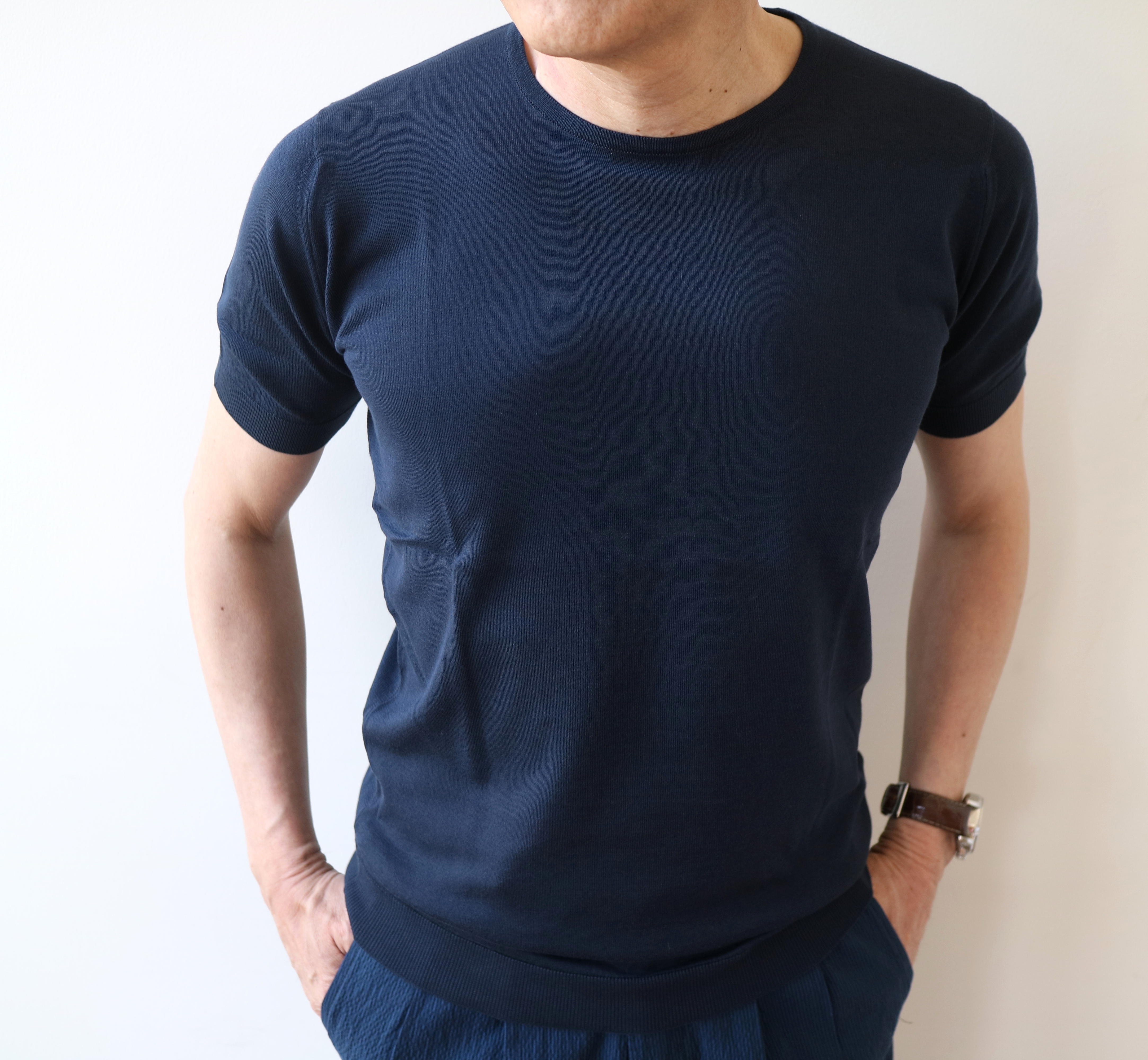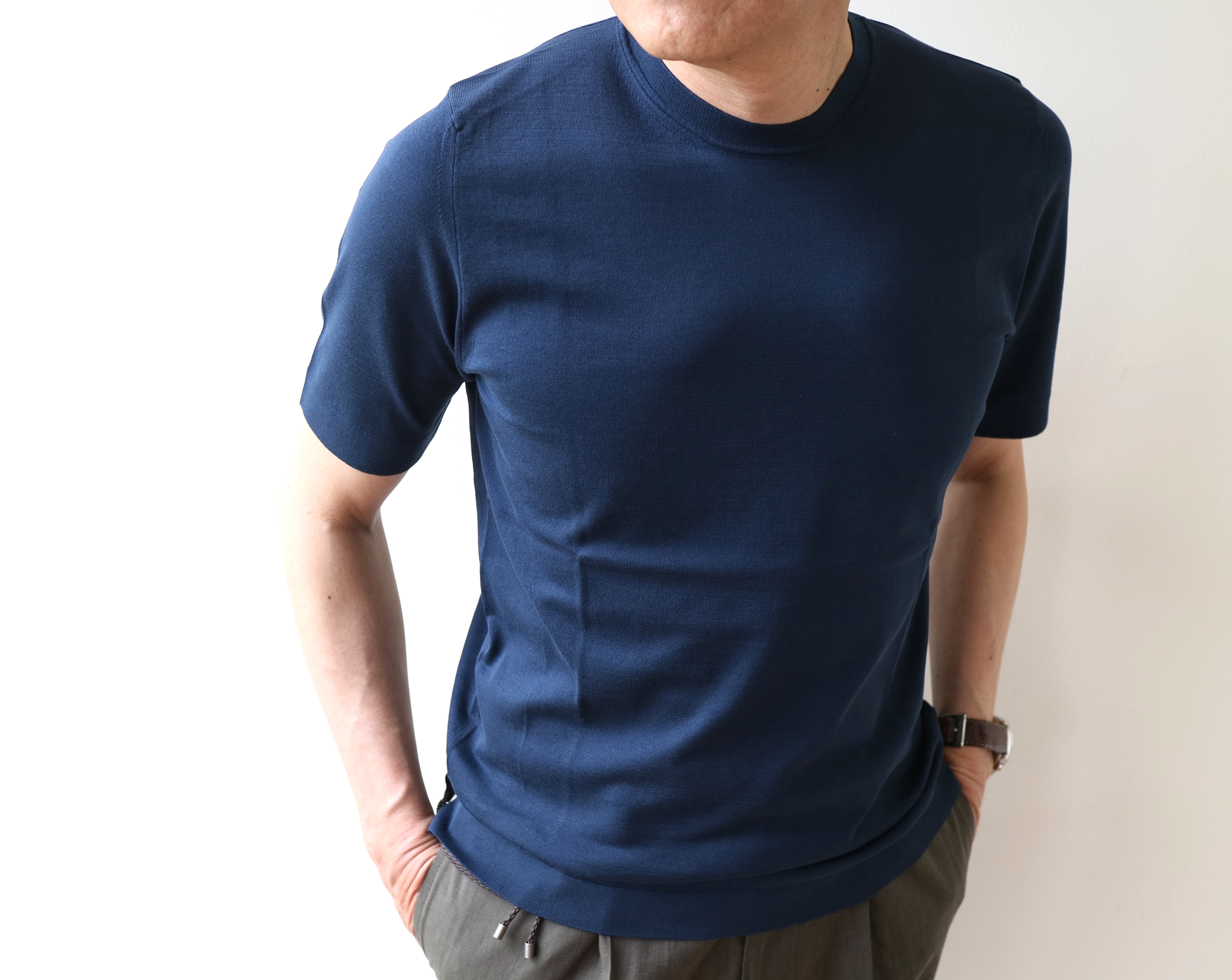 De Petrillo(デ ペトリロ)のジャケットに合わせているのは【JOHN SMEDLEY/ジョンスメドレー】。もう説明の要らない英国ニットブランドです。昨年より、日本フィットの24ゲージの「S4071」がコレクションに加わることで選択肢が増えましたが、オリジナルのスタンダードフィツトの魅力は損なわれていません。シーアイランドコットンを使った30ゲージニットの着心地は言うまでもなく、今までは短所と思われていた着丈の長さも、今のゆとり感を求めるなら、この長さは逆に長所になるでしょう。