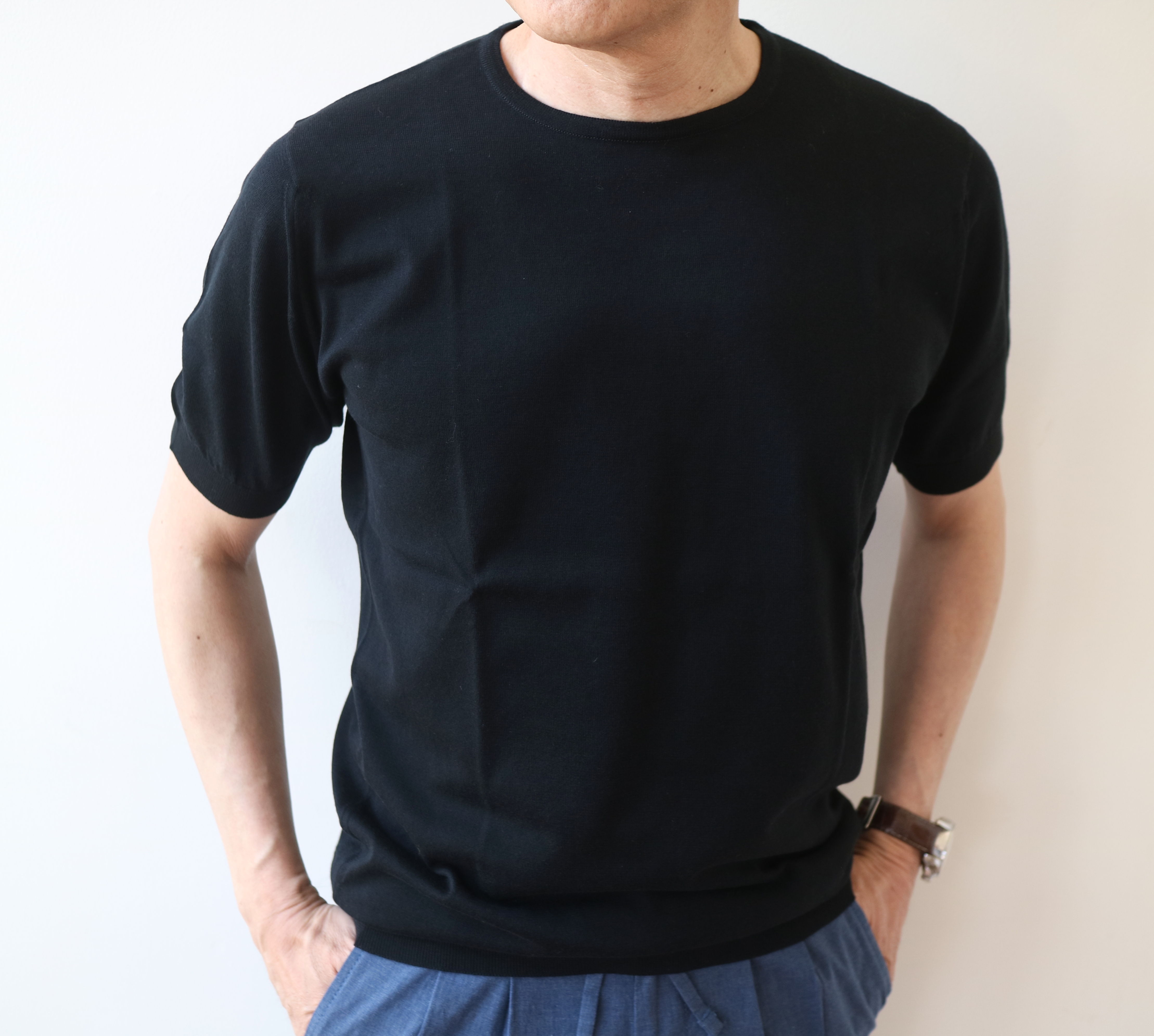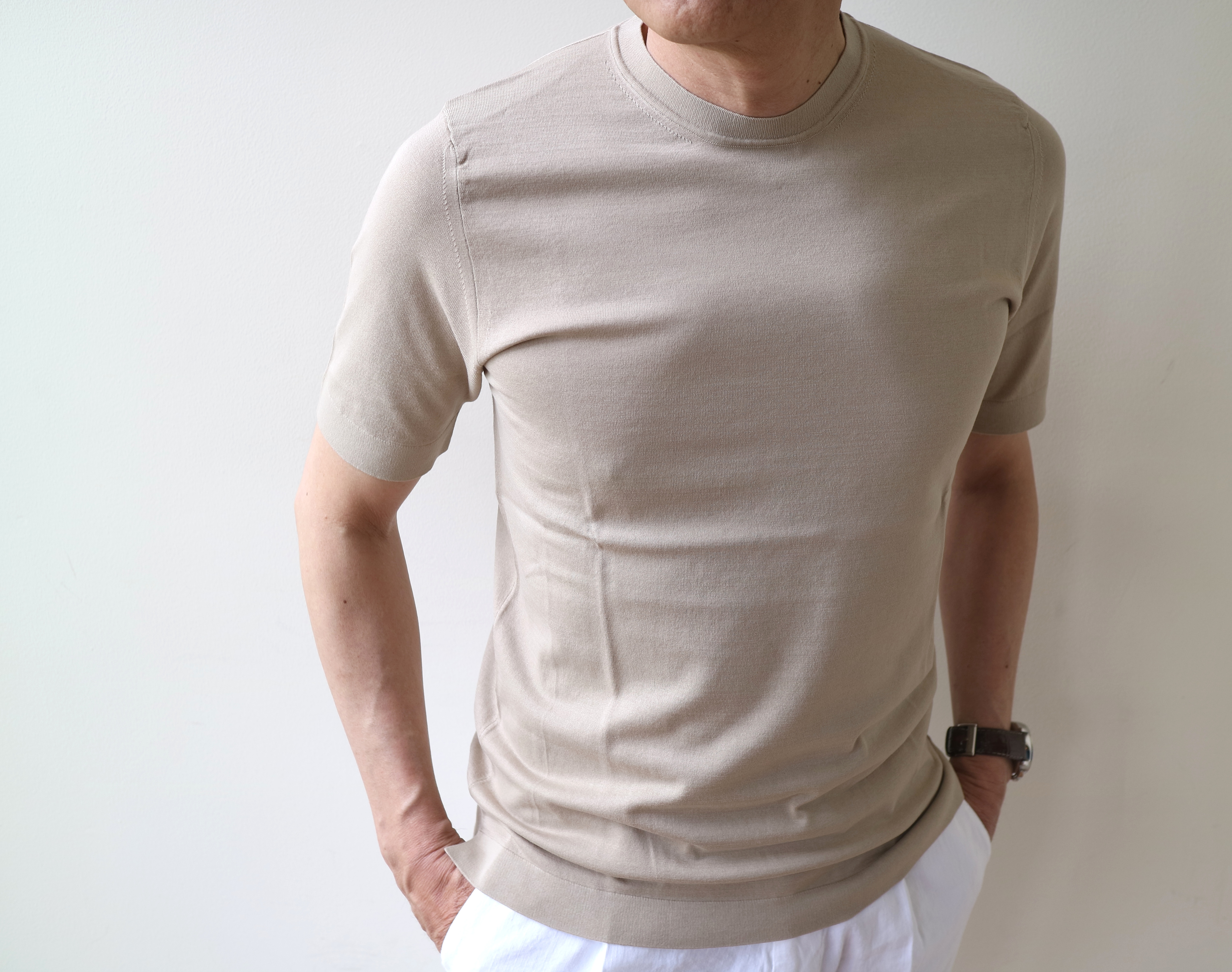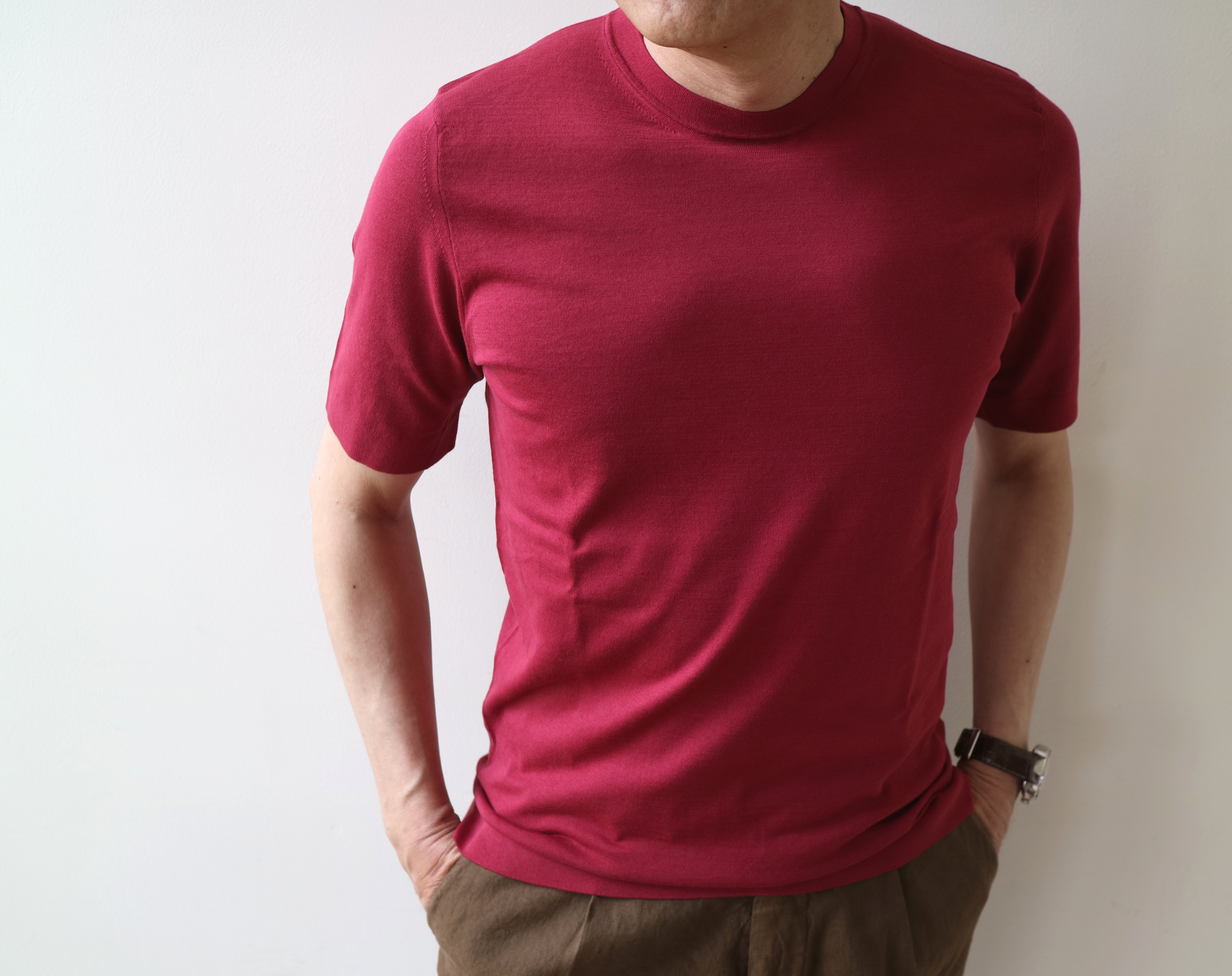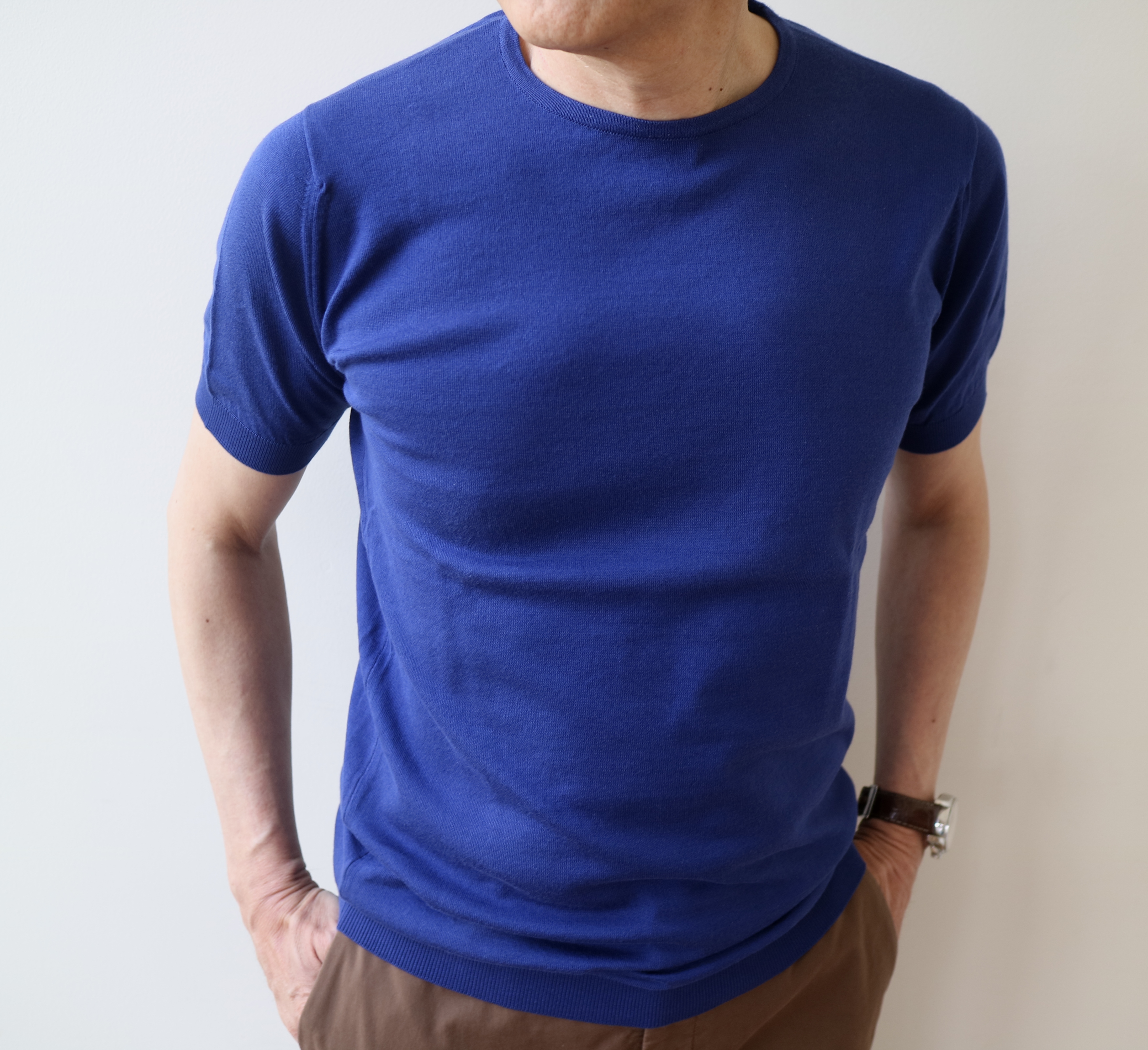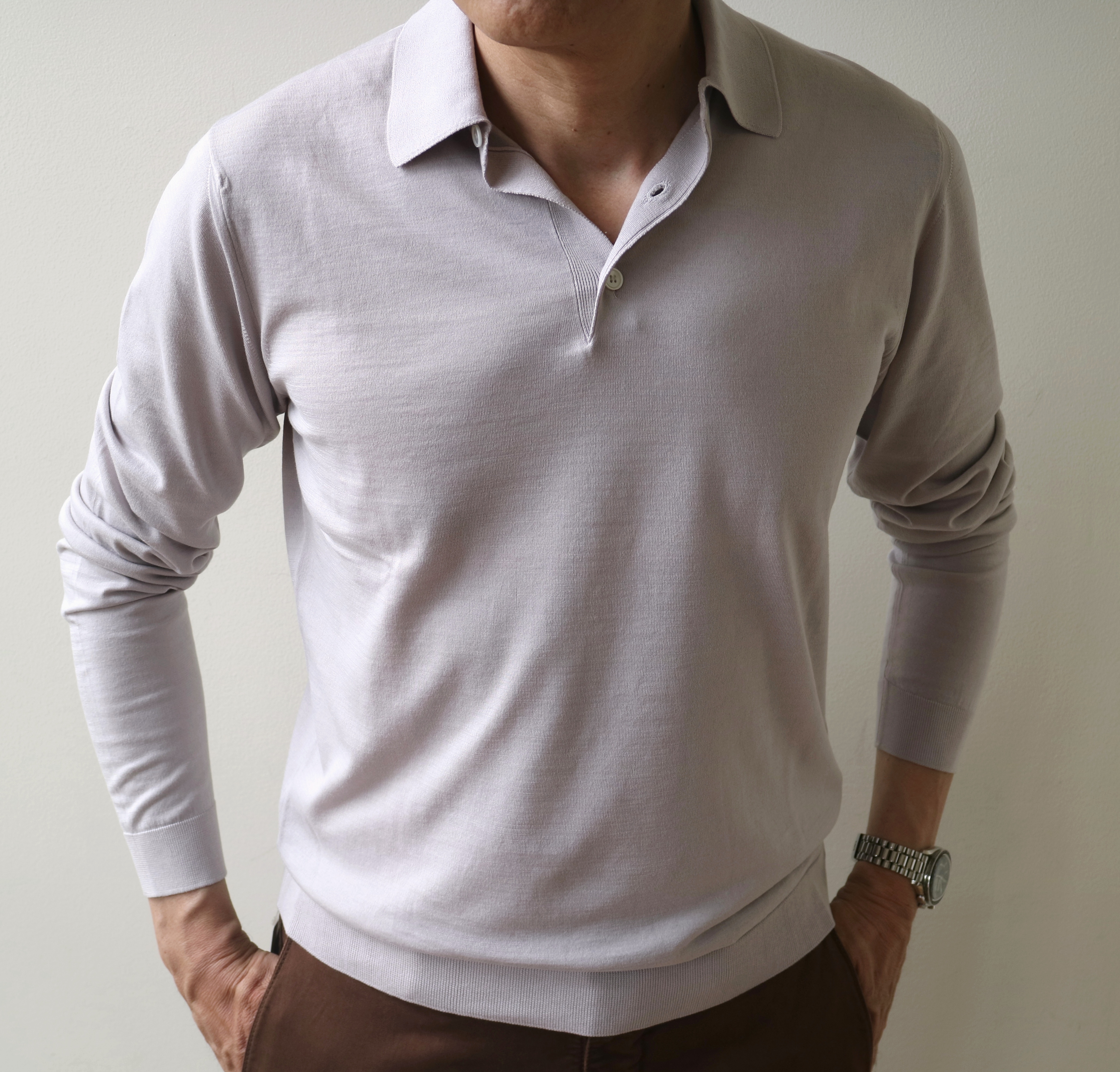 De Petrillo(デ ペトリロ)のジャケットに合わせているのは【JOHN SMEDLEY/ジョンスメドレー】。もう説明の要らない英国ニットブランドです。昨年より、日本フィットの24ゲージの「S4071」がコレクションに加わることで選択肢が増えましたが、オリジナルのスタンダードフィツトの魅力は損なわれていません。シーアイランドコットンを使った30ゲージニットの着心地は言うまでもなく、今までは短所と思われていた着丈の長さも、今のゆとり感を求めるなら、この長さは逆に長所になるでしょう。