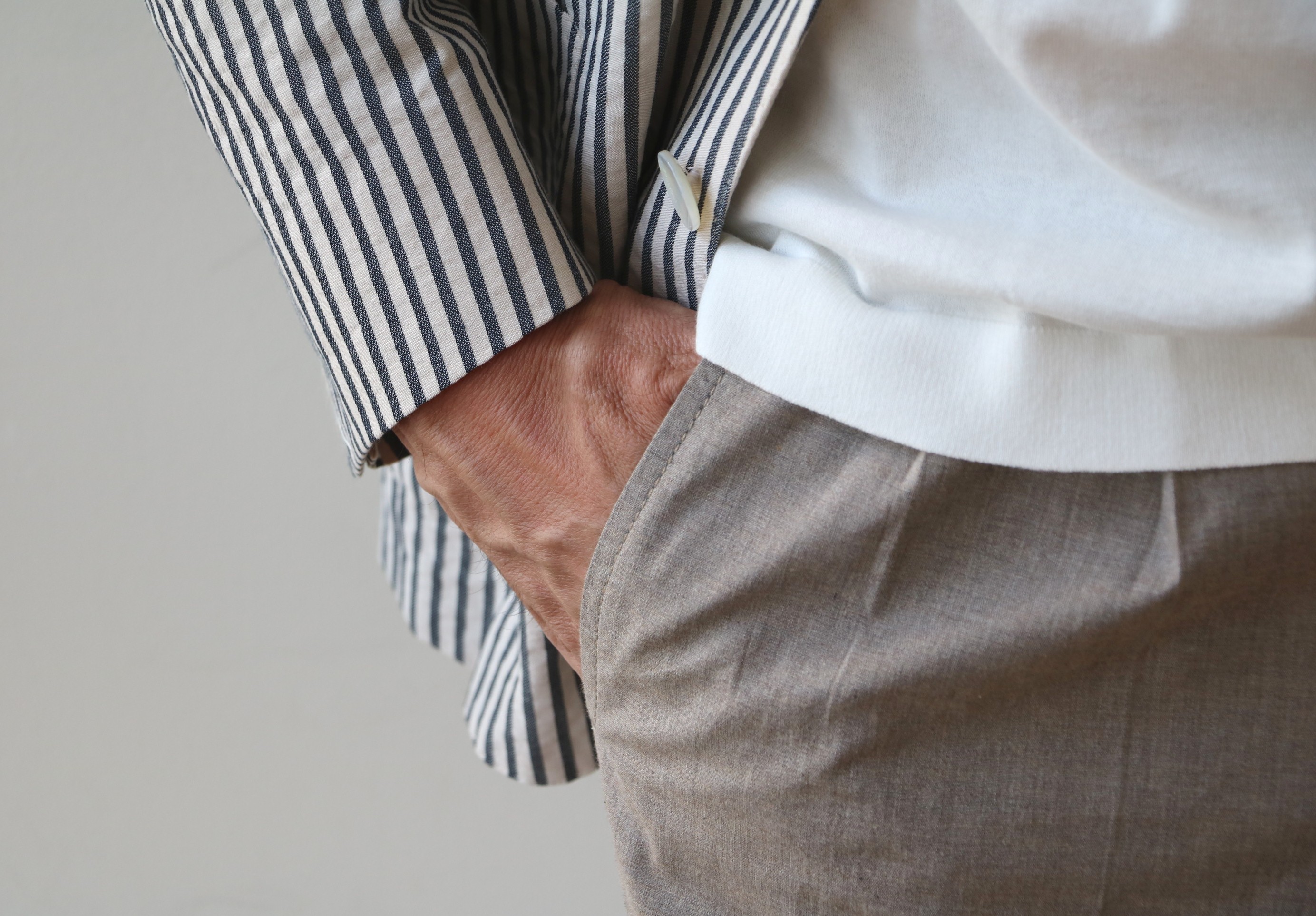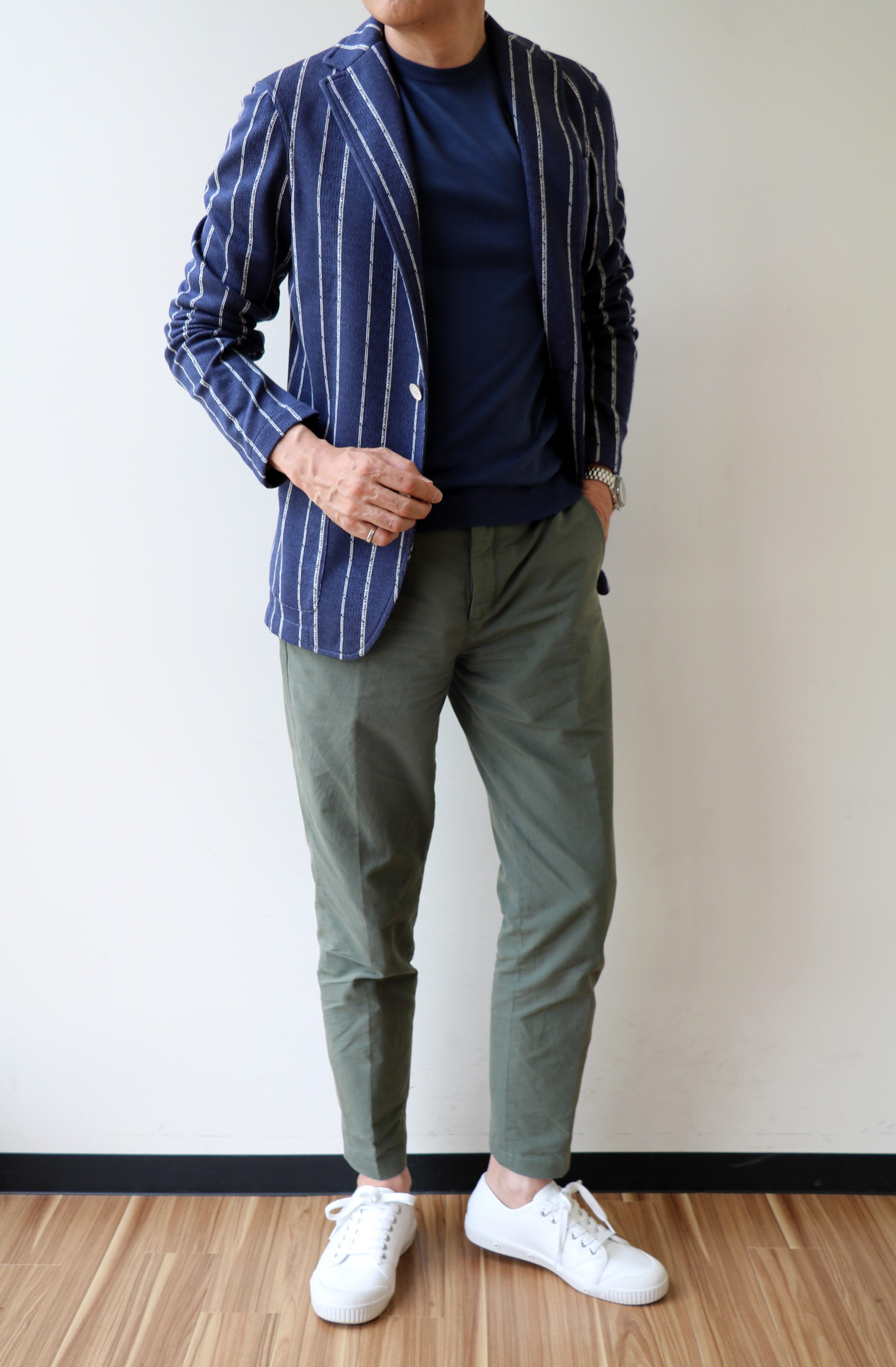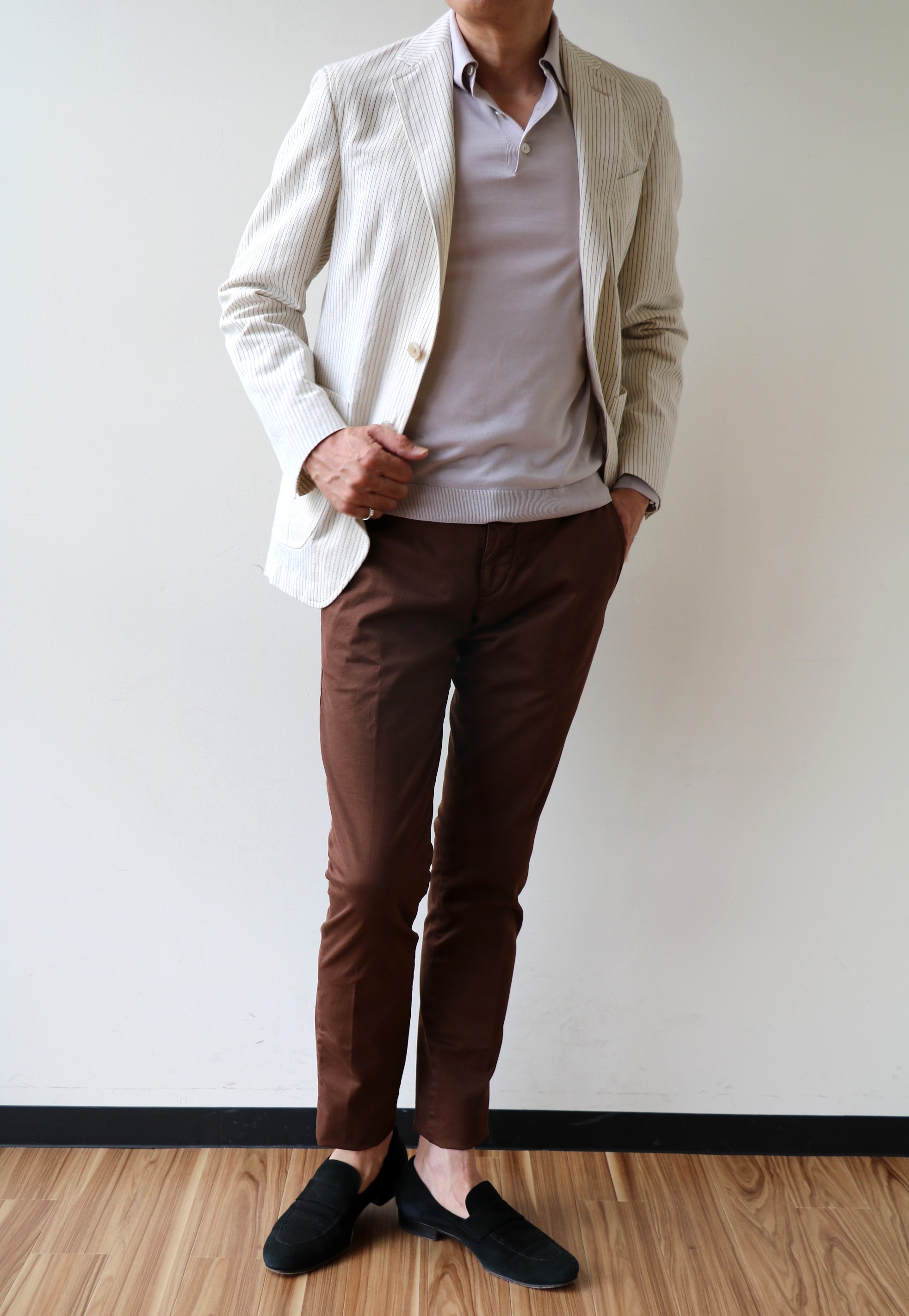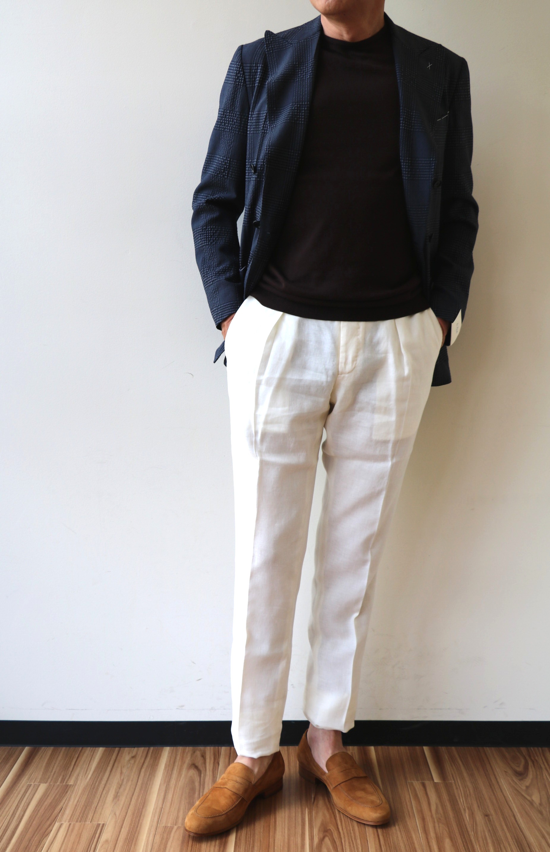 ジャケットの共通点は、素材こそ異なりますが、凹凸感のあるシアサッカー。夏のジャケットとしては最適です。また、インナーに合わせたのが、どちらもハイゲーのニット。カジュアルブランドが作るジャケットなら、Tシャツでもいいのですが、やはりクラシコイタリアブランドが作るジャケットには、上品さを求めて、ニットがお勧めです。そこで、本日はハイゲージのニットに焦点を当てて、ご案内していきましょう。参考までに、穿いているのは、VIGANO(ヴィガーノ)のドローコード付きパンツとINCOTEX(インコテックス)の麻パンツです。
