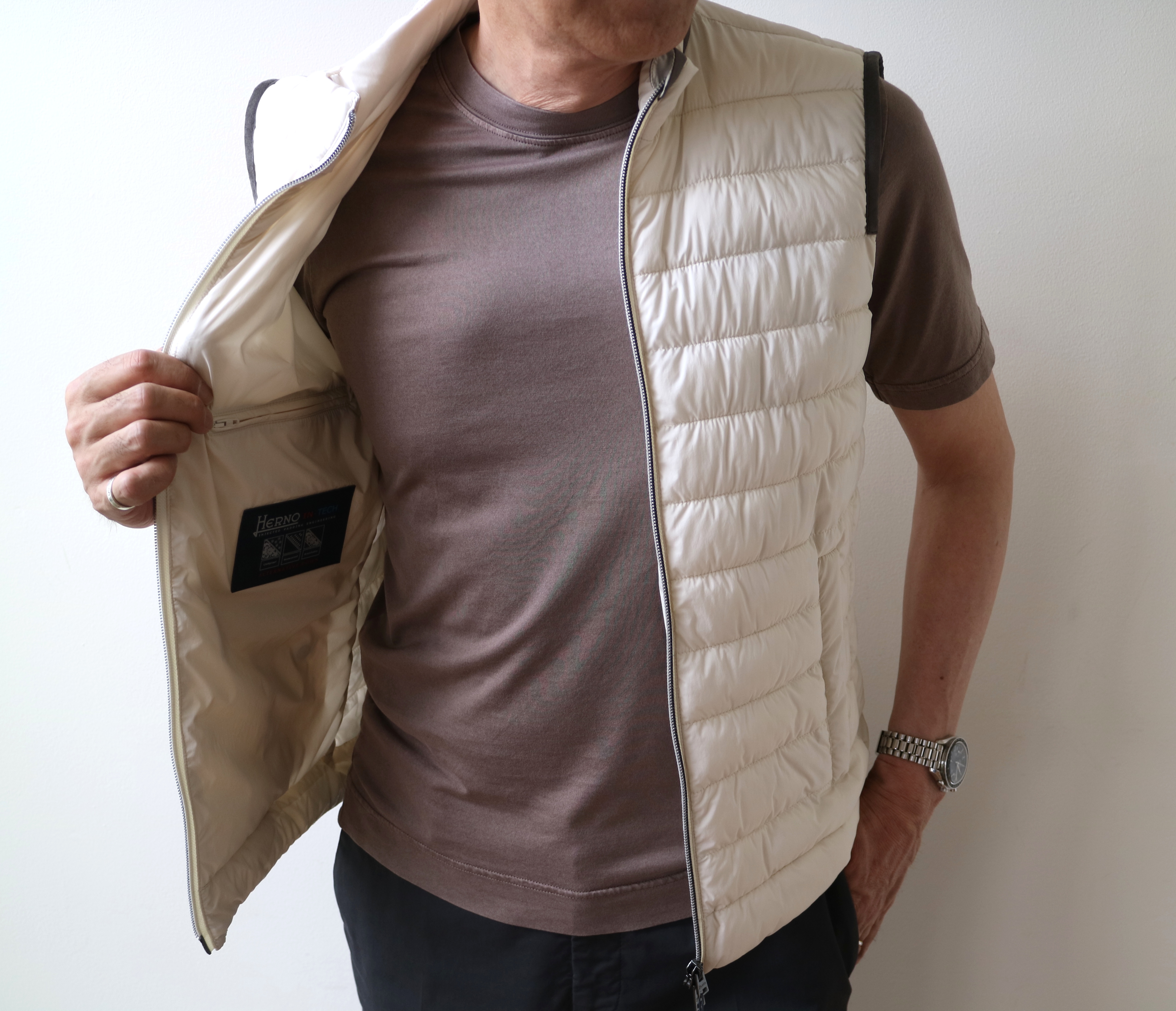 半袖のTシャツにダウンベスト。季節の異なるアイテムと思うかもしれませんが、この2つ、気温の振り幅の大きい、今の時代?が求めているんです。ダウンベストはHERNO(ヘルノ)のものですが、本日ご提案したのが、