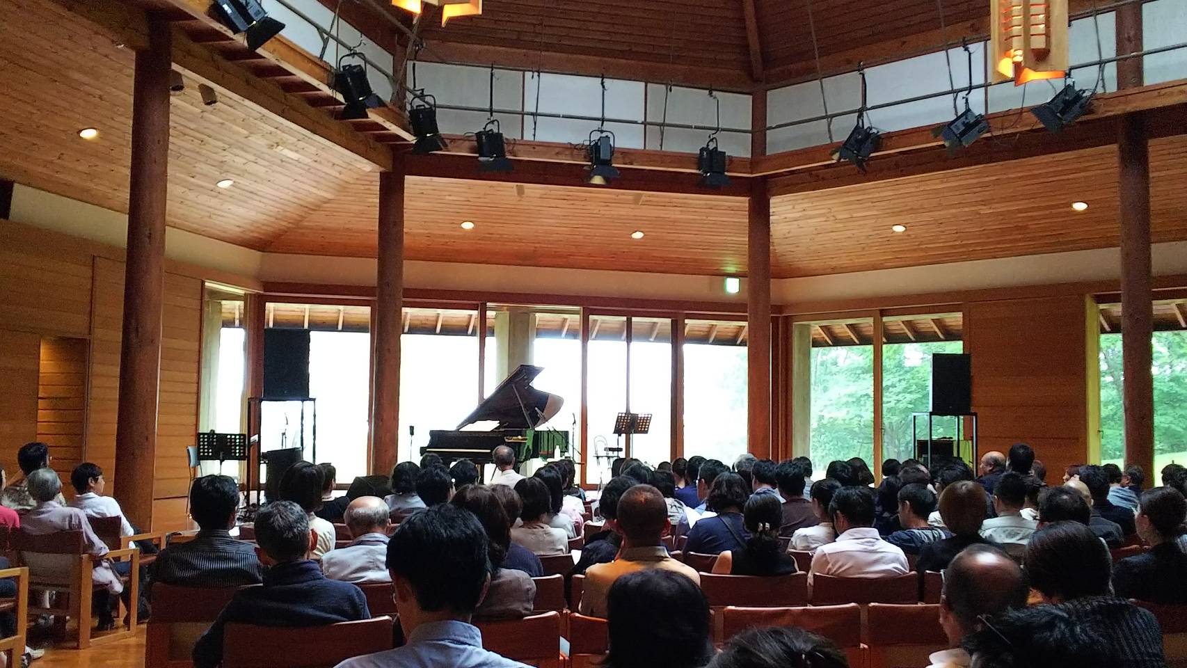 場所は、八ヶ岳高原ロッジの敷地内にある音楽堂。開演中の撮影は禁止のため、開演前の写真です。雨風が強くなる中、250席の会場は、ほぼ満席。CDでは聞くことの出来ない、この場所でしか出会えない音に魅了されてきました。感心したのは、ホテル側の対応の見事さ。ホテルから音楽堂までの移動は、シャトルバスでしたが、全く濡れることもなく、会場入り。帰りもスムーズです。お客様の質も高く、心地の良い大人のコンサートを満喫して参りました。