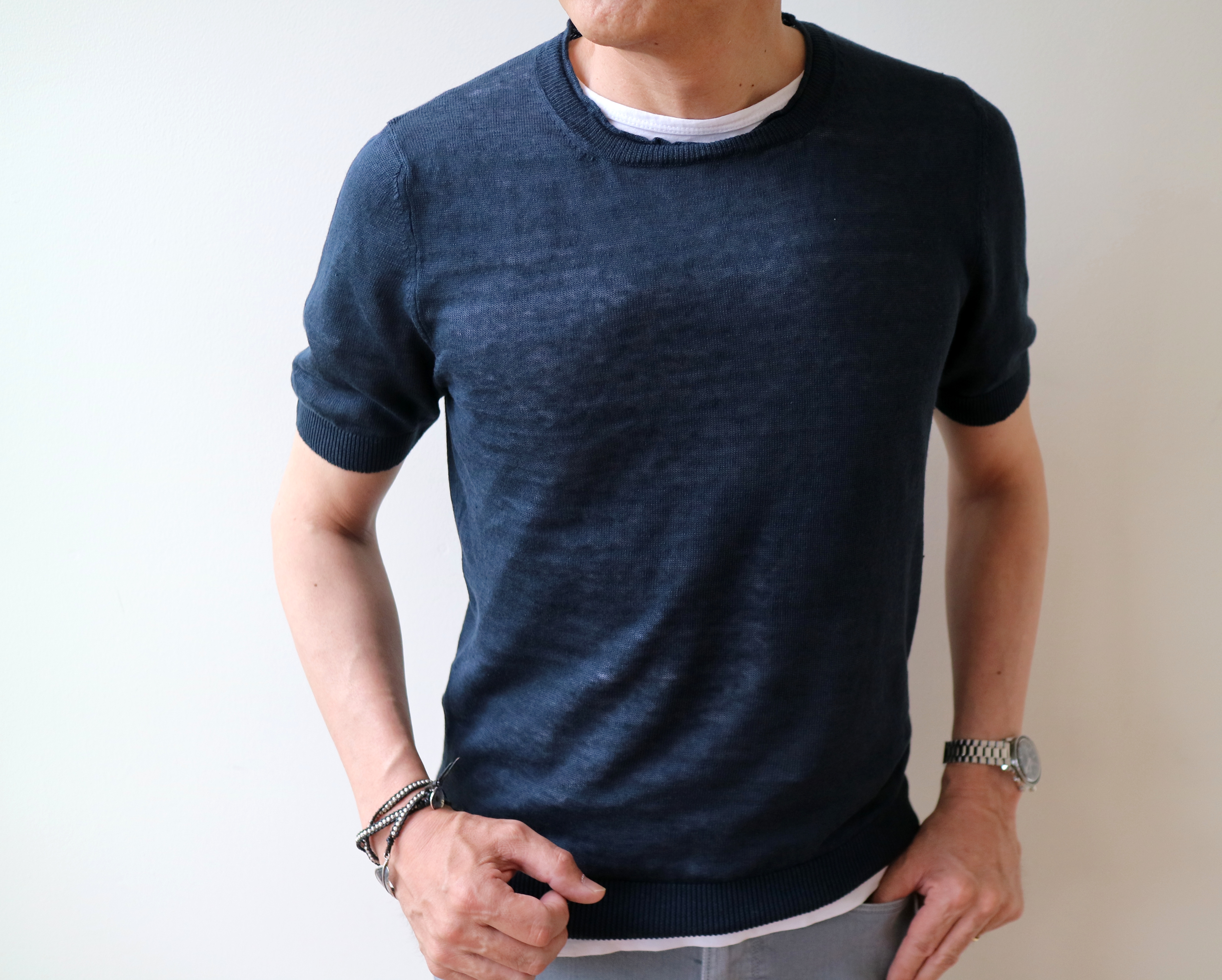 ショートスリーブのニットですが、インナーにカットソーを合わせて、重ね着していただくと様になります。メタリックカラーと相性の良いホワイトとグレイを使ってコーディネートです。合わせたパンツはPT05、手に持ったシャツジャケットはGiannetto、靴はFERRANTEです。
