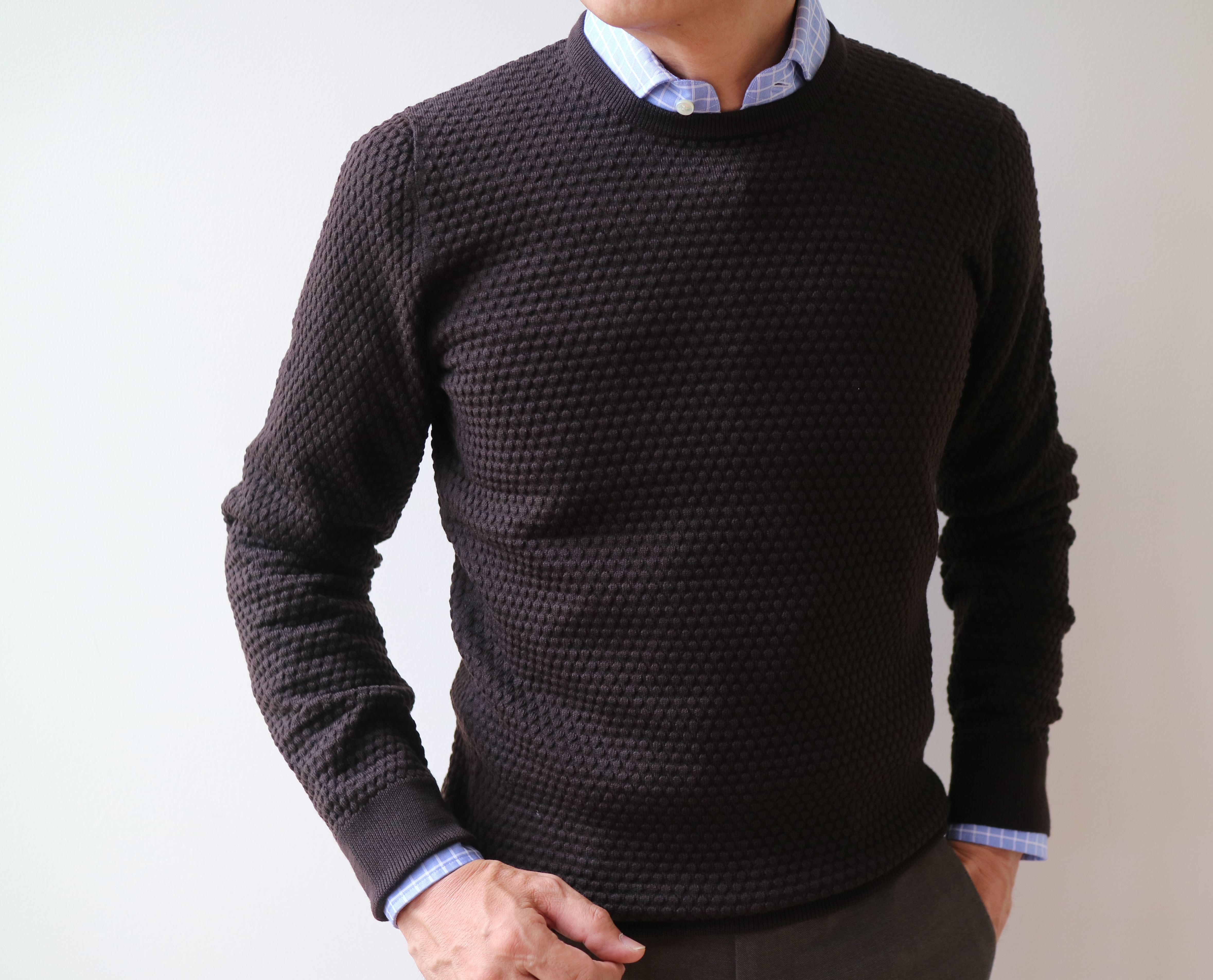 本日のご案内は、引き続き、【Gran Sasso/グランサッソ】。昨日、忘れてしまった「スウェットタイプ ハイゲージクルーネックセーター」のブラウン。先程、掲載しましたので、巻戻してご覧ください。