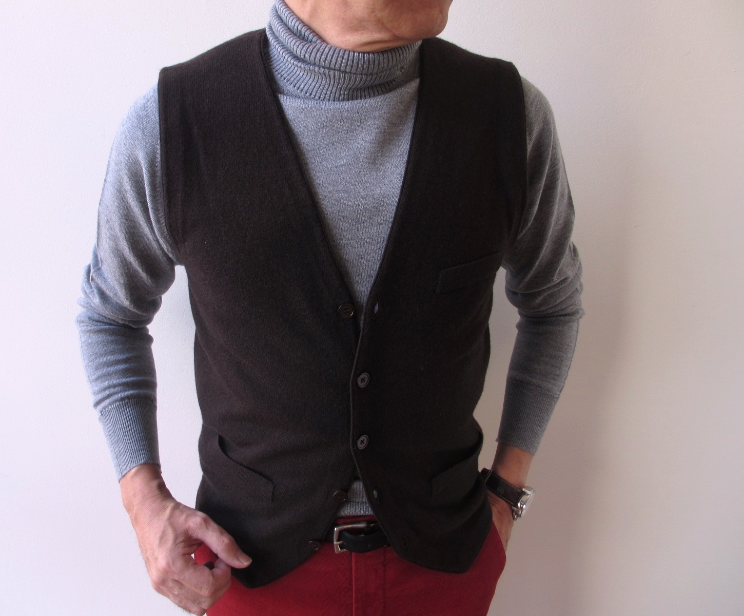 ジャケットのインにタートルネック。そこにブラウンのニットジレを入れることで、Vゾーンに変化がつきます。真冬の寒さ対策にも役立ちます。