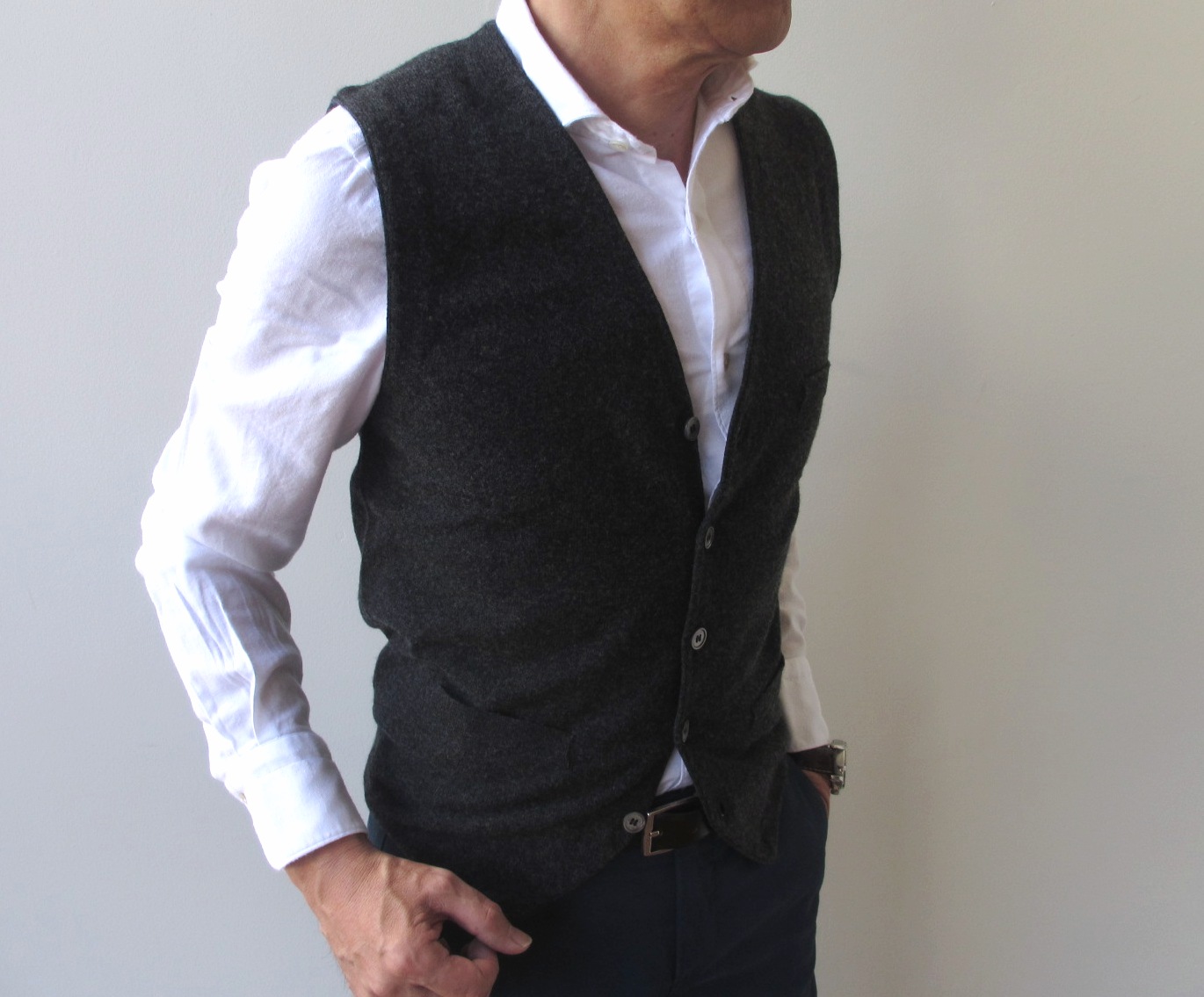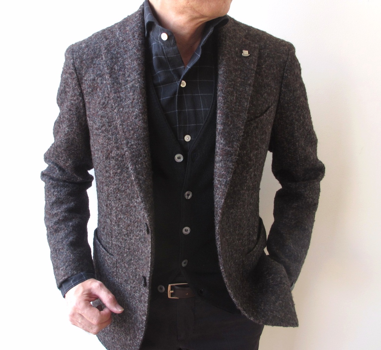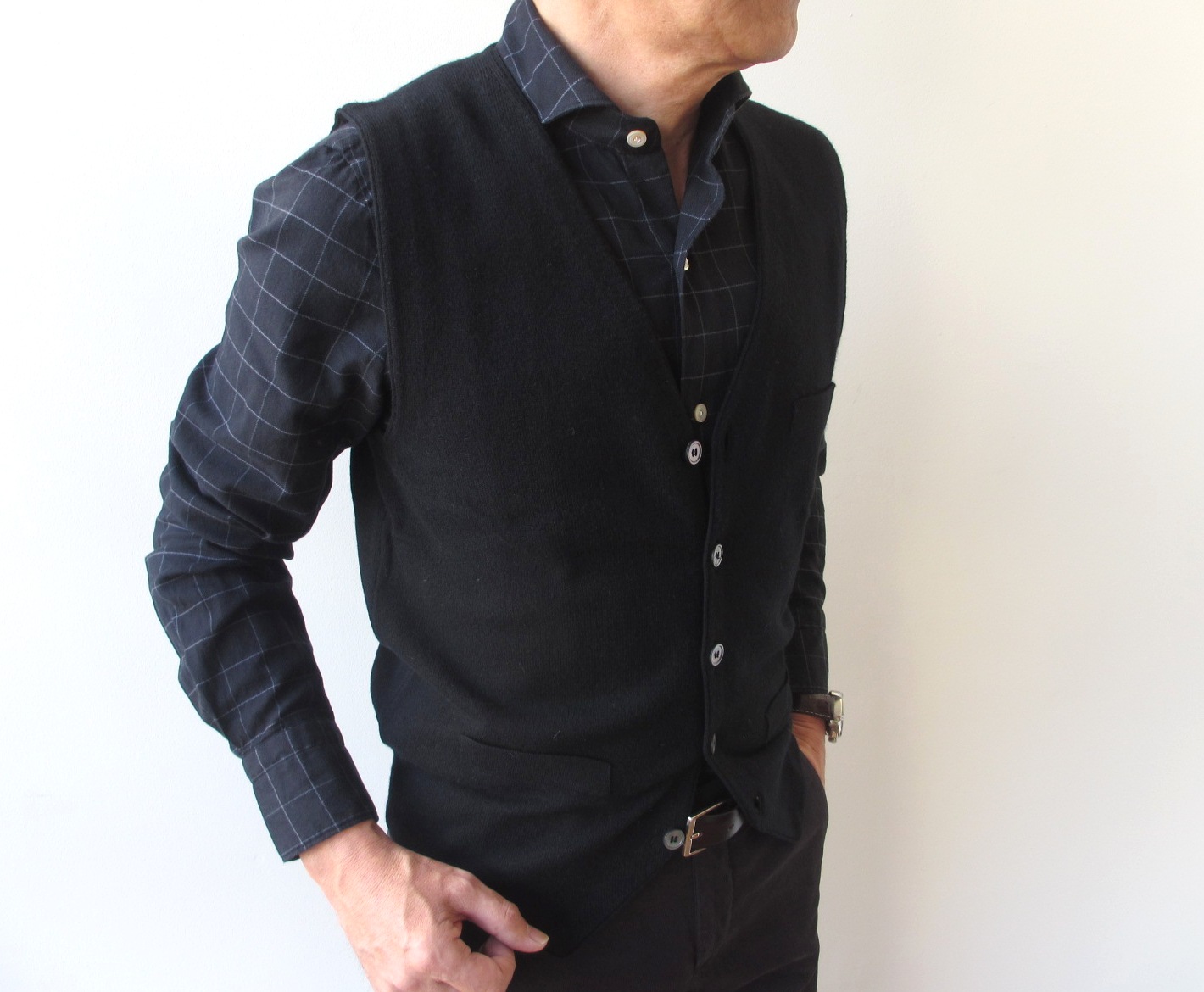 ブラウンとグレイのダークカラーにブラックのニットジレを入れてみました。全体のトーンを更に下げ、シックな装いに仕上がります。