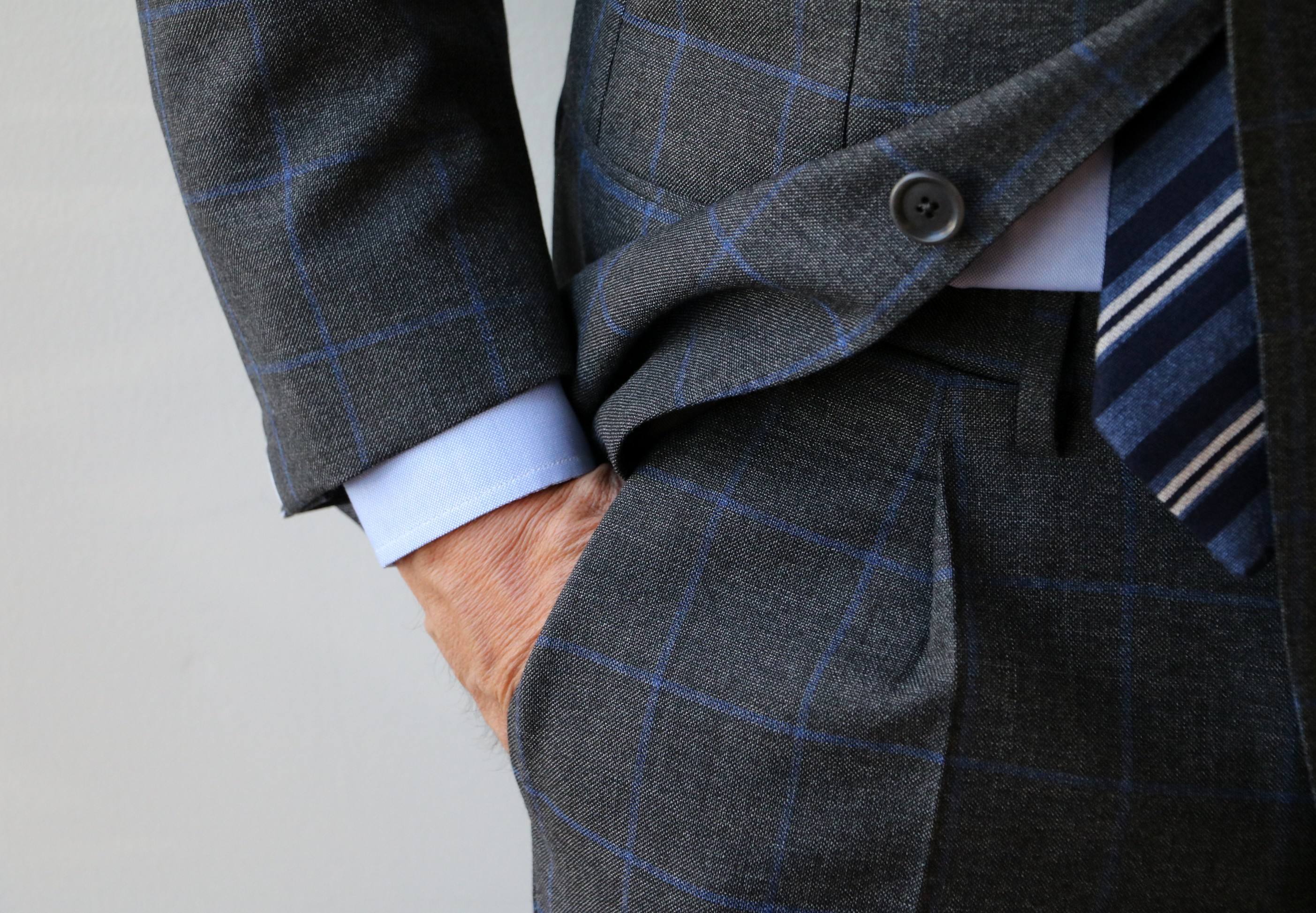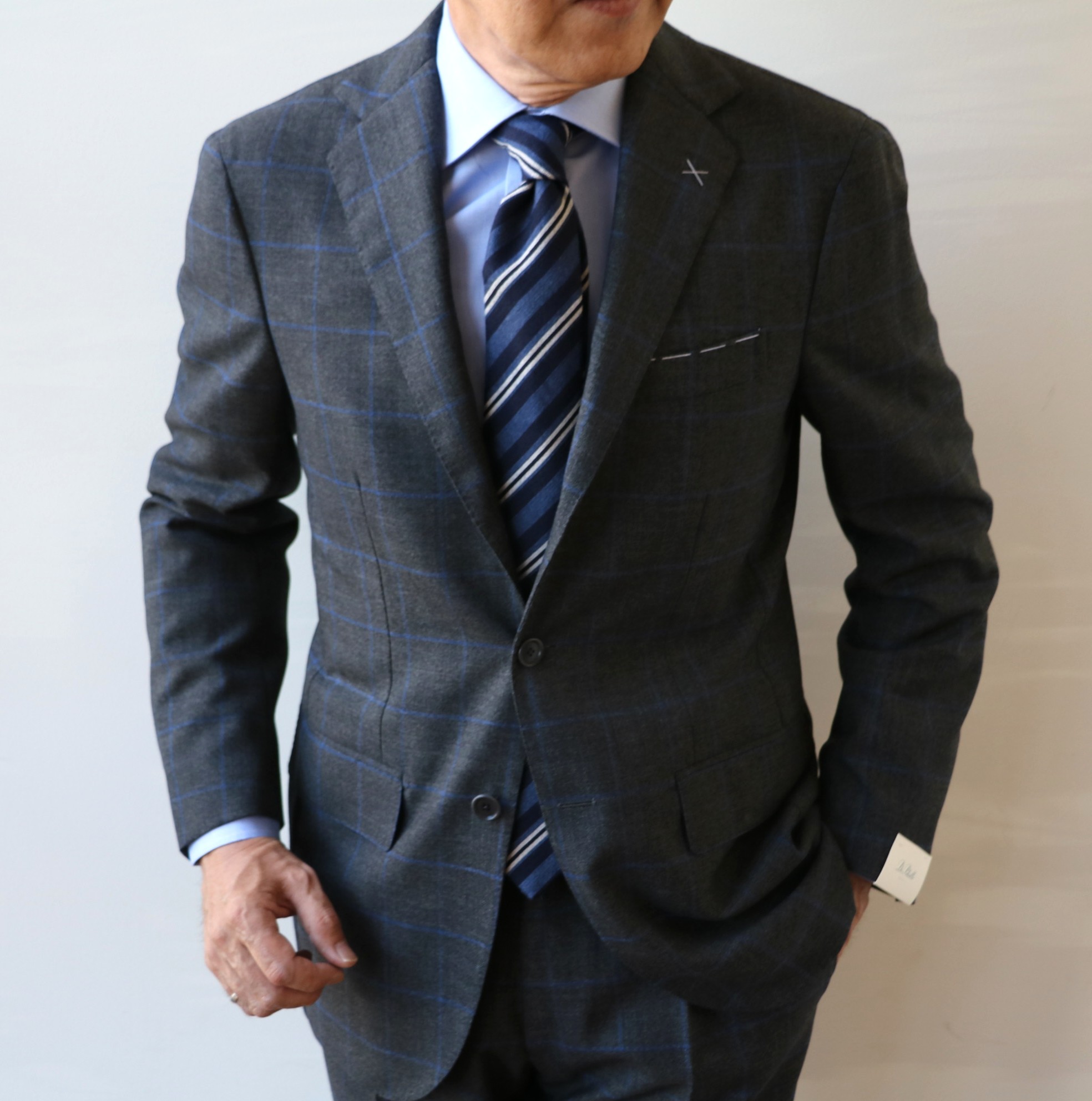 毛羽の立たない、クールな雰囲気を持つグレイベースに、青のウィンドウペン柄。物静かですが、できるオトコを演出してくれるスーツです。