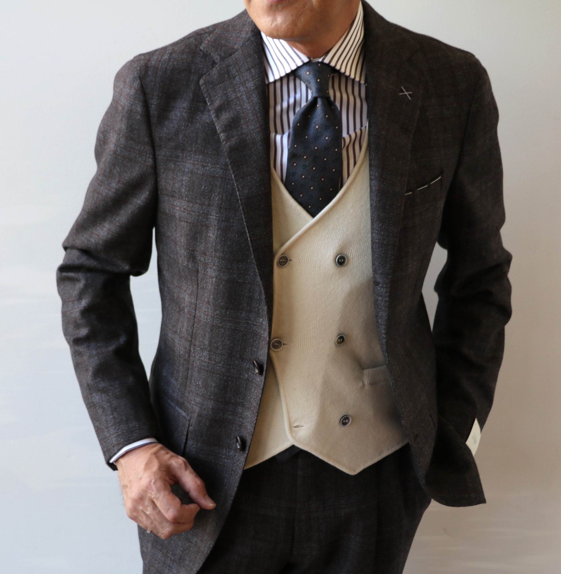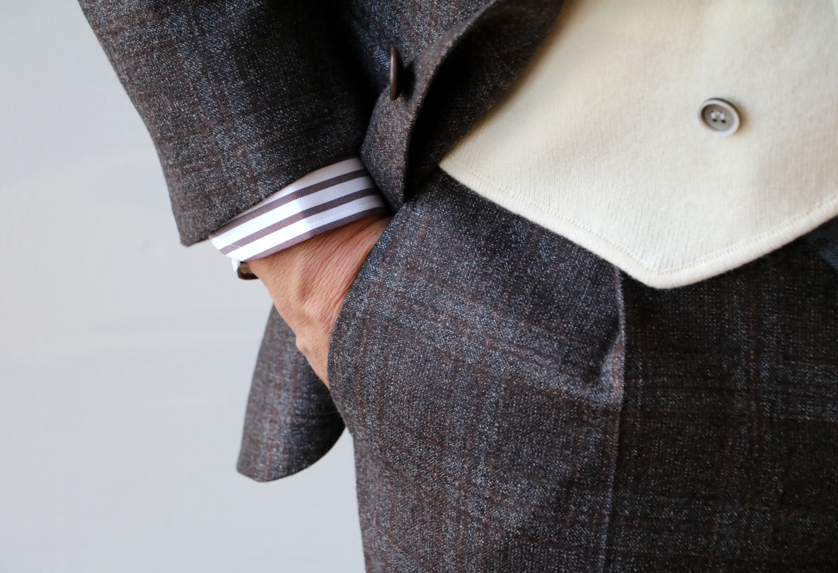 ブラウンとグレイの絶妙なチェック柄。ブラウンにするか、グレイにするか?なんて、またまた安易にニットを合わせることを考えています。色を拾ってシンプルに合わせたいスーツです。柄も目立たないので、タイドアップも決して難しくはありません。