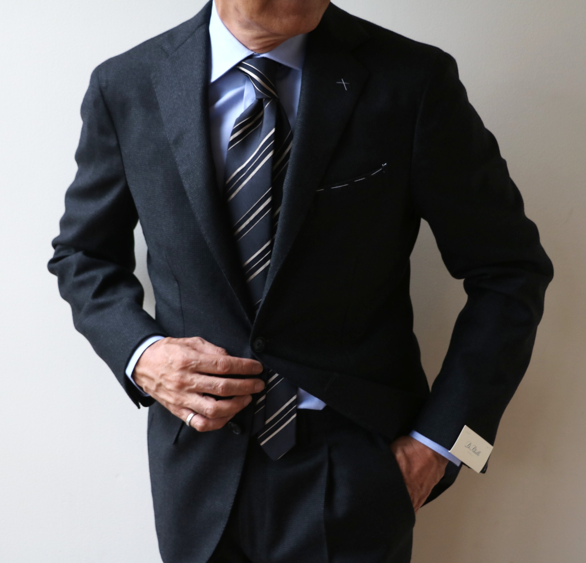 Azzuro(アズッロ/アズーロ)に対抗して?ご用意したのが、Grigio fumo(グリージョ・フーモ)、チャコールグレイのスーツです。今回、ベーシックでありながら、輝いてる生地が多すぎて、絞り込むのが大変でした。毎回のことですが、展示会に臨む際、自分のクローゼットが空っぽの状態を想像して、一つひとつワードローブに揃えていくことを意識してのバイニング。昨日ご案内させていただいたスーツ4着に、今日の2着が揃えば、最強のオトコを演じることができるはずです。