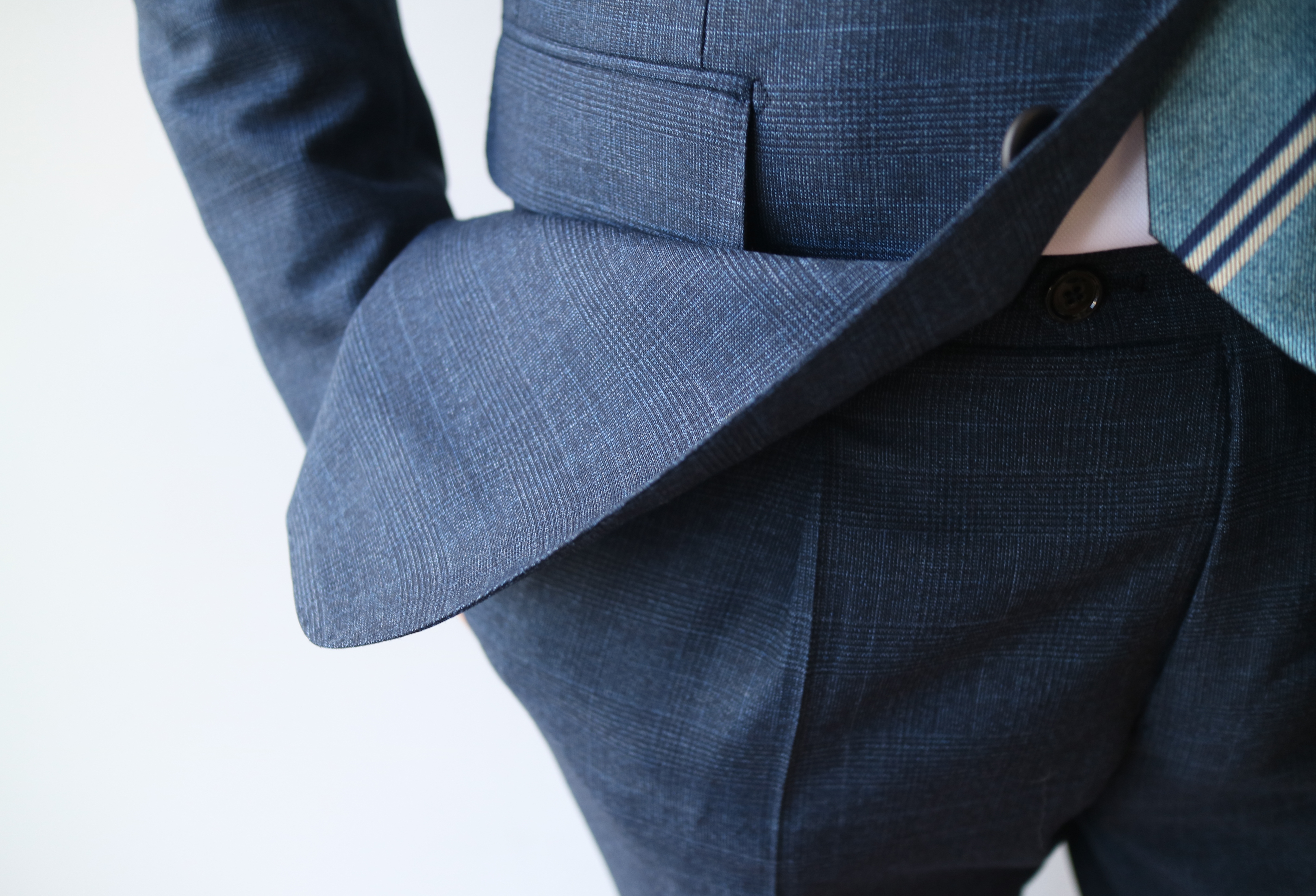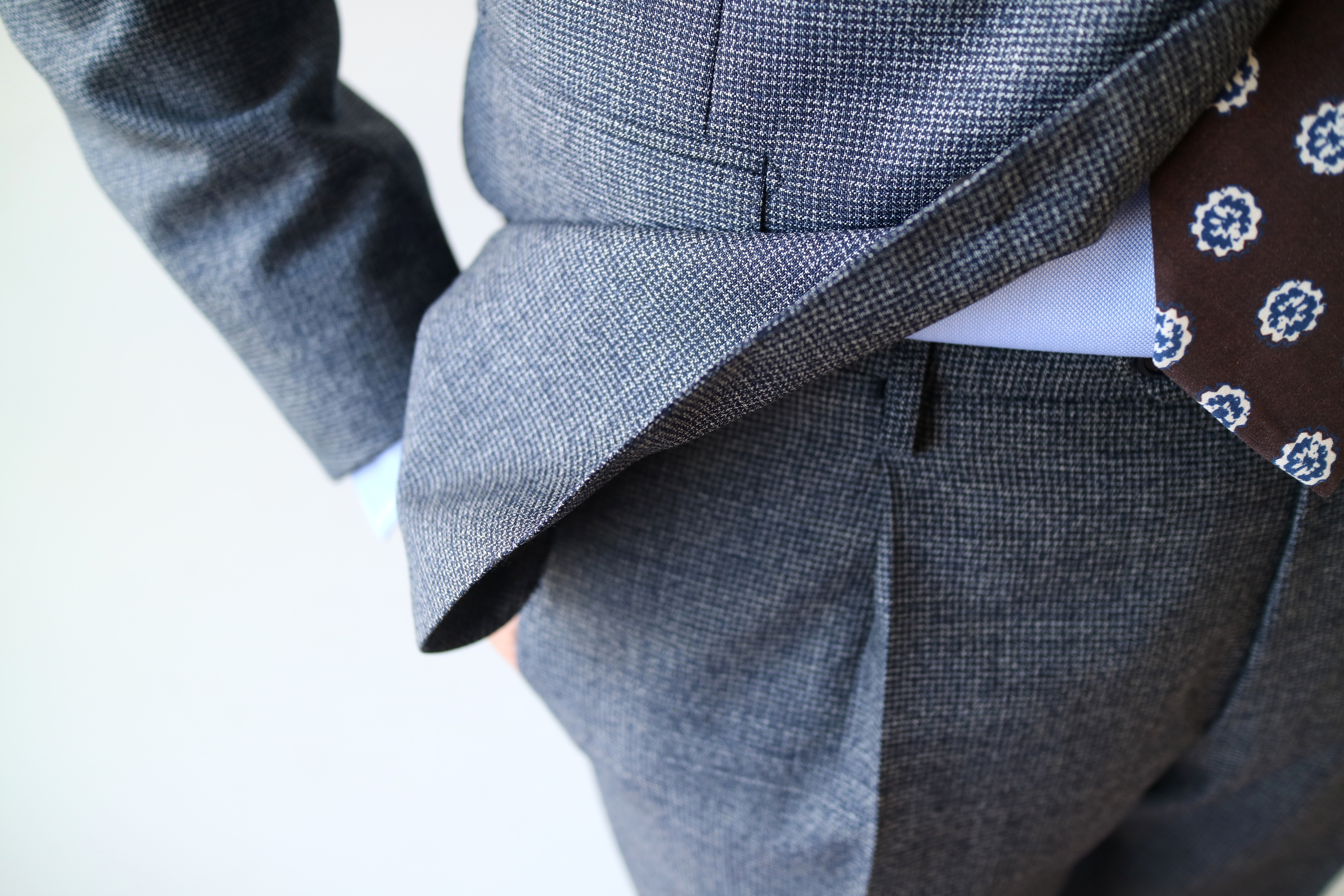こちらも青です。ウール100%のハウンドトゥース柄。でも色柄の強弱は控えめで、全体には柔らかな小柄に見えます。白黒のハウンドトゥース柄とはまた一味も二味も異なる若々しい雰囲気をもったスーツです。